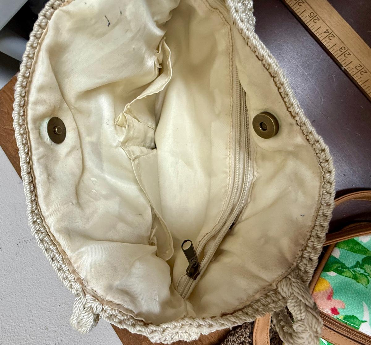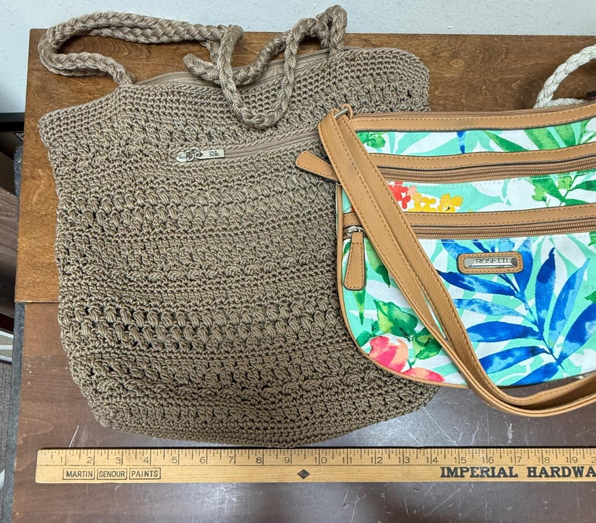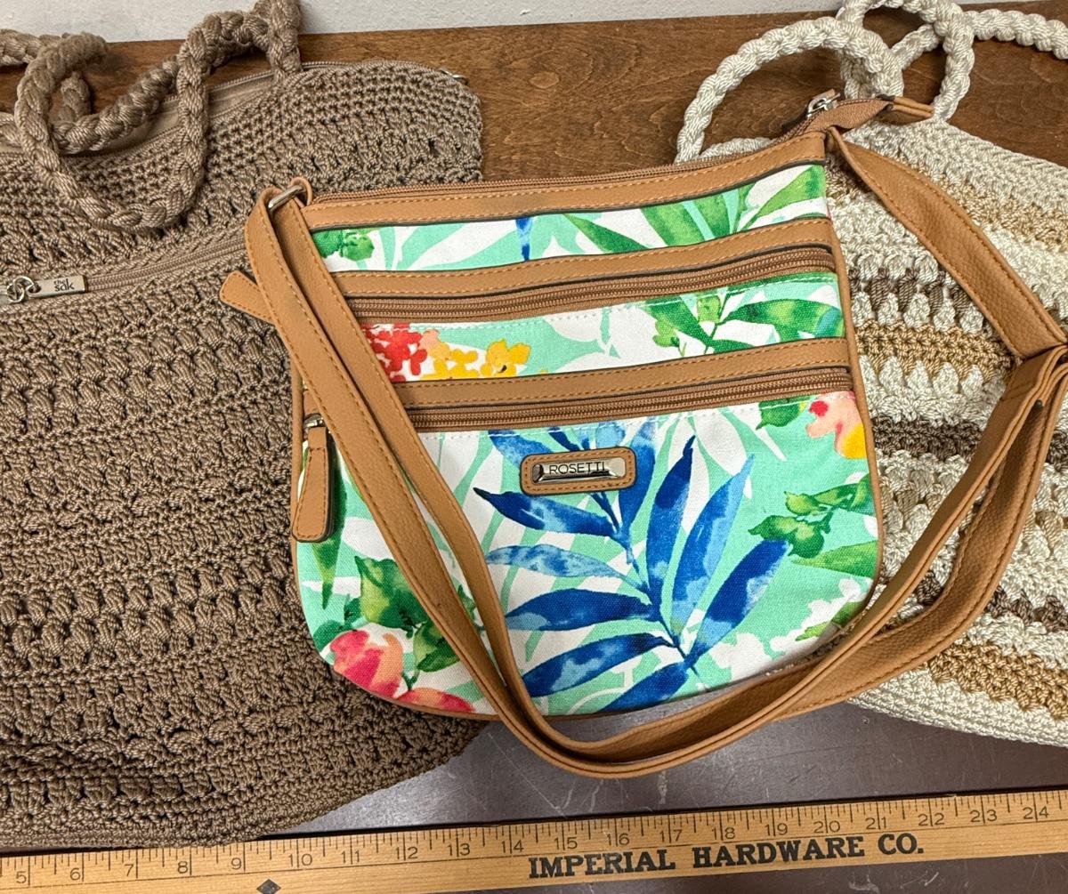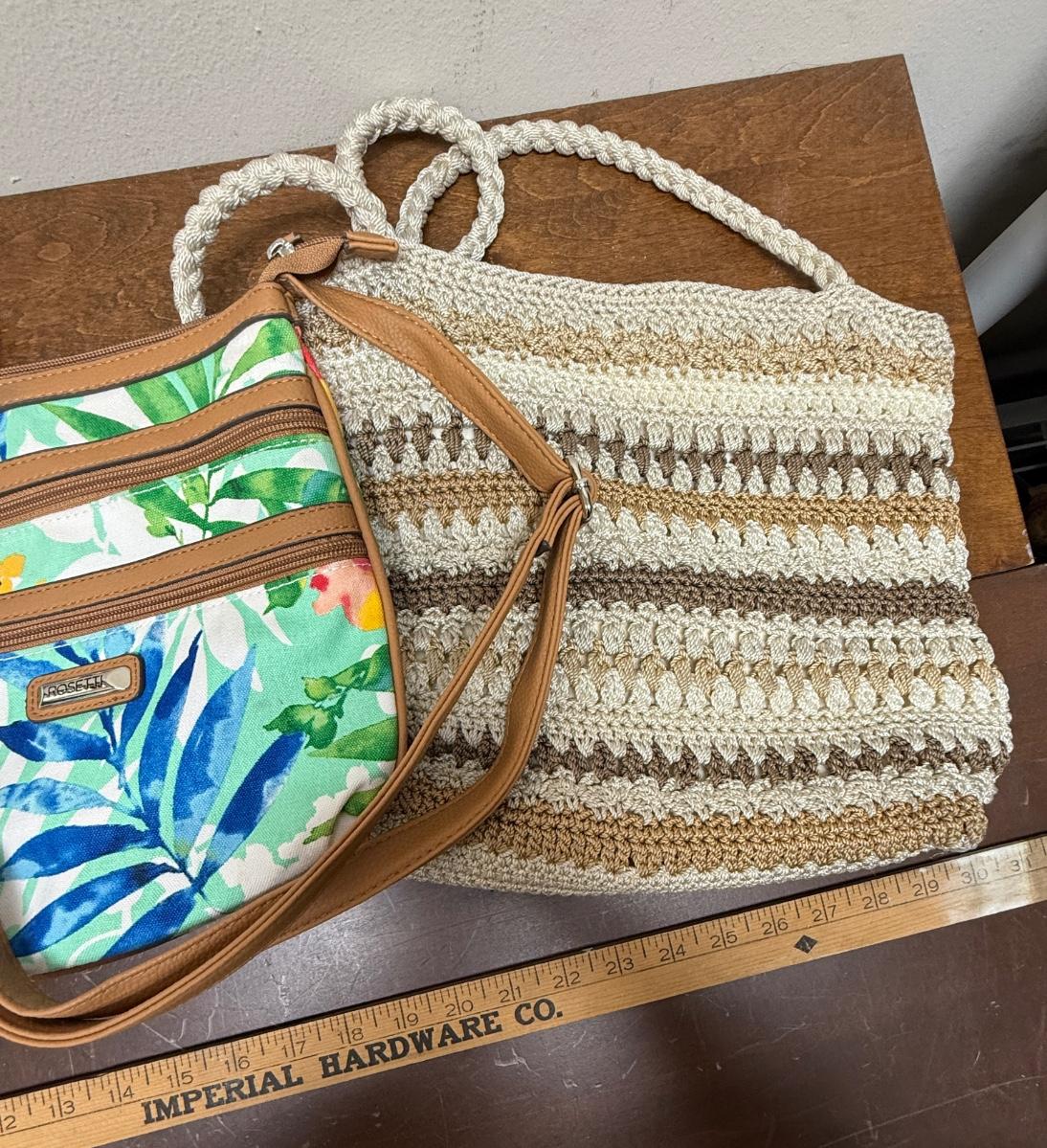 Crocheted bag by The San and Hawaiian print with faux leather by Rosetti in good used condition.