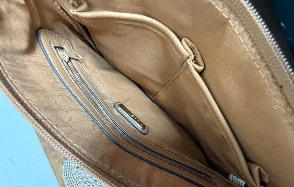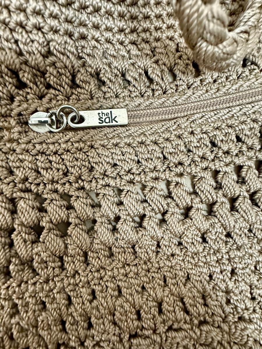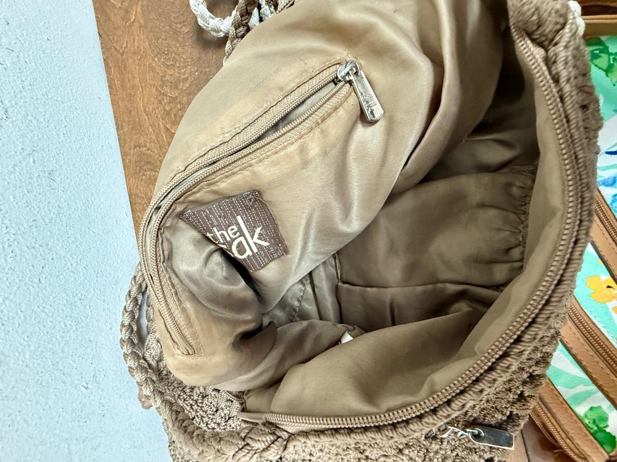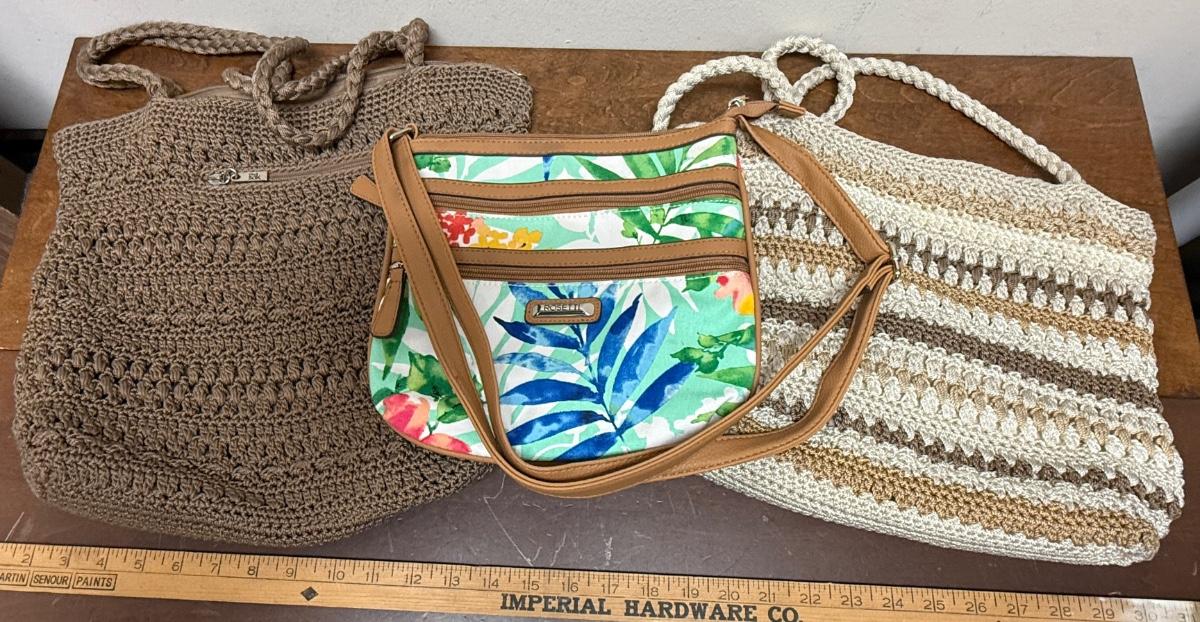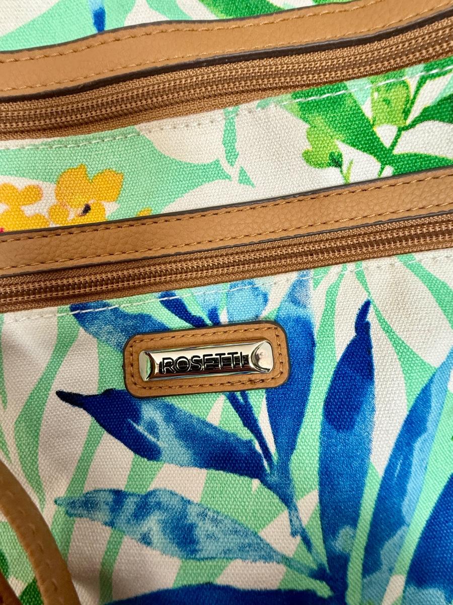 Crocheted bag by The San and Hawaiian print with faux leather by Rosetti in good used condition.