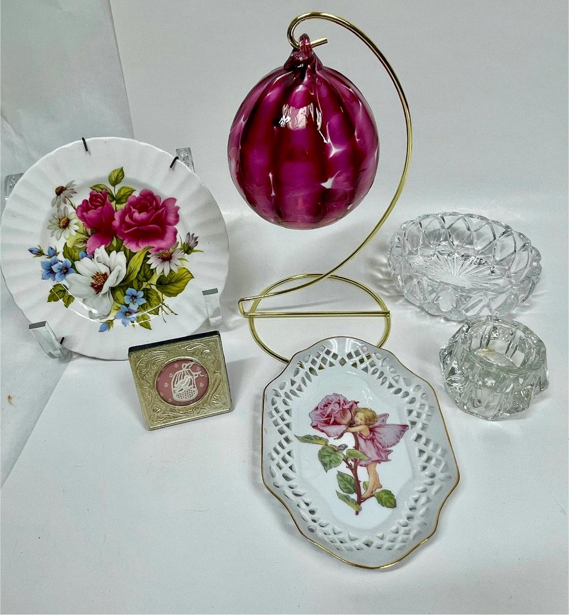 Blown glass ornament, small frame, small plate, small dish, candle holder (stands not included)