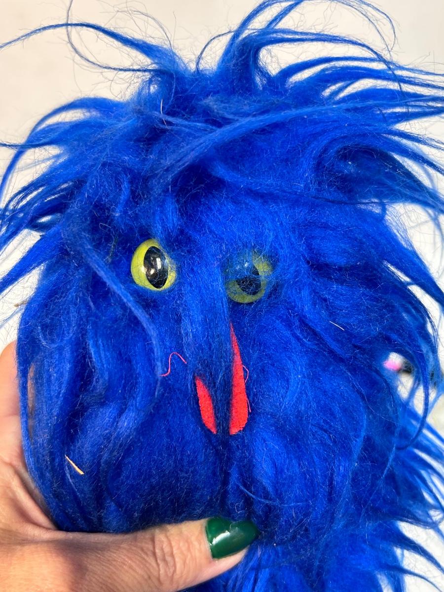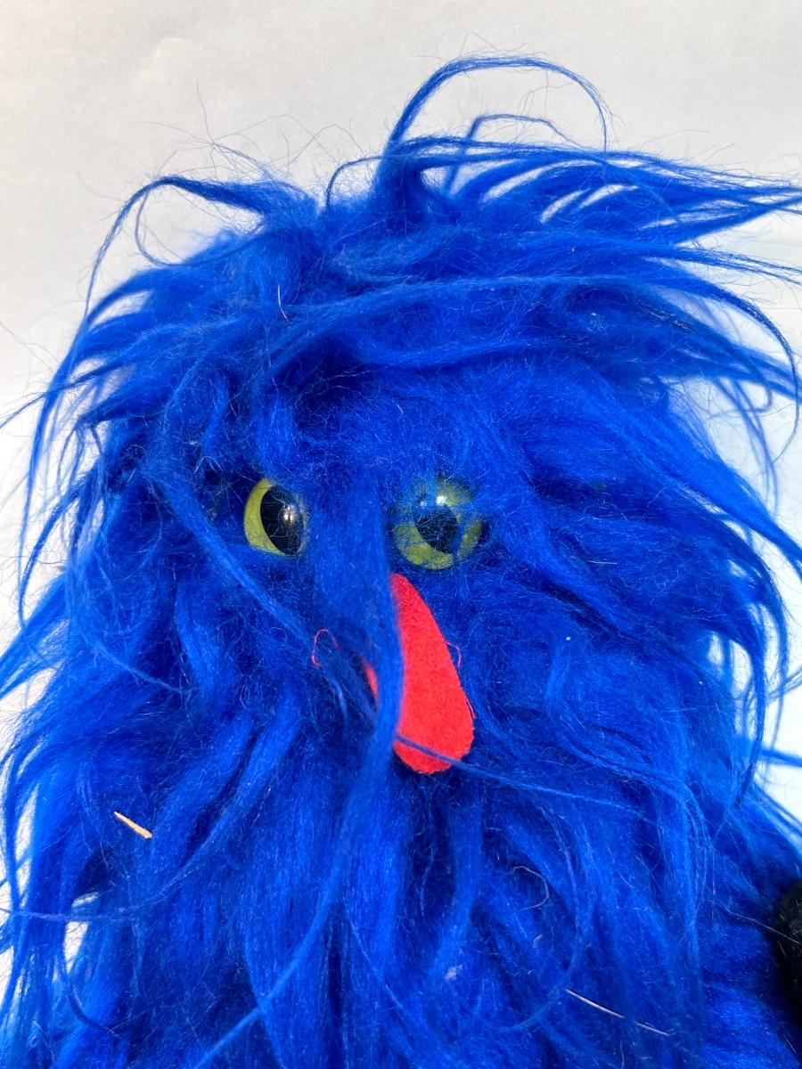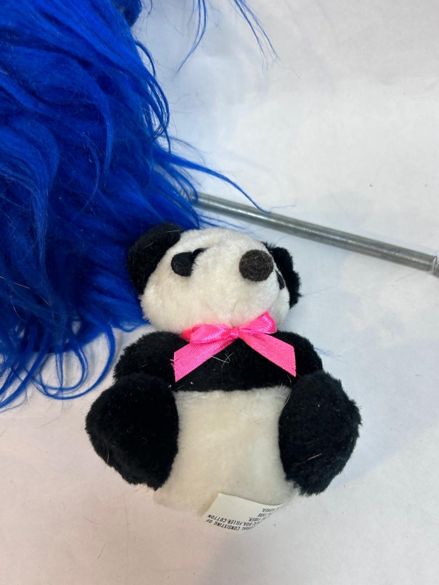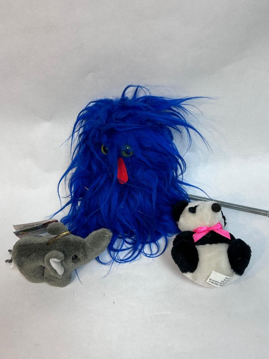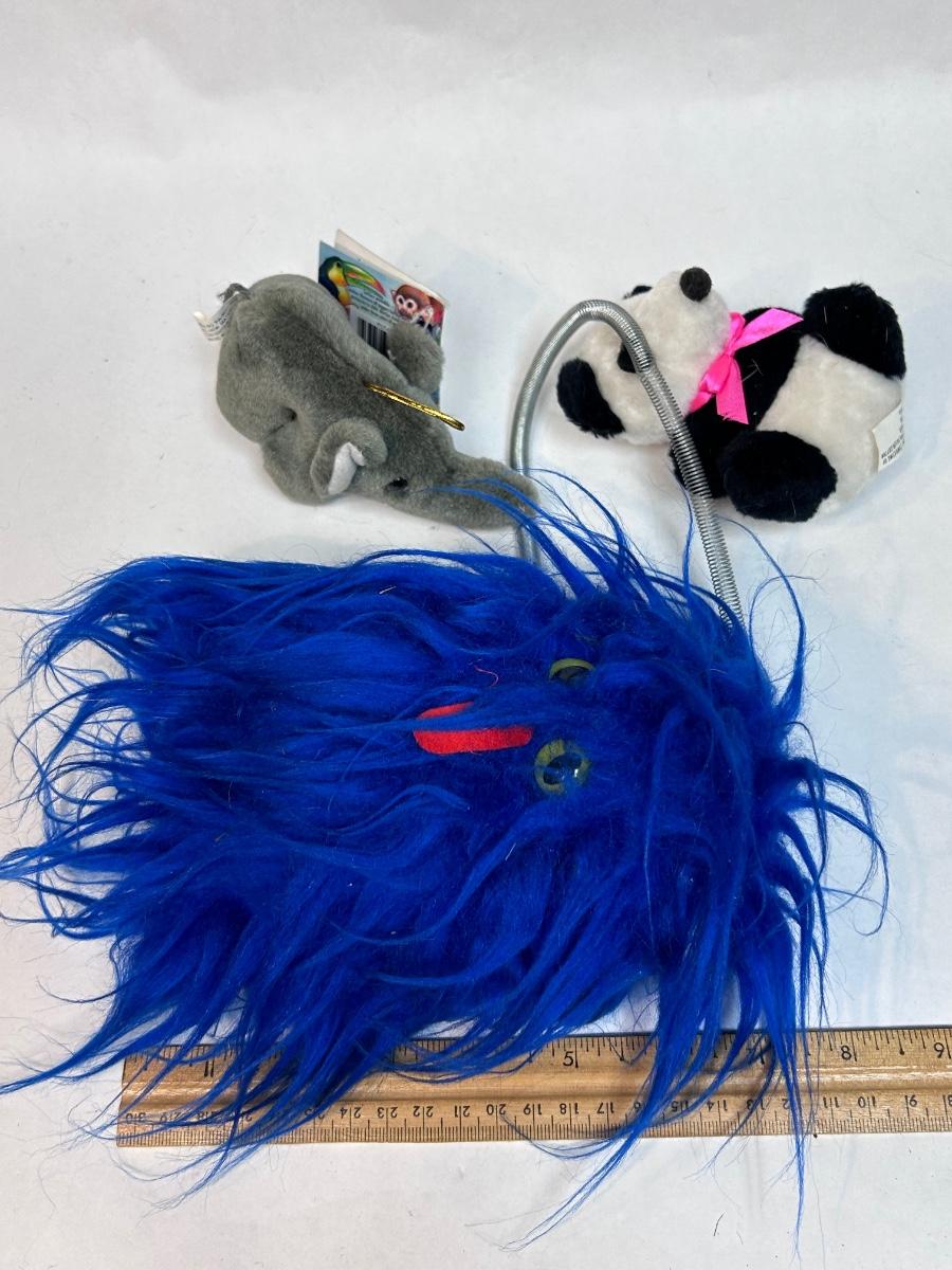 Mixed Plush Lot Small Elephant Panda Bear and Crazy Blue Hair Monster. The blue hair monster has a battery box inside, not sure what he does or says, untested.