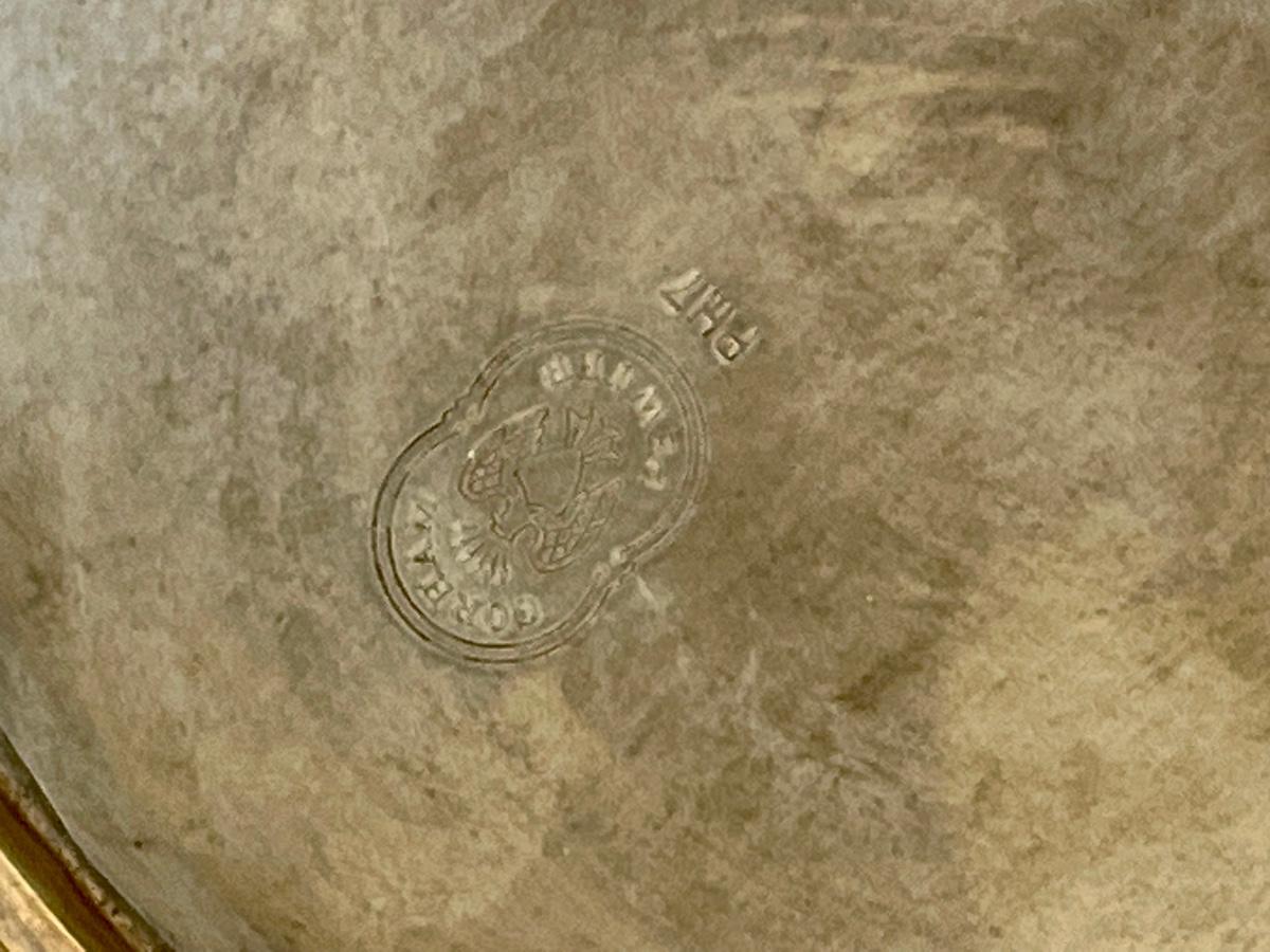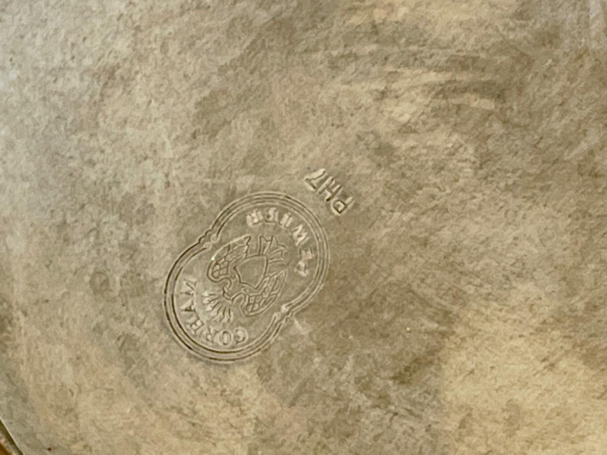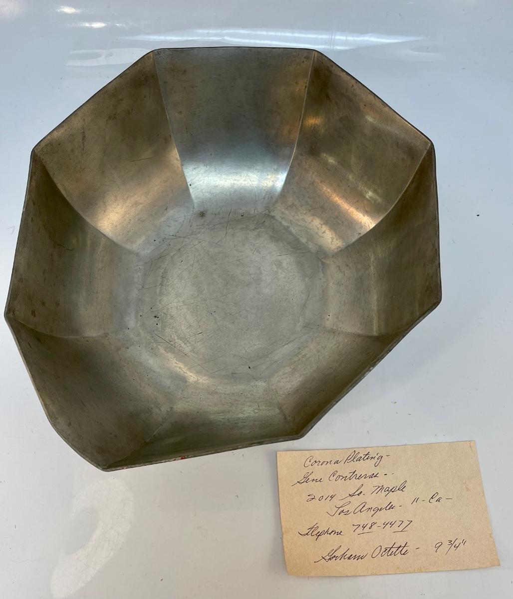 This bowl has had some type of accident that caused it to become distorted. There was a note about a plating company inside the bowl.