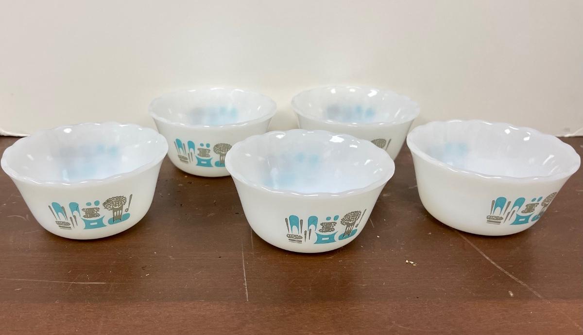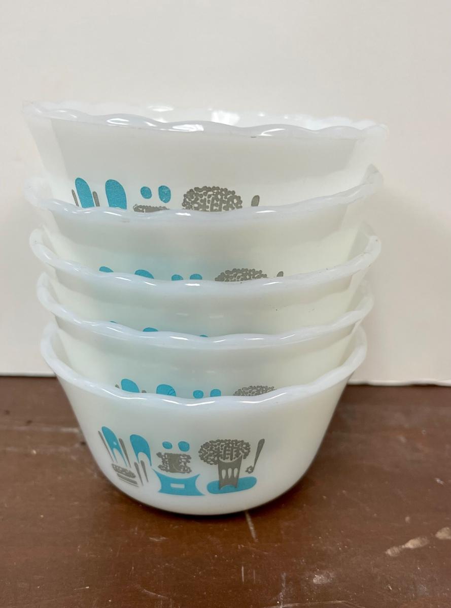 Vintage Atomic Fire King Blue Heaven Custard Cup Fruit Dessert Bowl. Set of 5. In good vintage condition, very little wear.