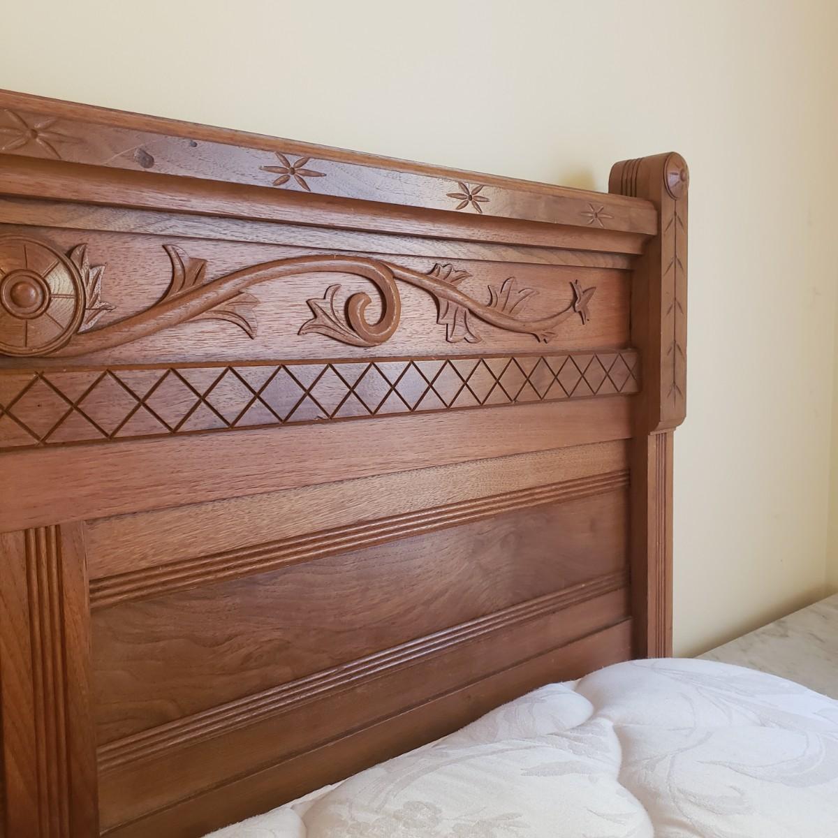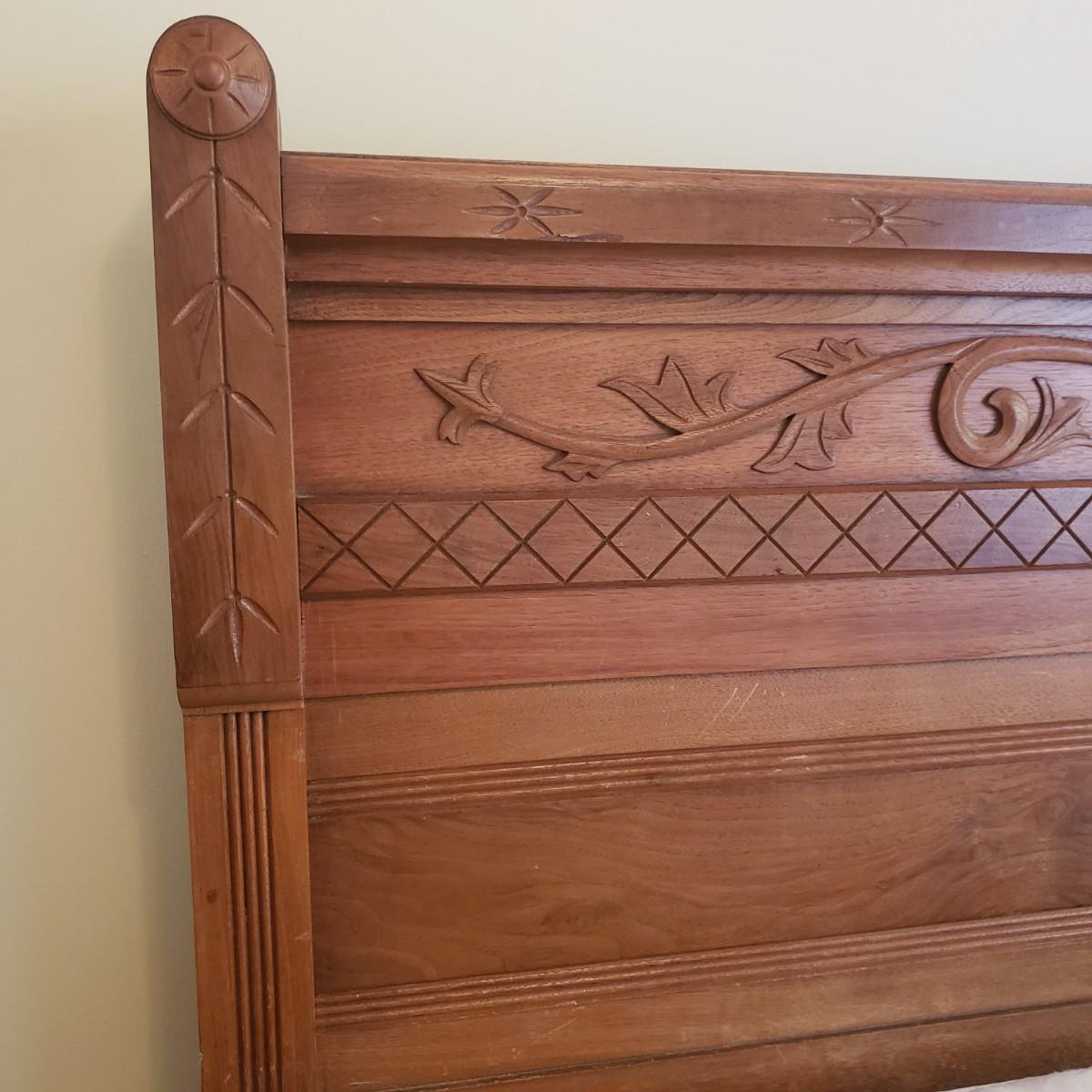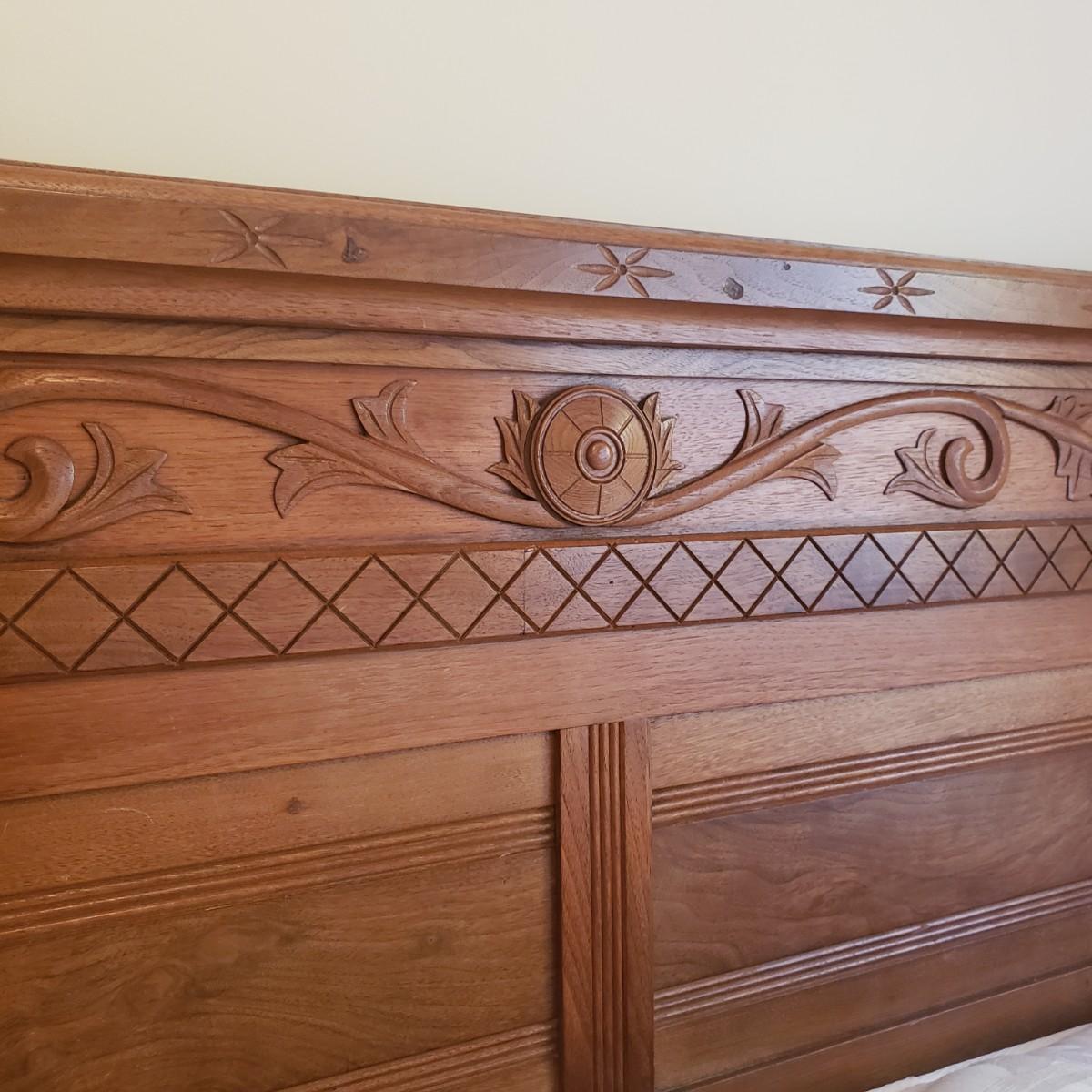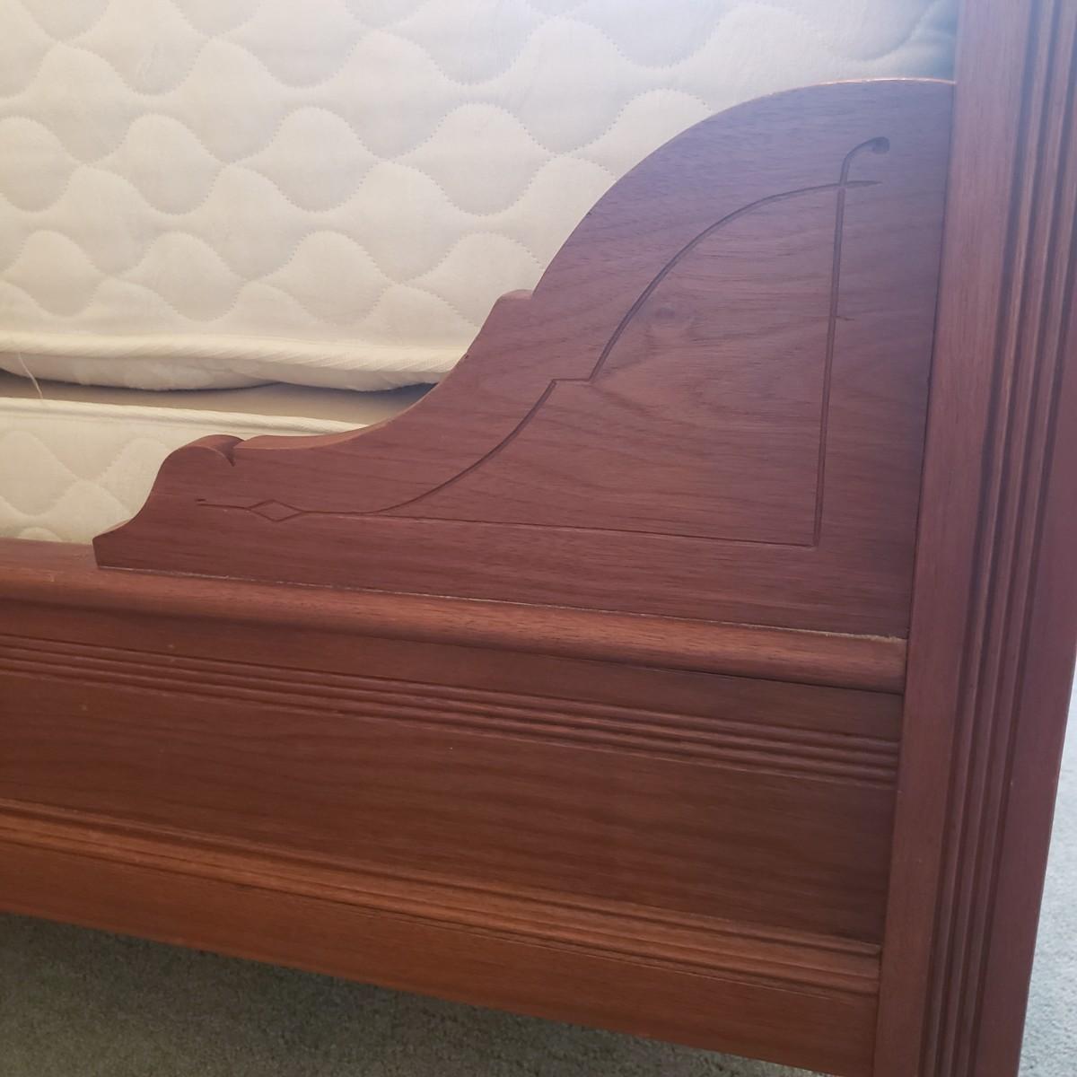 This TG Buckley bedframe and Sealy mattress measures 63" x 78" x 49"H at the headboard. The footboard is 32"H. The bed is on four wheels. The ornate headboard and footboard are true craftsmanship. The slats are easily removed and the bed rails hook out at each corner, this may be hard to see in the pictures. There is one corner piece that needs gluing back into place, see picture. This bed matches a dresser and mirror lot, as well as a side table lot!