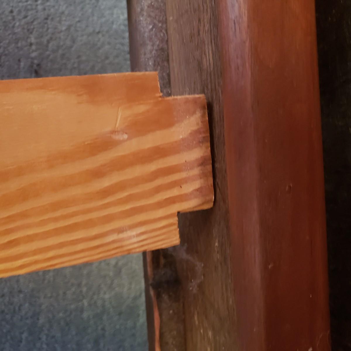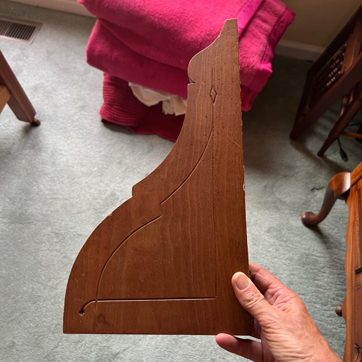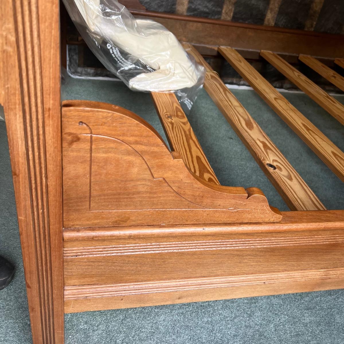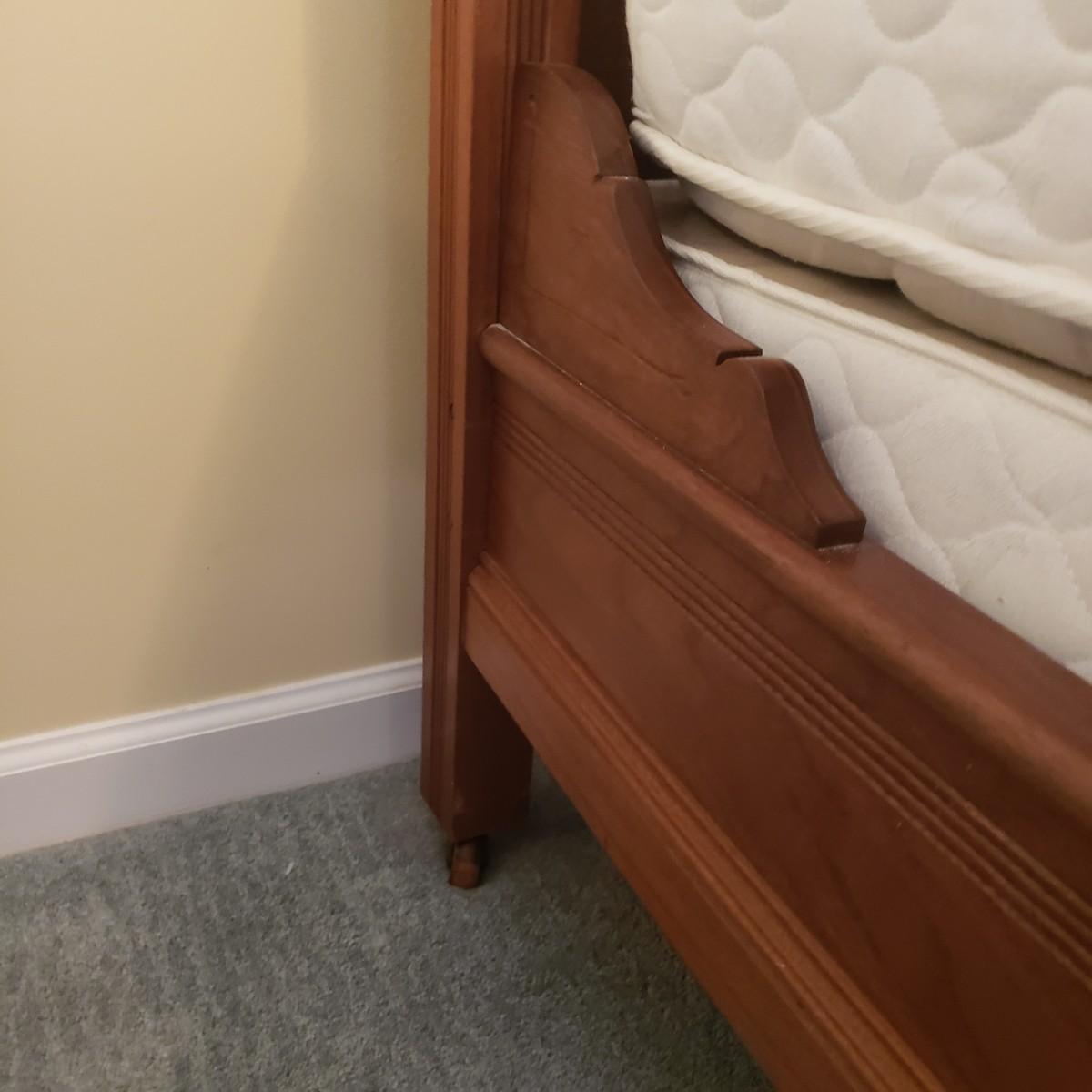 This TG Buckley bedframe and Sealy mattress measures 63" x 78" x 49"H at the headboard. The footboard is 32"H. The bed is on four wheels. The ornate headboard and footboard are true craftsmanship. The slats are easily removed and the bed rails hook out at each corner, this may be hard to see in the pictures. There is one corner piece that needs gluing back into place, see picture. This bed matches a dresser and mirror lot, as well as a side table lot!
