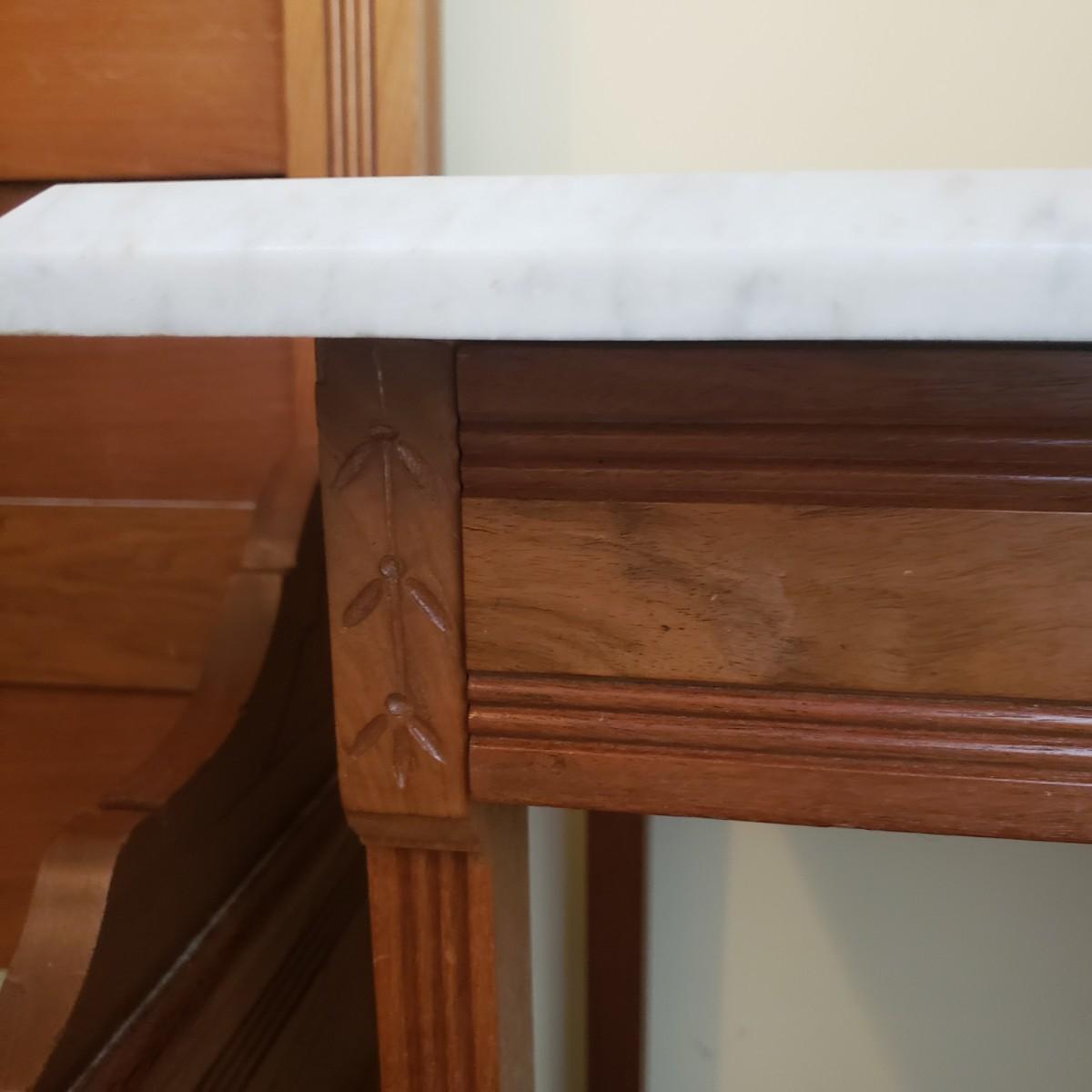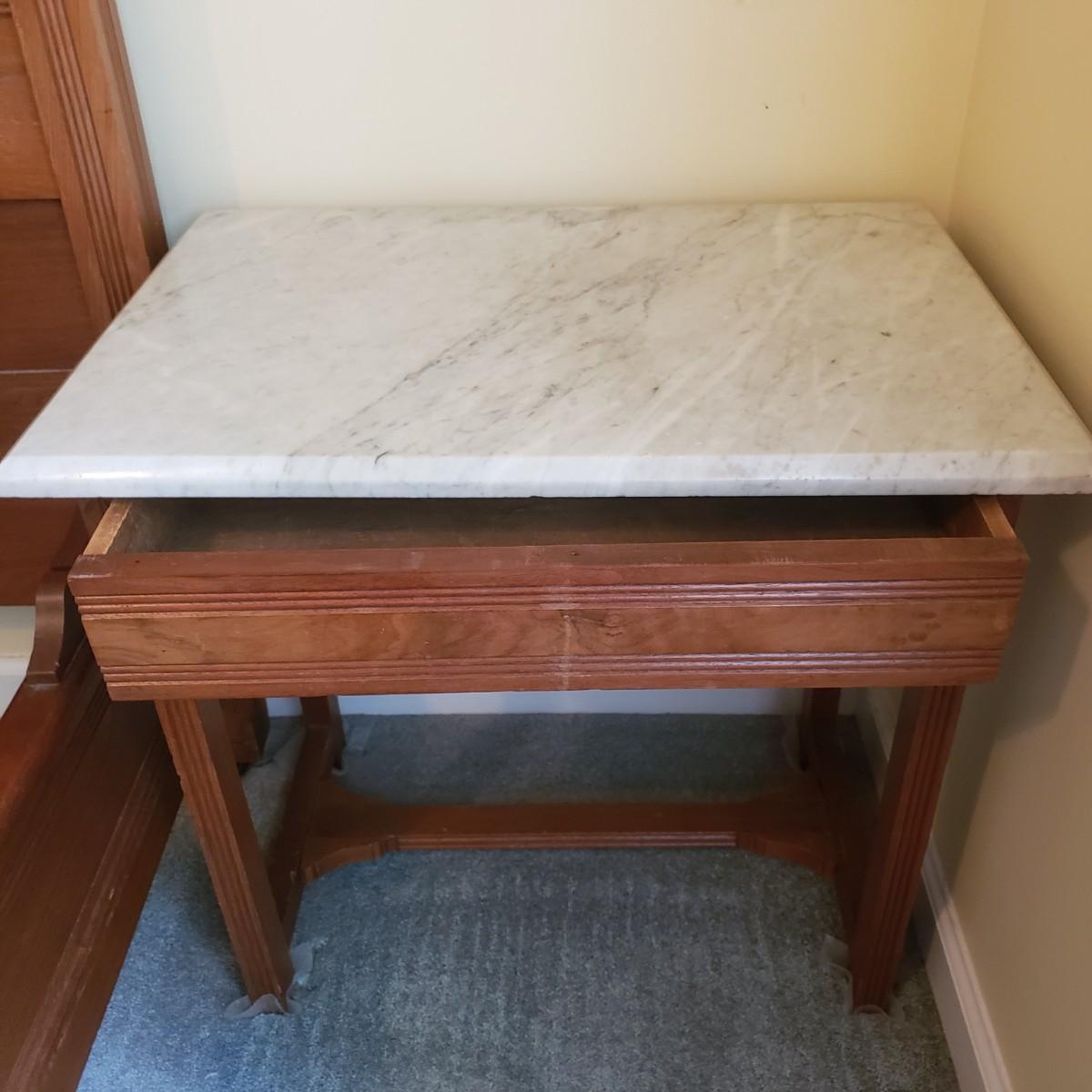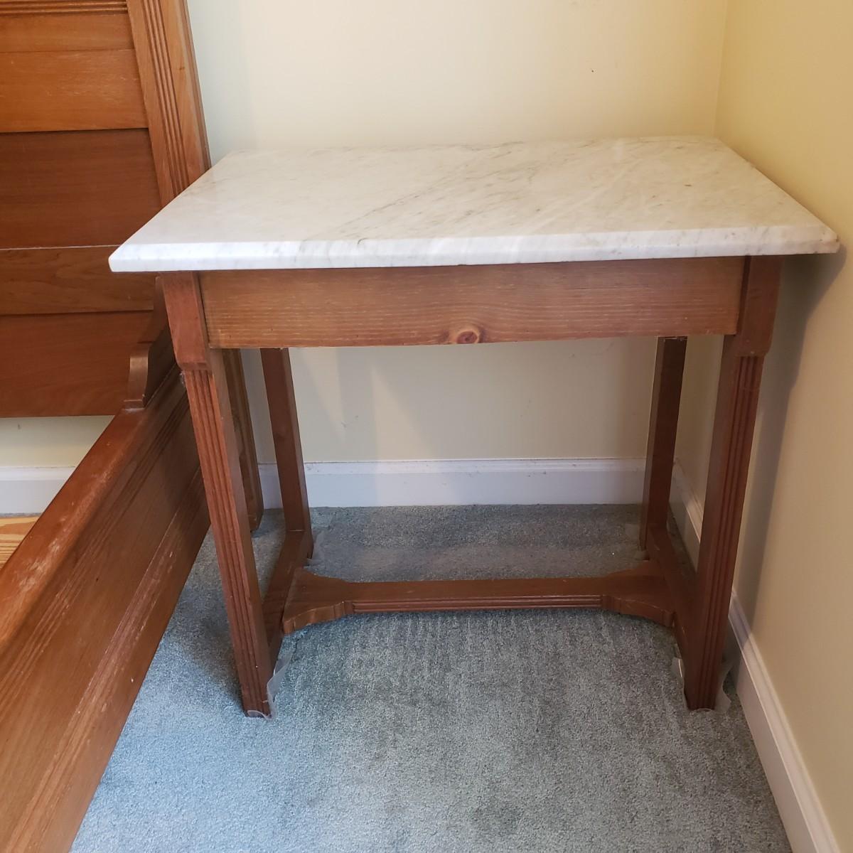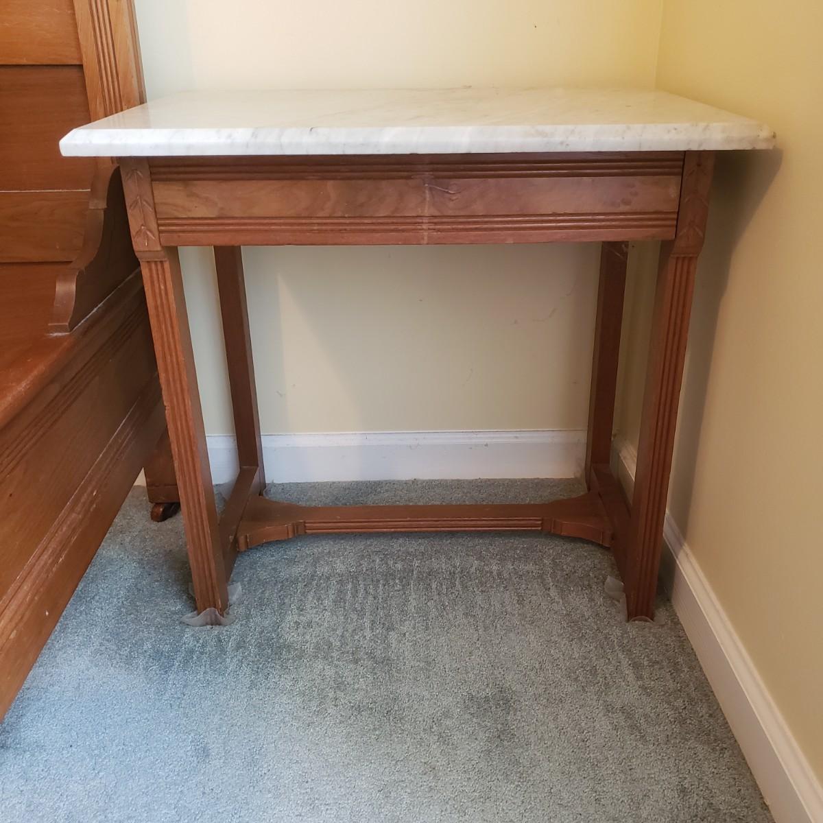 This possible TG Buckley marble top side table measures 24" x 16" x 23"H. This side table matches the bed, dresser and mirror in other lots in this sale! The table has a drawer. There appears to be no markings on the table.