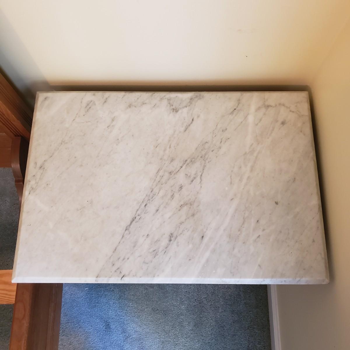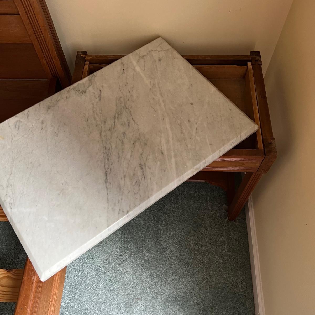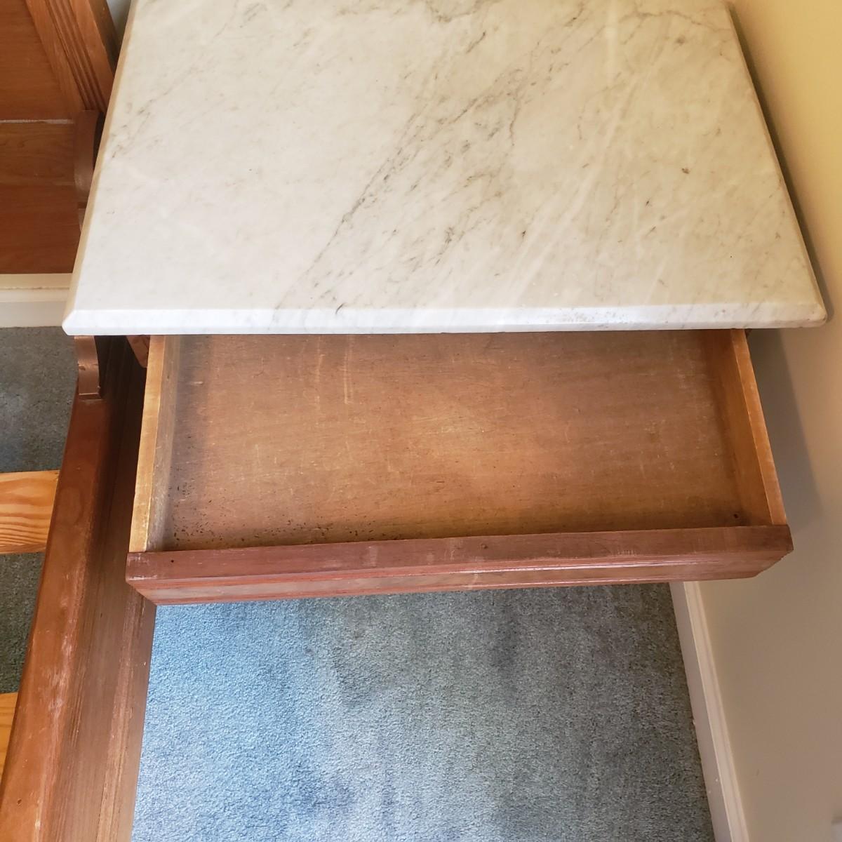 This possible TG Buckley marble top side table measures 24" x 16" x 23"H. This side table matches the bed, dresser and mirror in other lots in this sale! The table has a drawer. There appears to be no markings on the table.