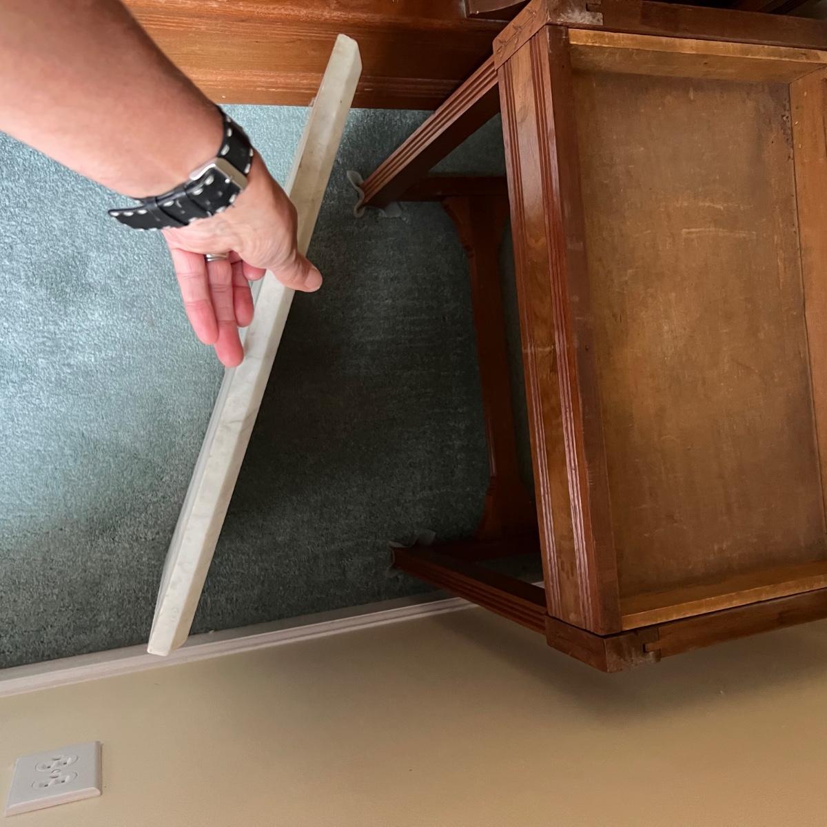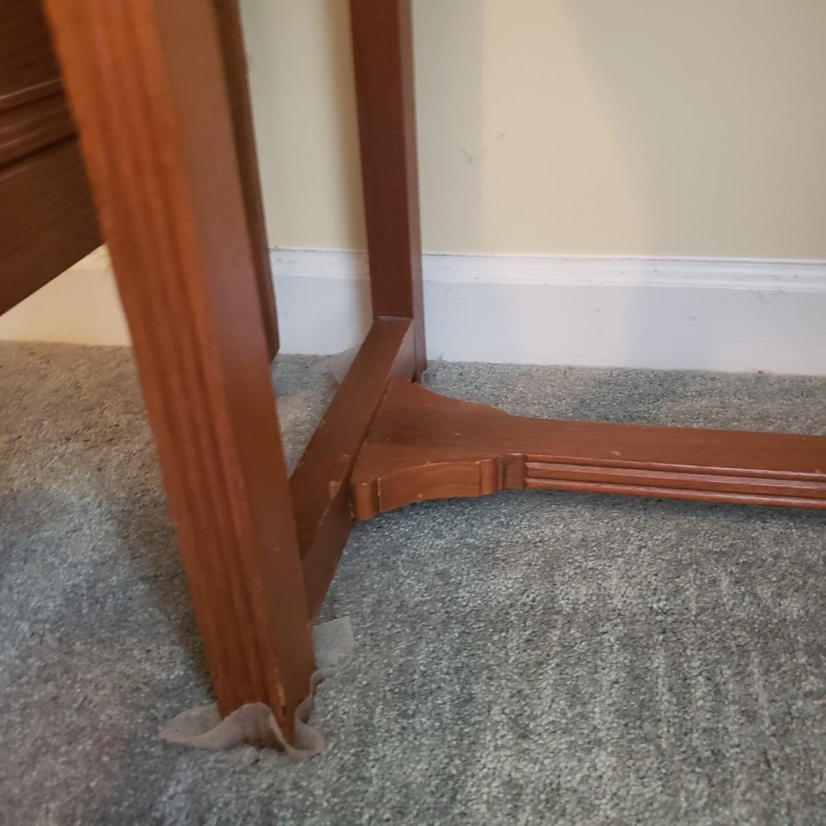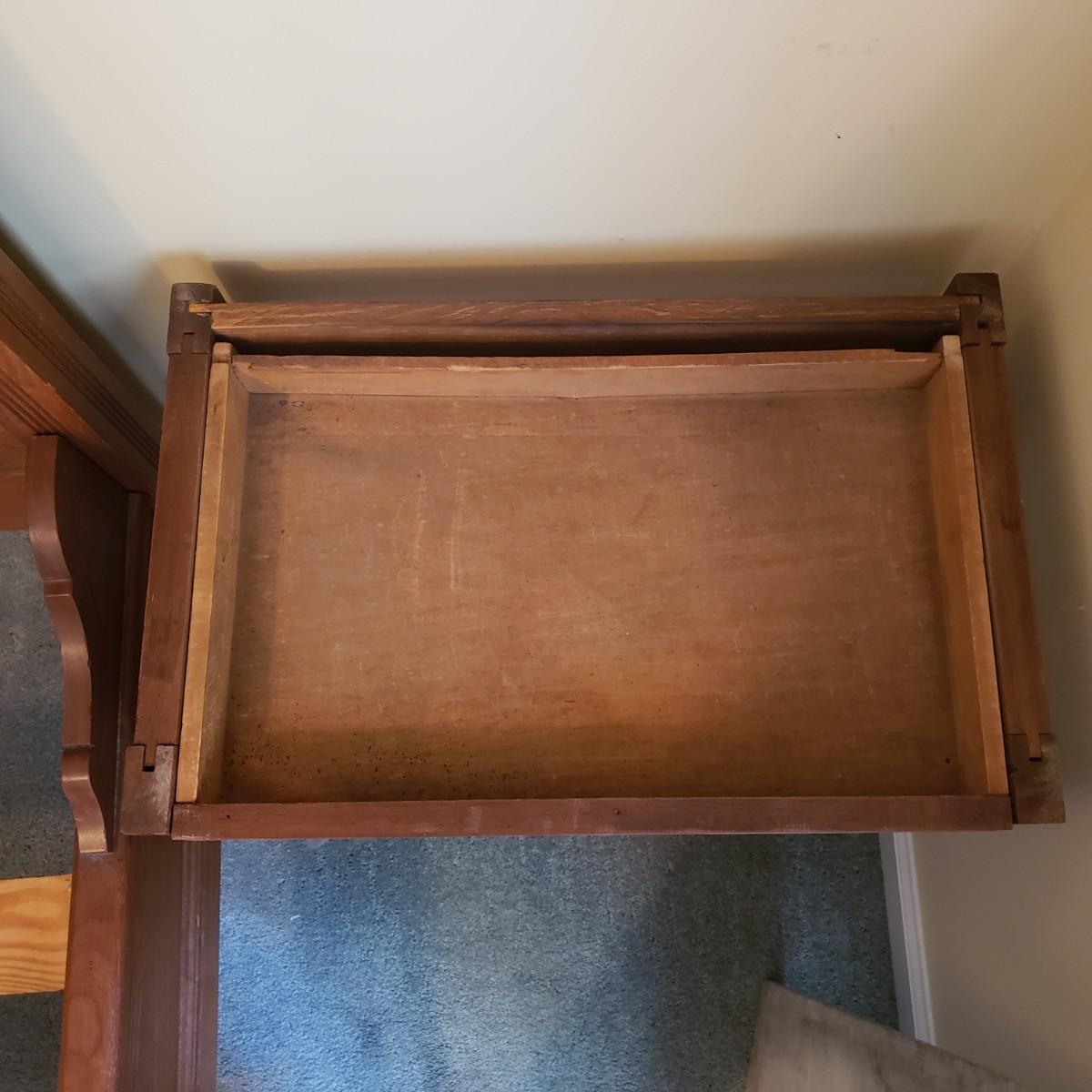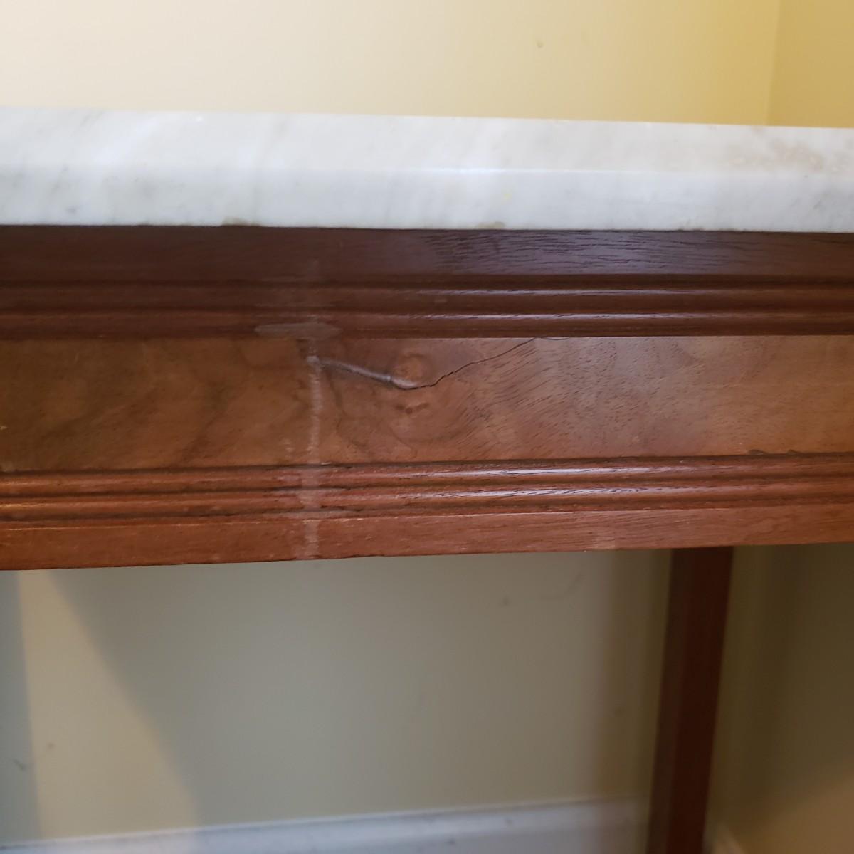 This possible TG Buckley marble top side table measures 24" x 16" x 23"H. This side table matches the bed, dresser and mirror in other lots in this sale! The table has a drawer. There appears to be no markings on the table.