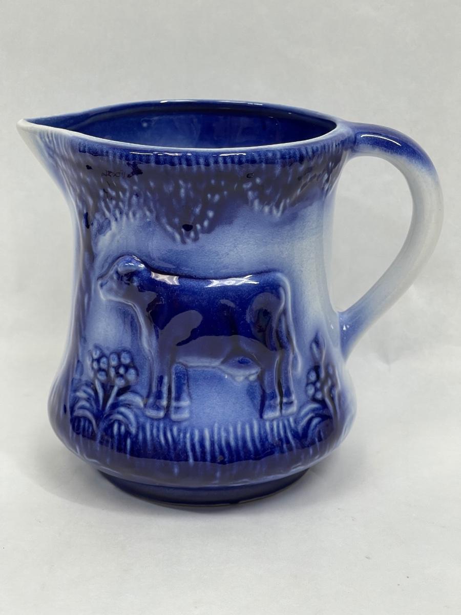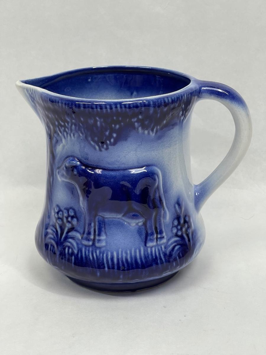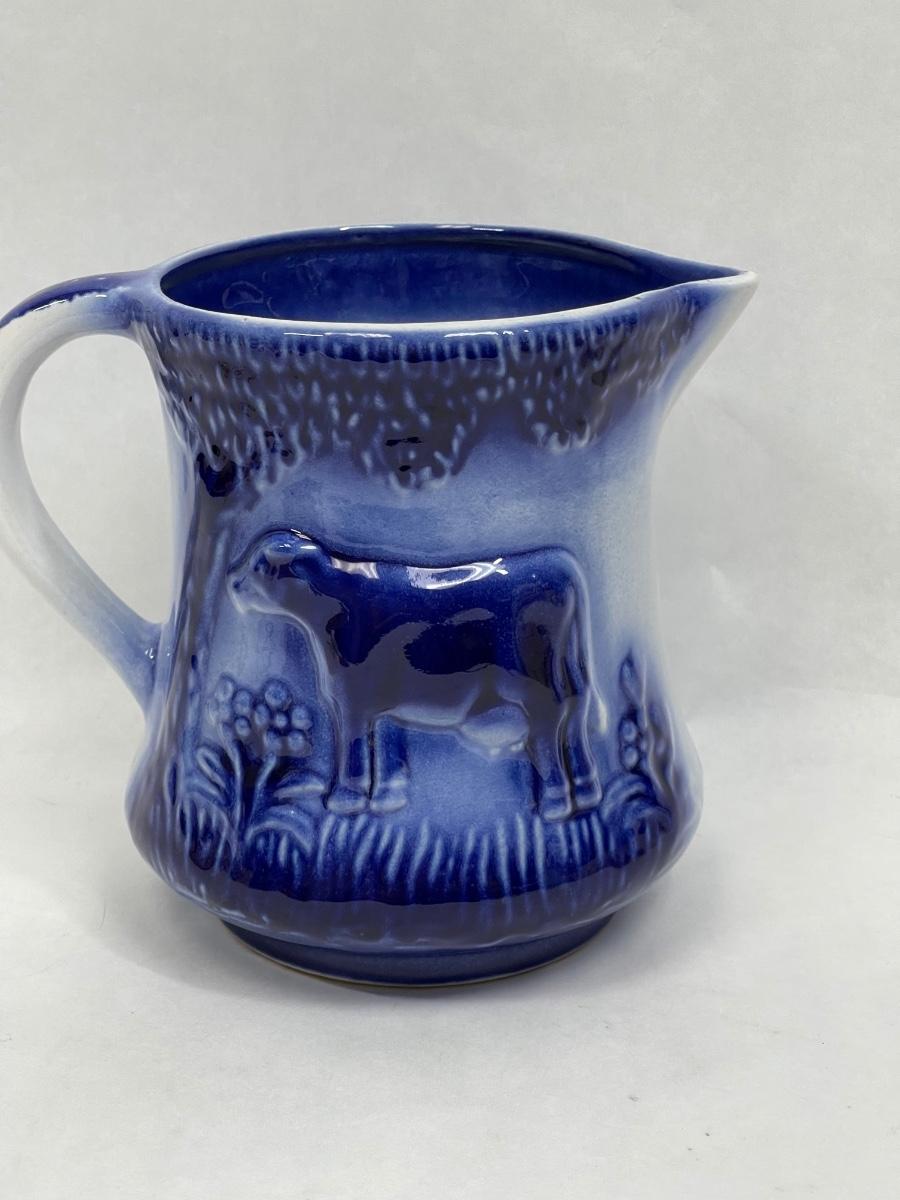 Vintage Saly Glaze Stoneware Pottery Blue White Milk PItcher Cow