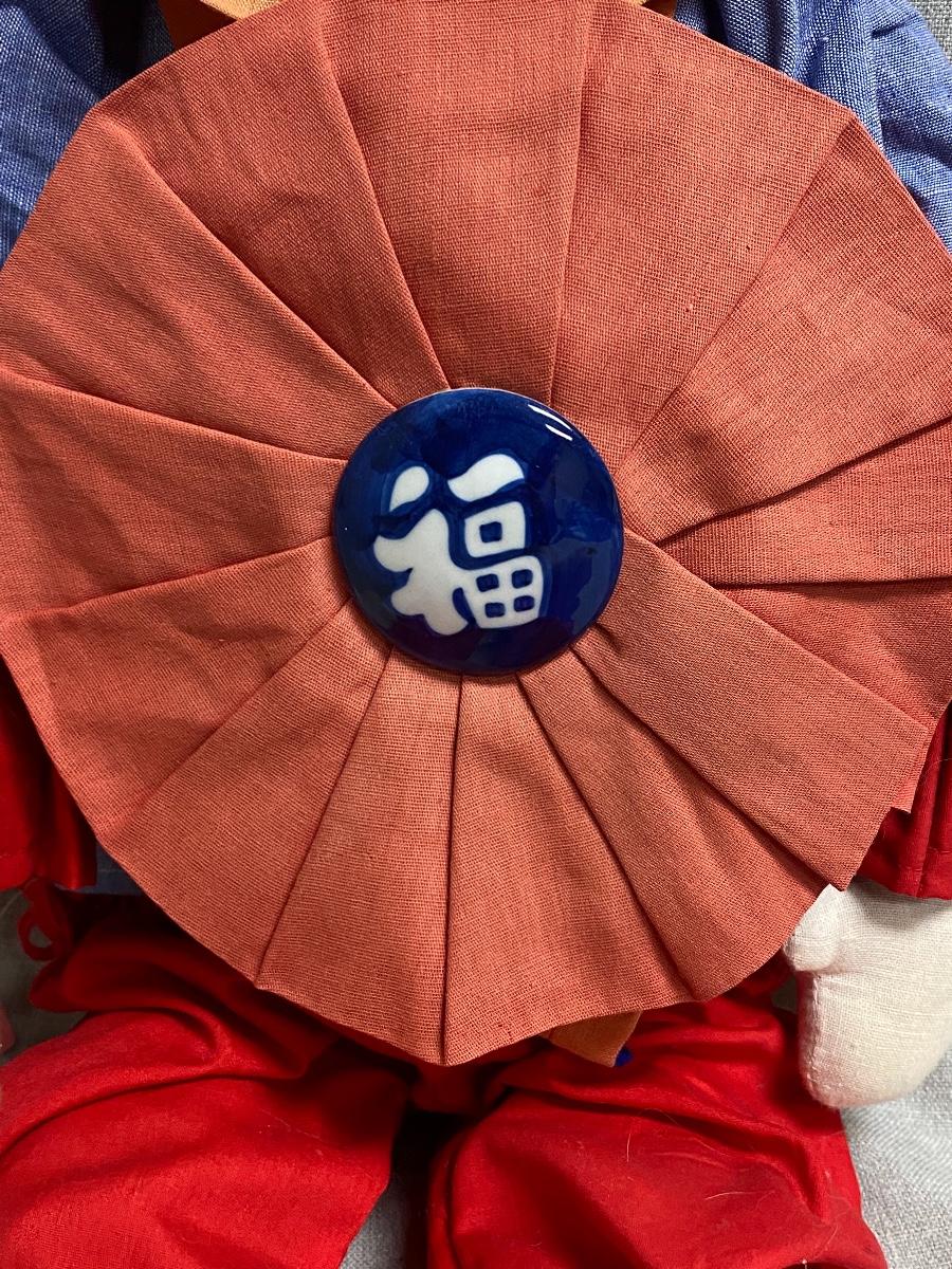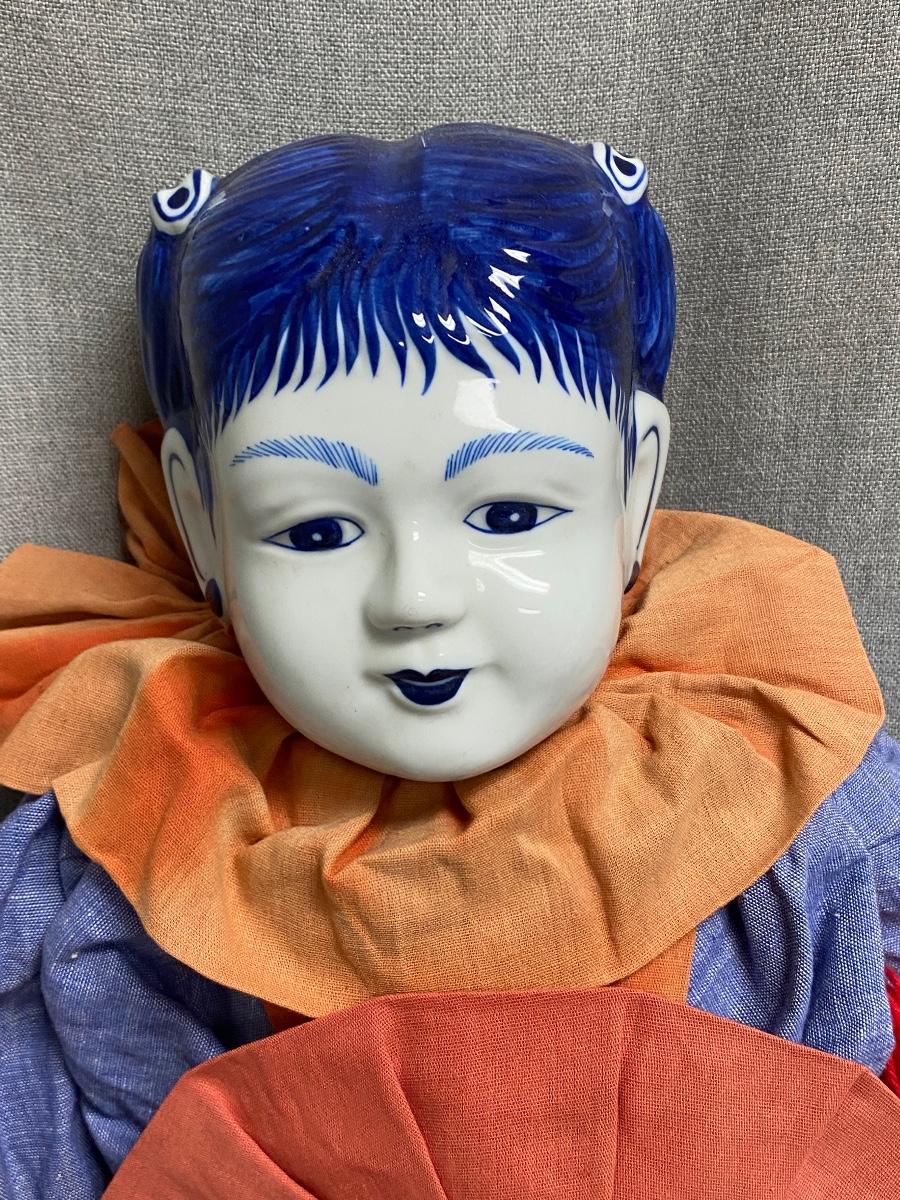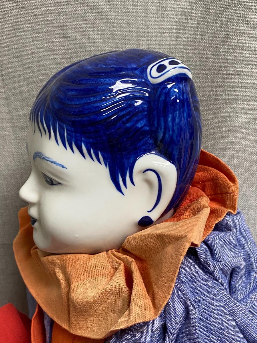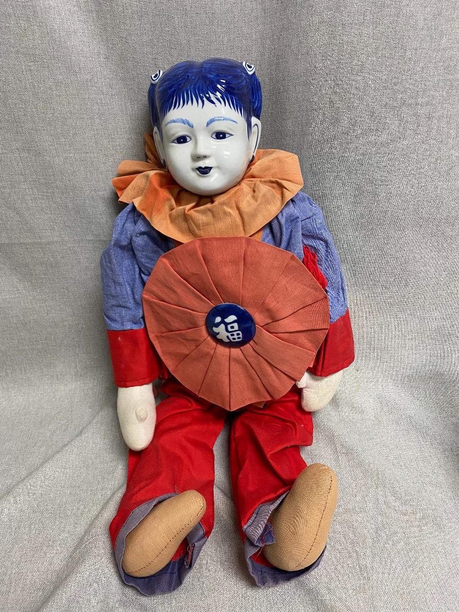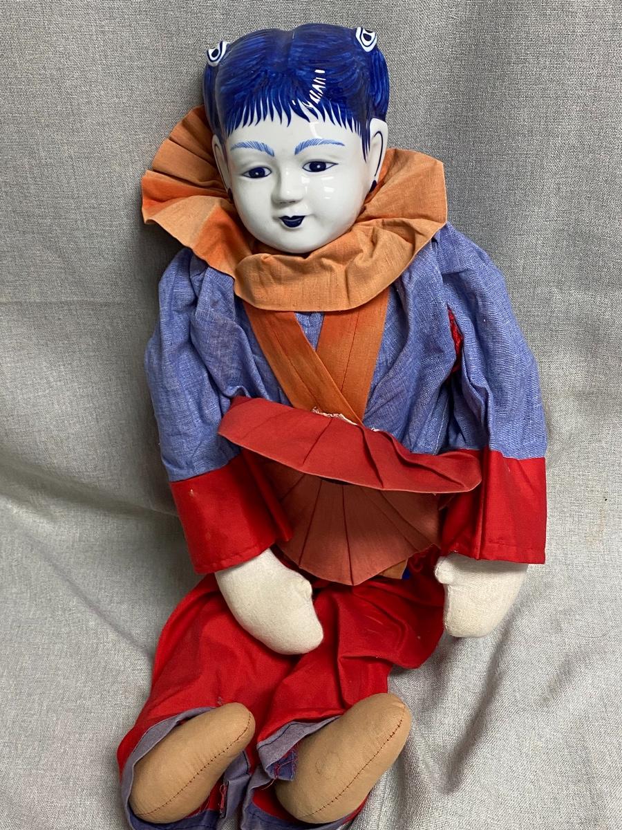 Blue & White Ceramic Asian Ethnic Jester Style Doll. In good condition. Some fade to the outfit. Head is ceramic while the rest of the body is cloth.