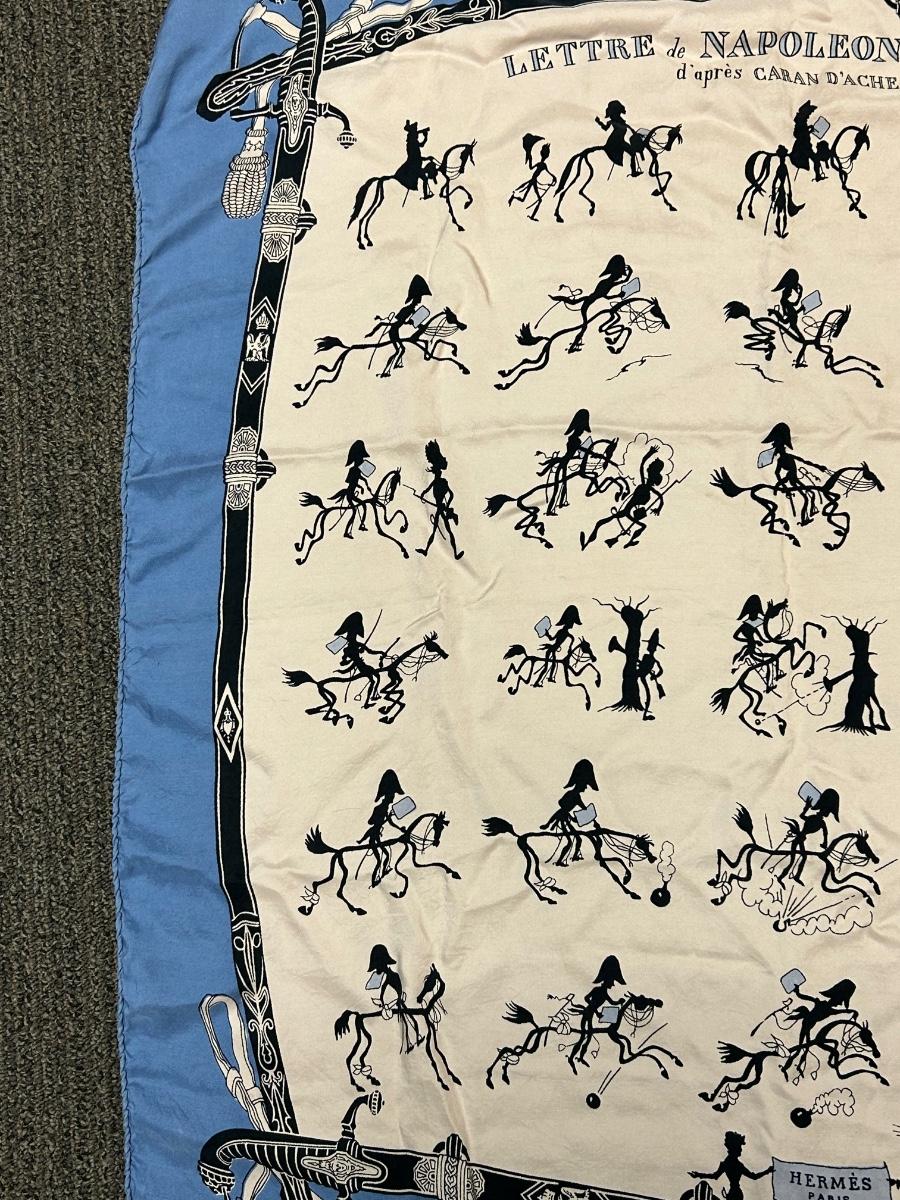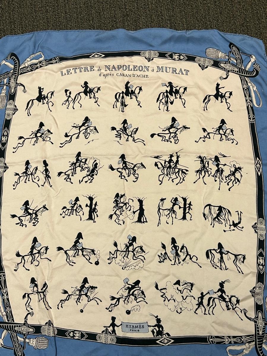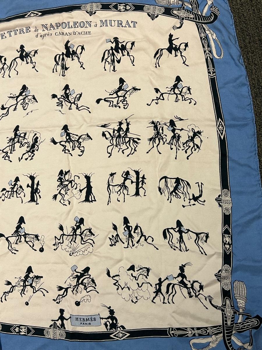 Vintage Hermes Lettre de Napoleon a Murat d'Apres Blue Edge Story Telling Silk Scarf. Vintage Hermes from the 1940s 1950s. Rare story telling pattern. No holes or stains.