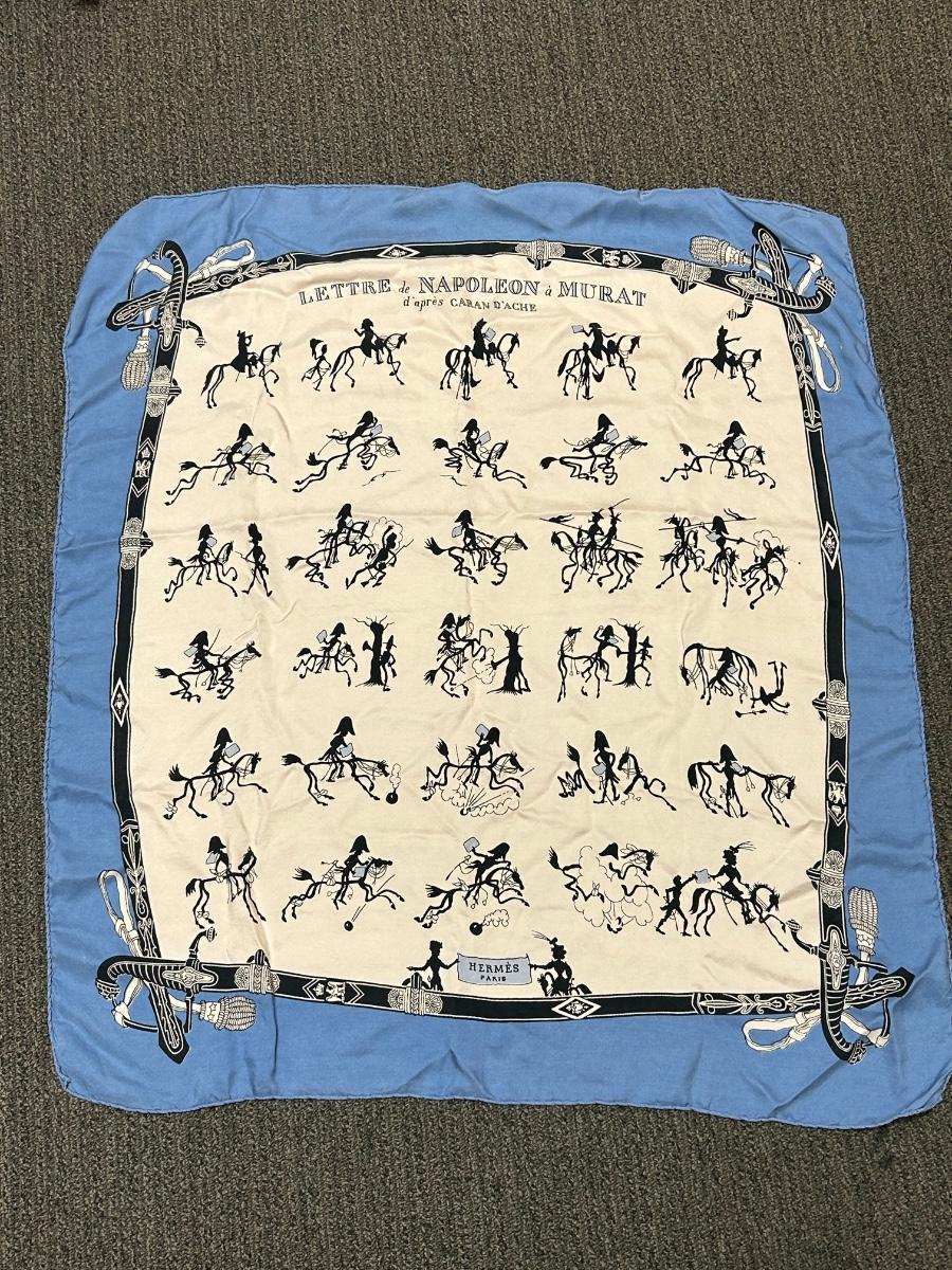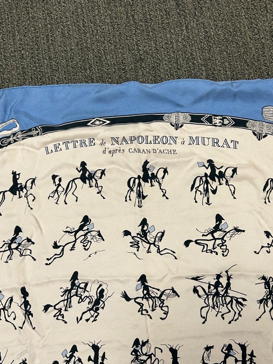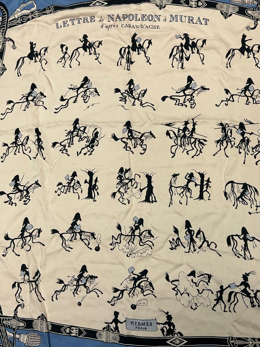 Vintage Hermes Lettre de Napoleon a Murat d'Apres Blue Edge Story Telling Silk Scarf. Vintage Hermes from the 1940s 1950s. Rare story telling pattern. No holes or stains.