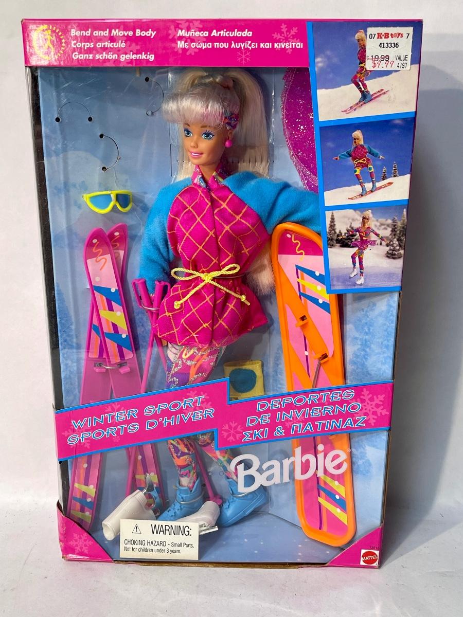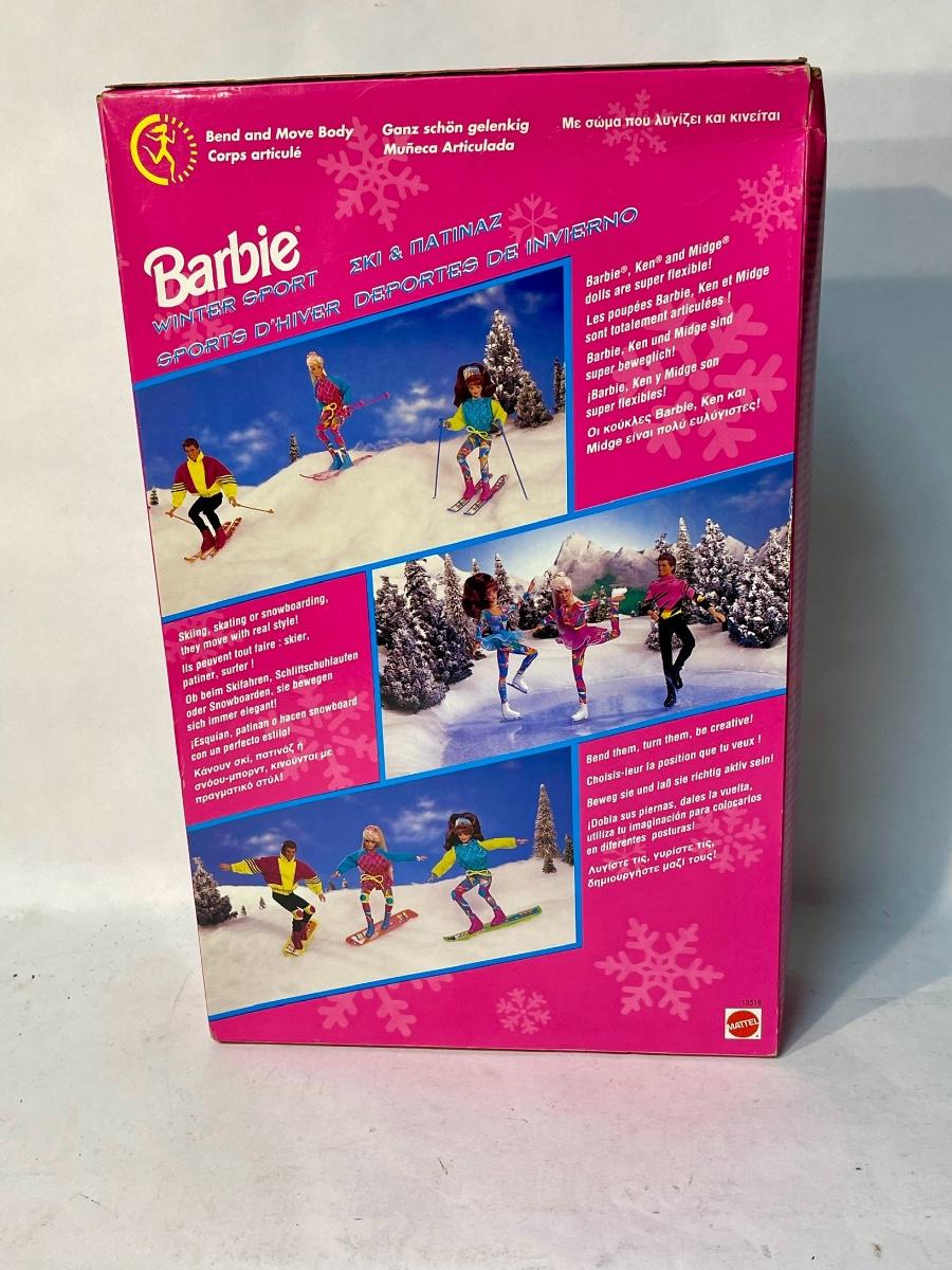 1994 edition. Barbie with snow skiing outfit, and also includes snow goggles, ski boots, skis, ski poles, and snowboard.