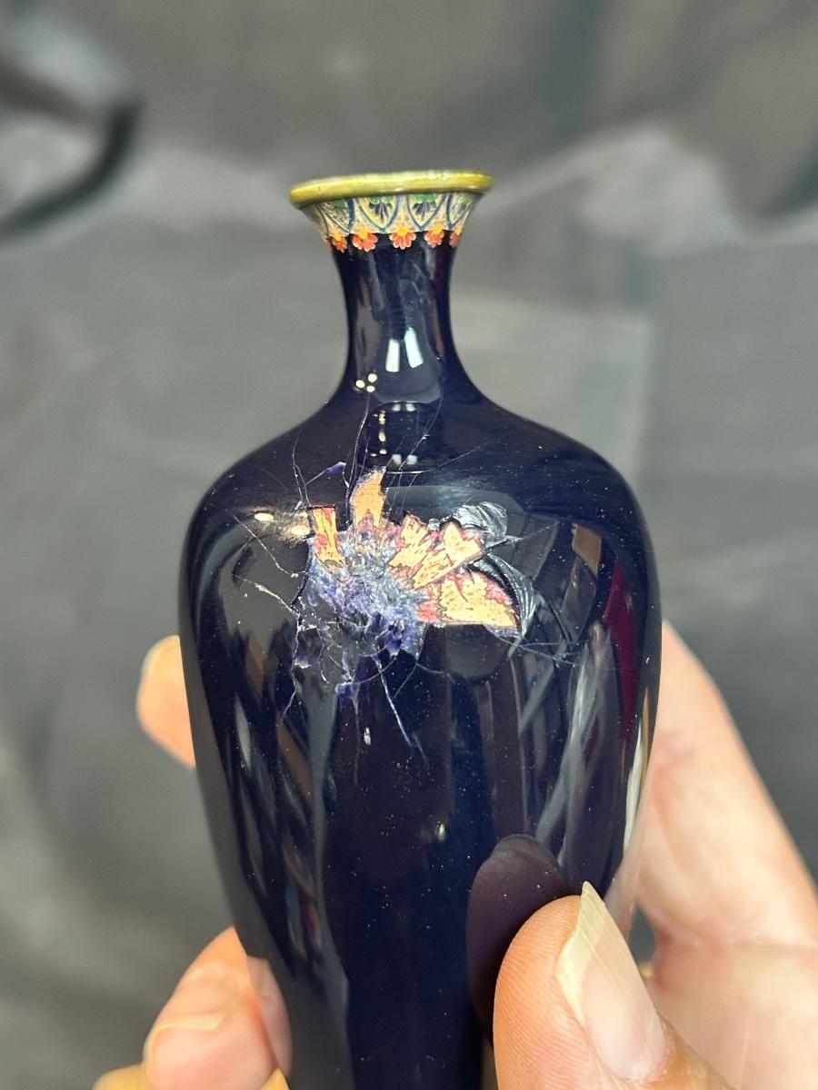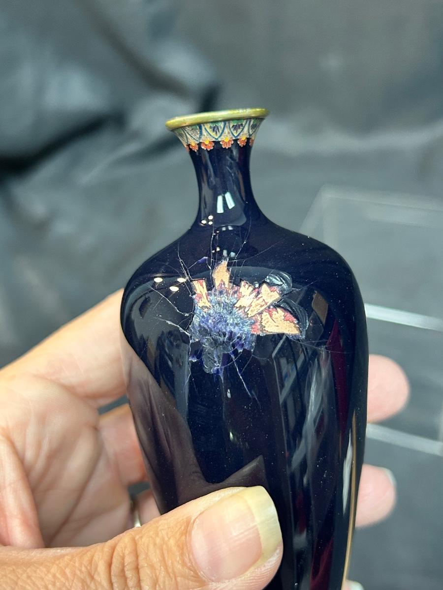 Vintage Antique Japanese Meiji Period Miniature Small Cloisonne Vase Enamel on Metal. Beautifully decorated. Unfortunately, there is damage on the back side where the item was dropped and shattered, the enamel almost looks like broken glass due to how it was made. Under 6" size. Displays nice. Branded on the bottom.