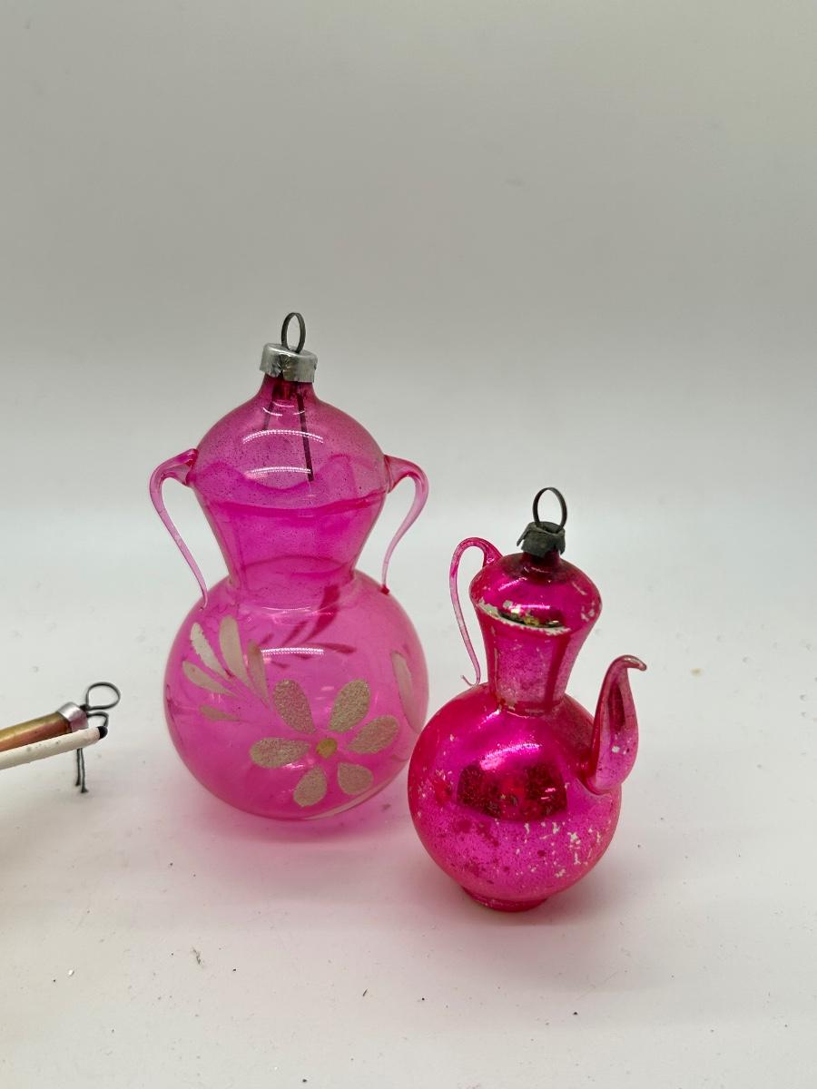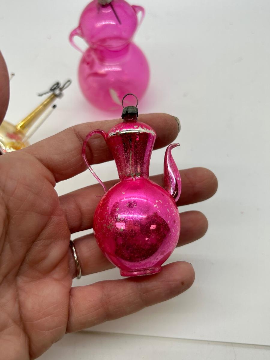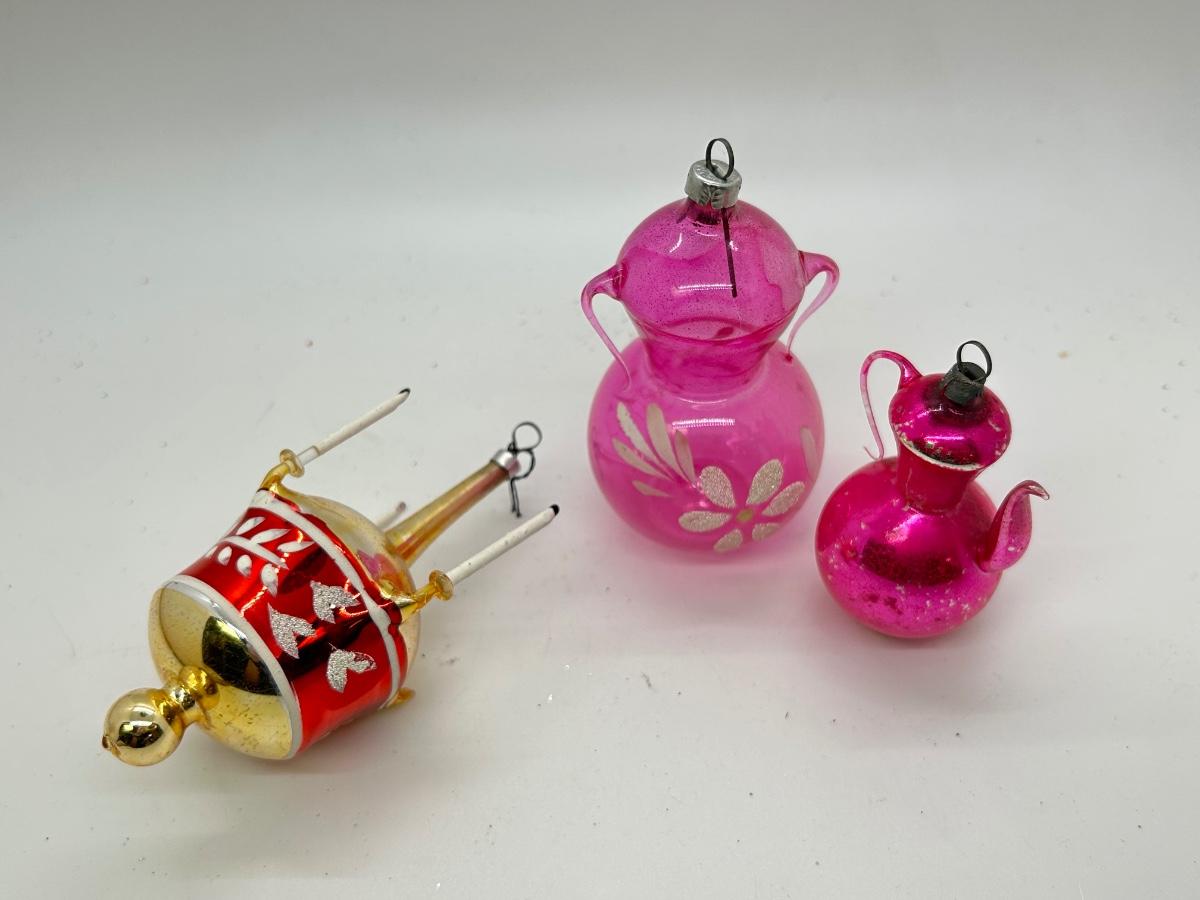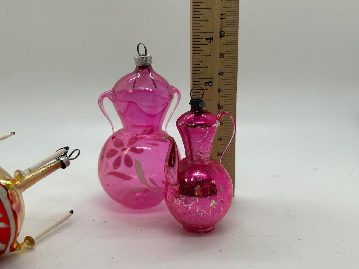 Vintage Blown Glass Christmas Holiday Tree Ornaments Unusual Shapes. Interesting ornaments, one looks like it has small candles attached, one is a teapot, and one is like a double handle vase. In vintage condition. There is wear to the finishes and the candle ornament is missing one. Overall, they will still display nice.