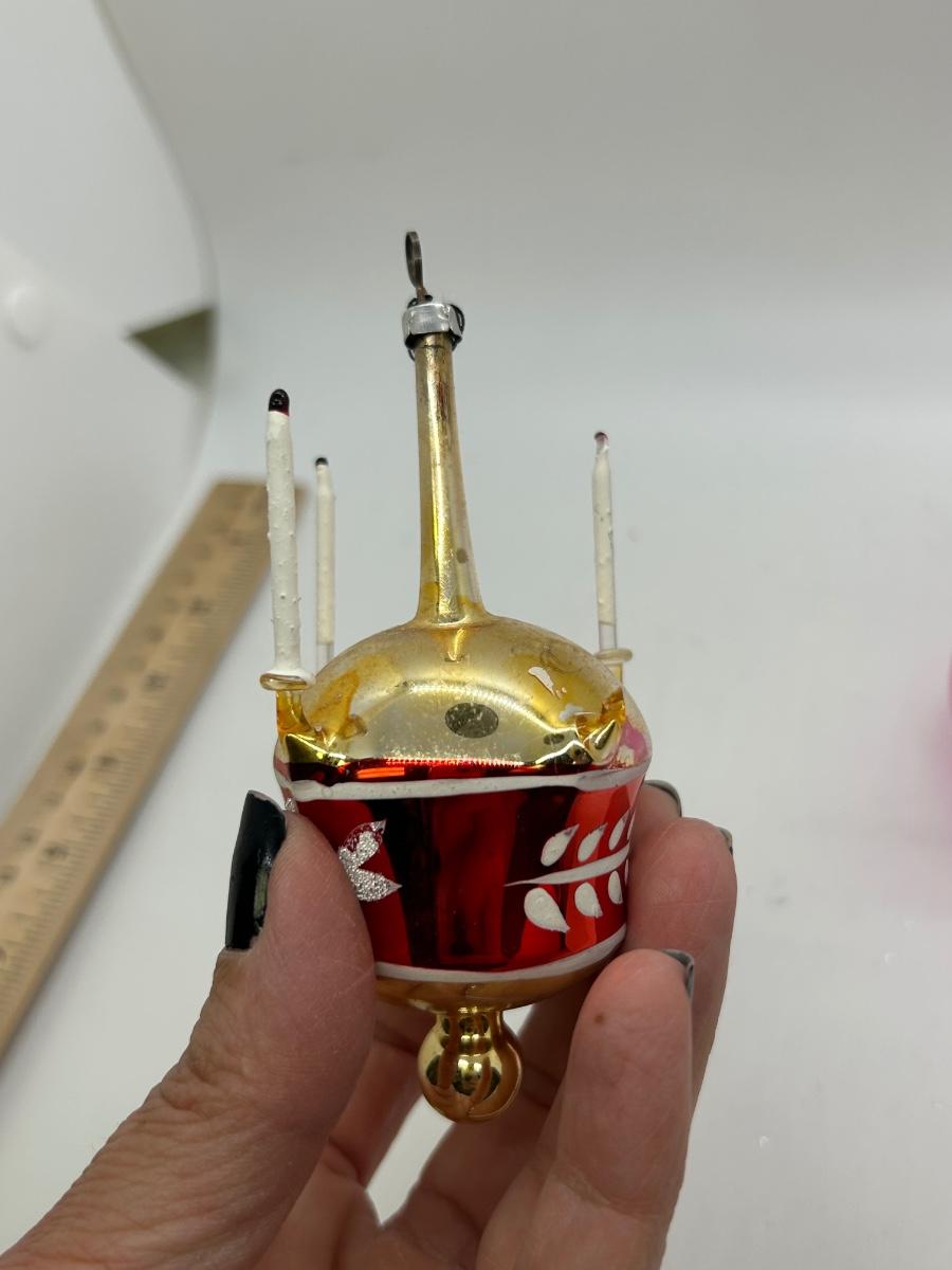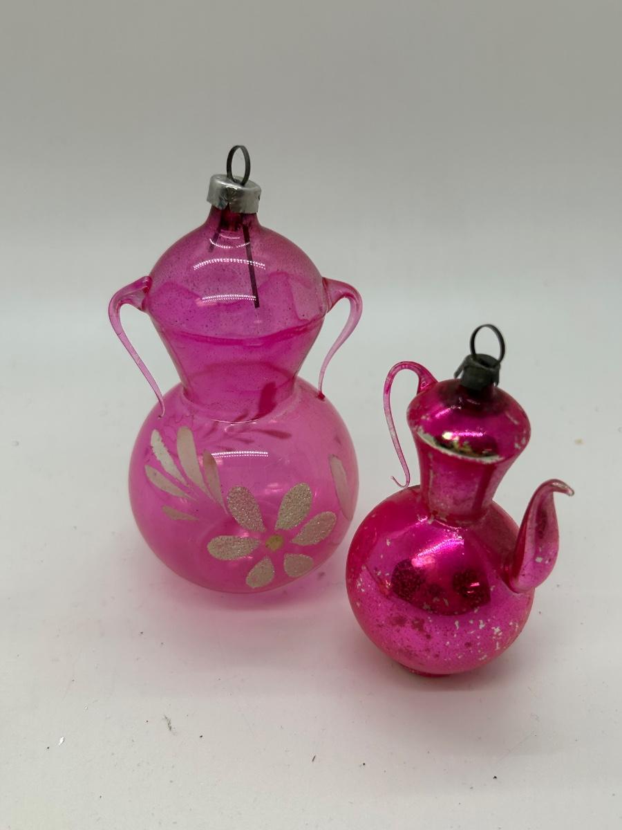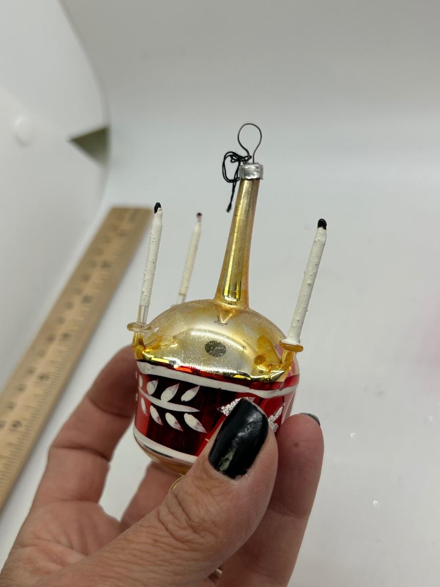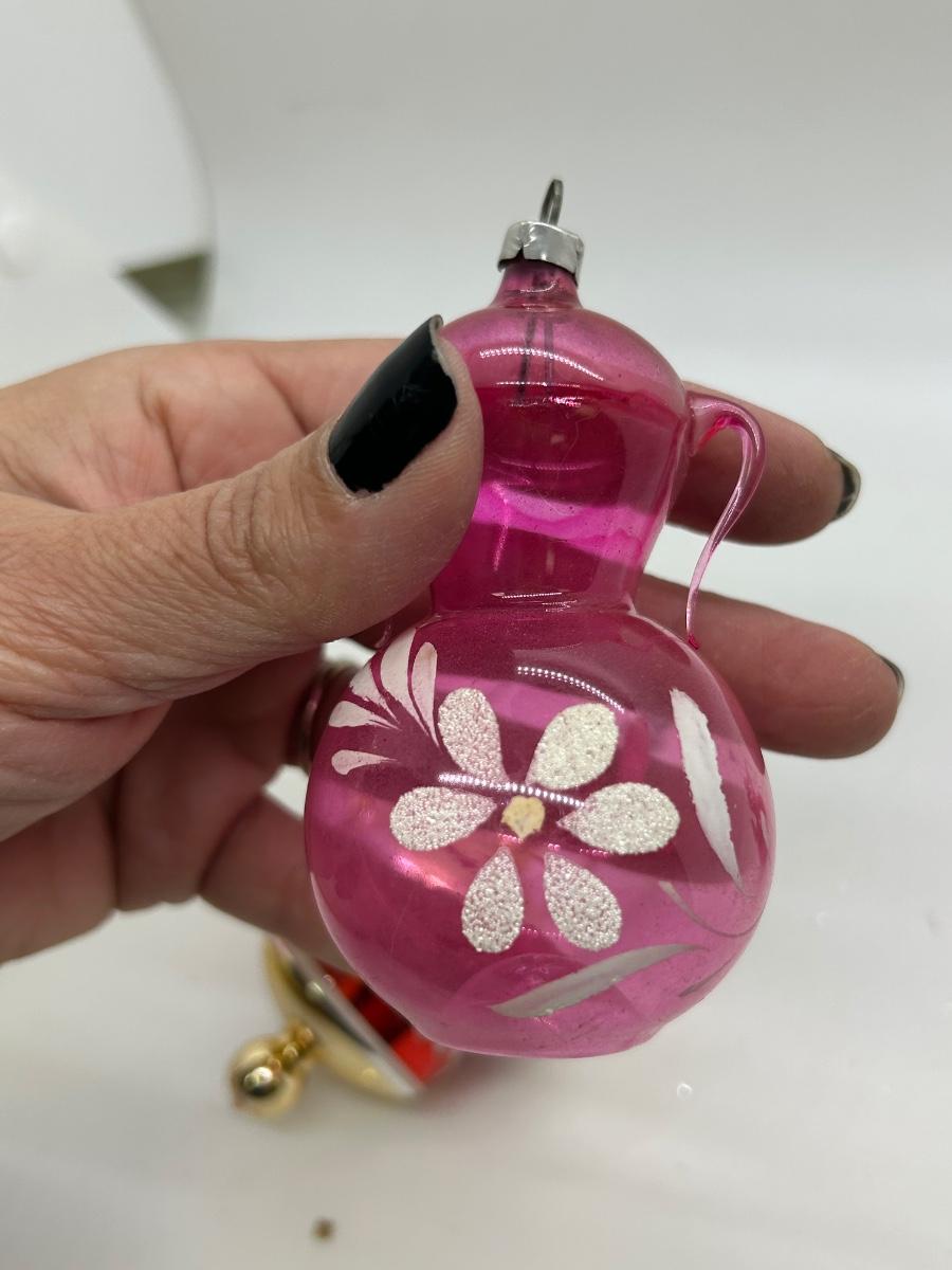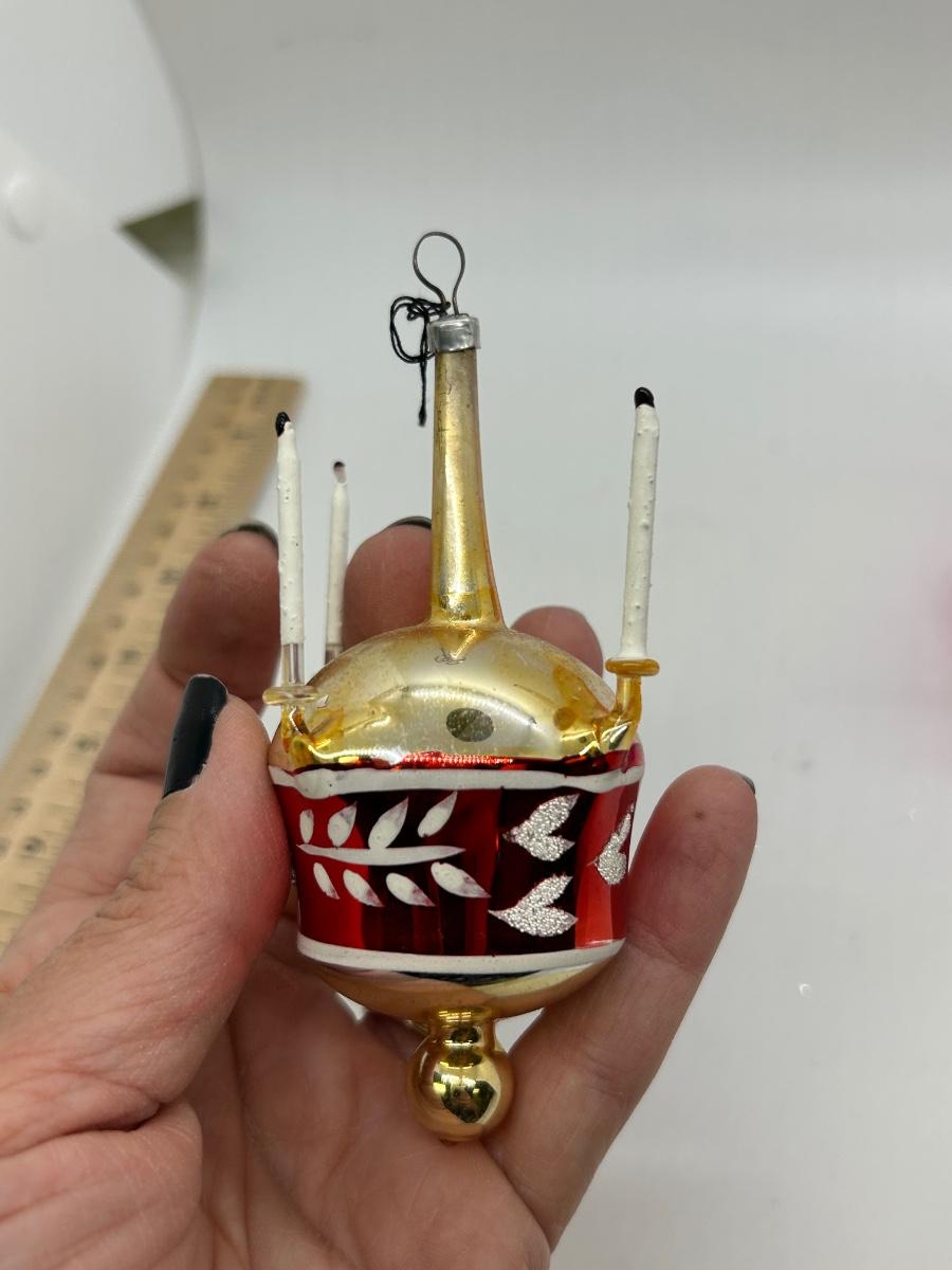 Vintage Blown Glass Christmas Holiday Tree Ornaments Unusual Shapes. Interesting ornaments, one looks like it has small candles attached, one is a teapot, and one is like a double handle vase. In vintage condition. There is wear to the finishes and the candle ornament is missing one. Overall, they will still display nice.