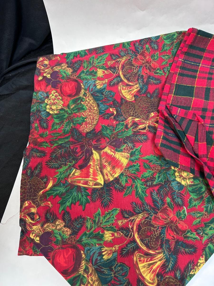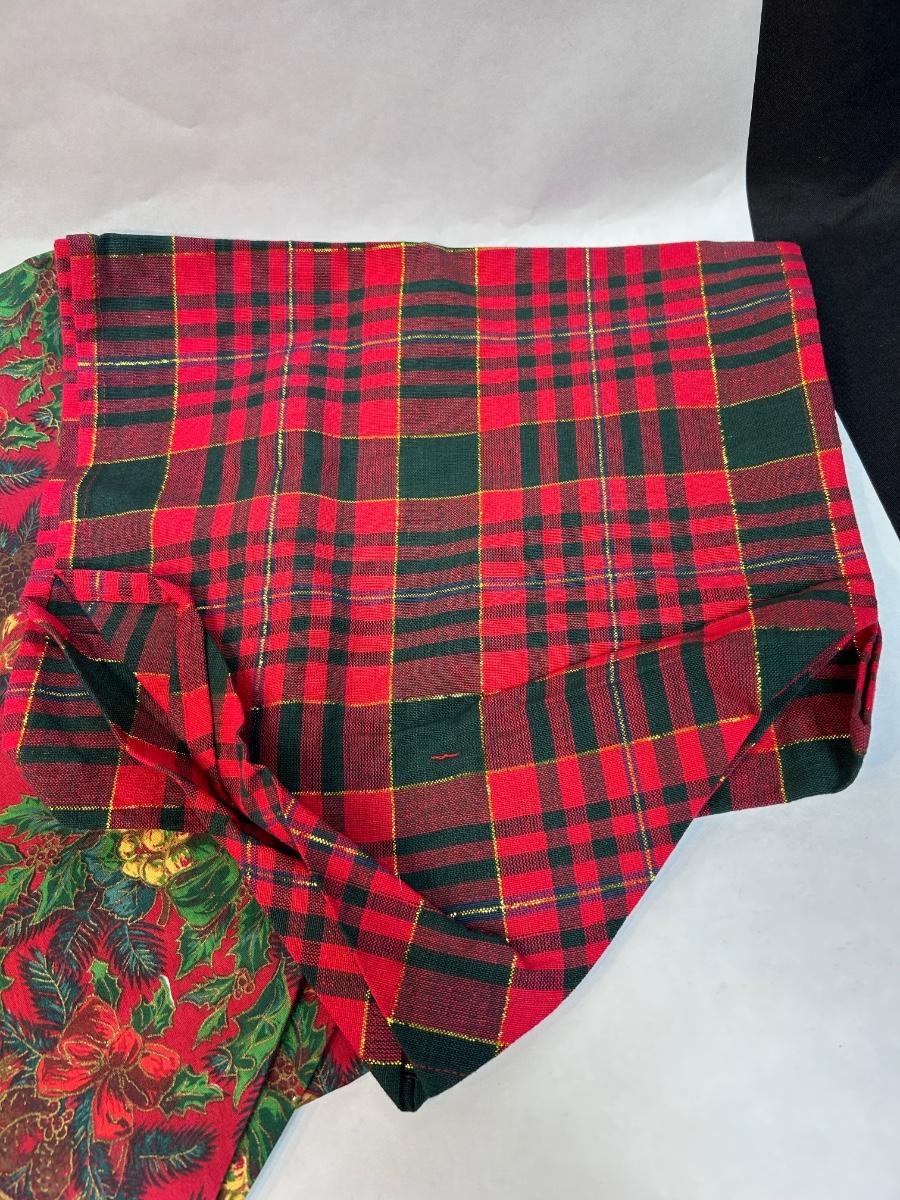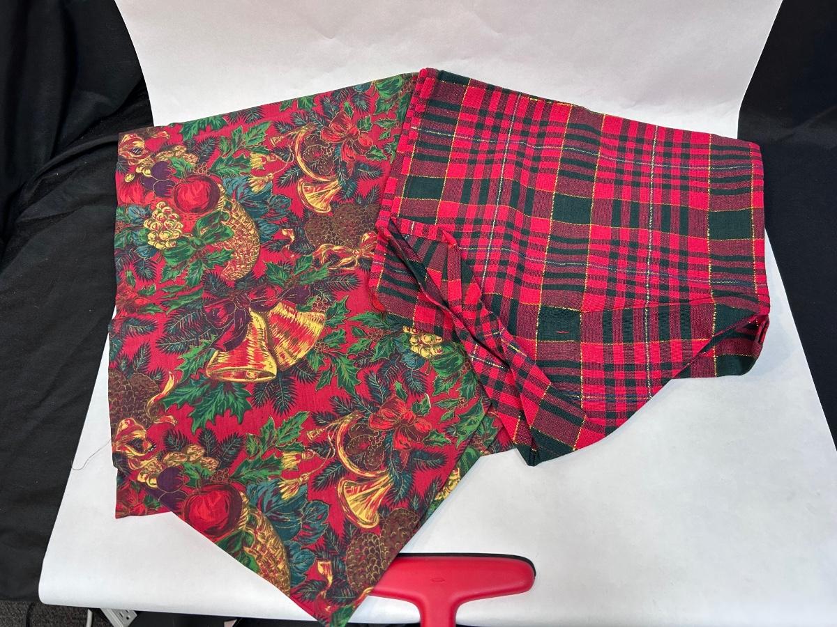 Pair of Christmas Holiday Table Runners Red Green Gold Plaid Bells and Pinecones. In good condition. About 5' lengths. No spots or stains noticed.