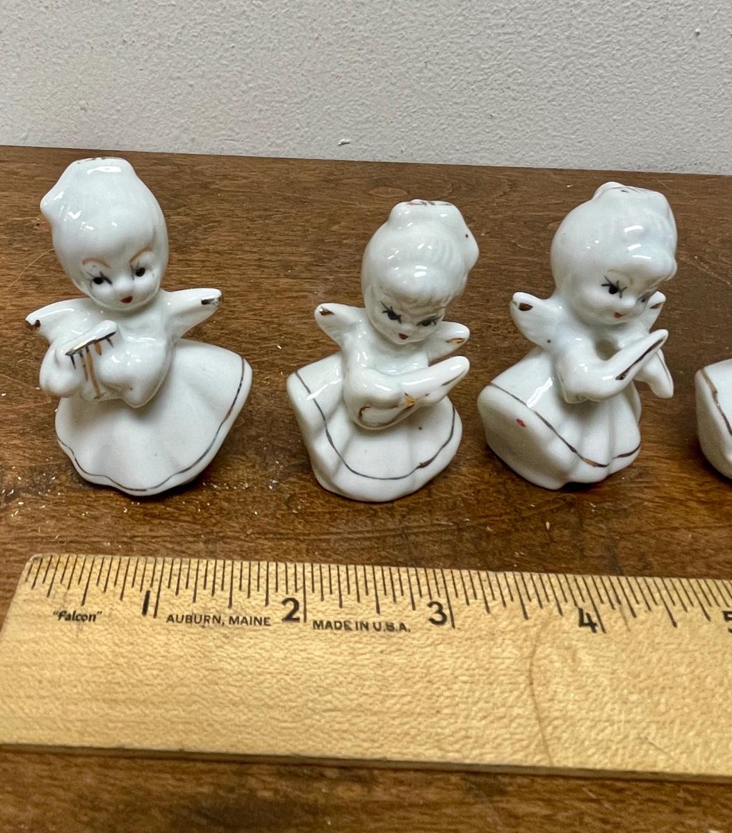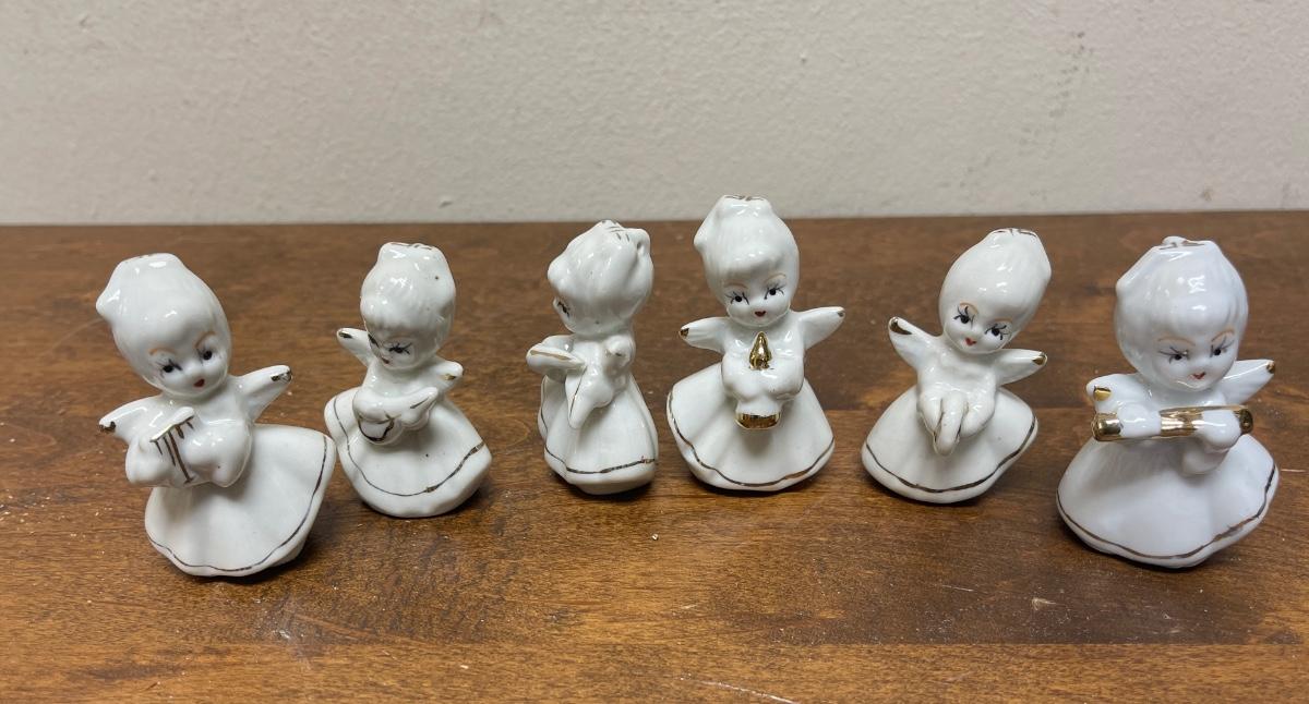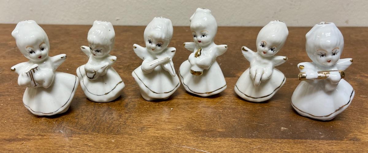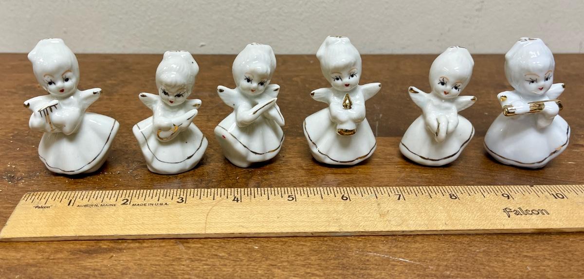 VIntage 6pc Set of Porcelain White Gold Angels w/Musical Instruments Figurines