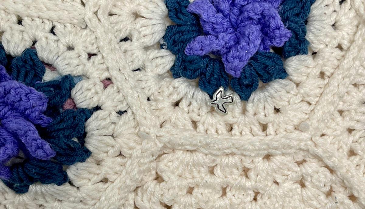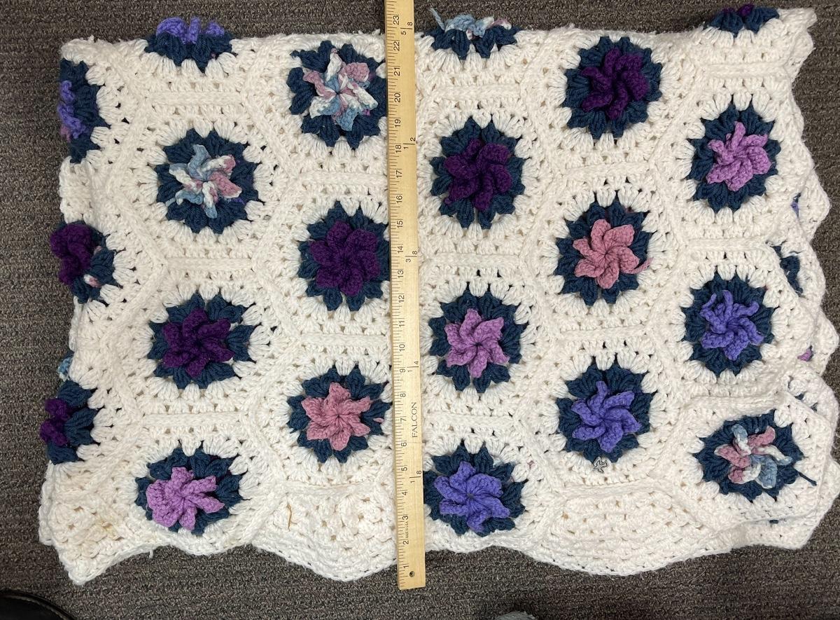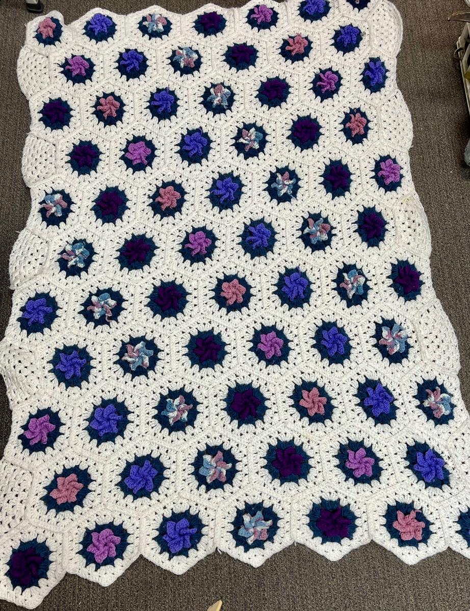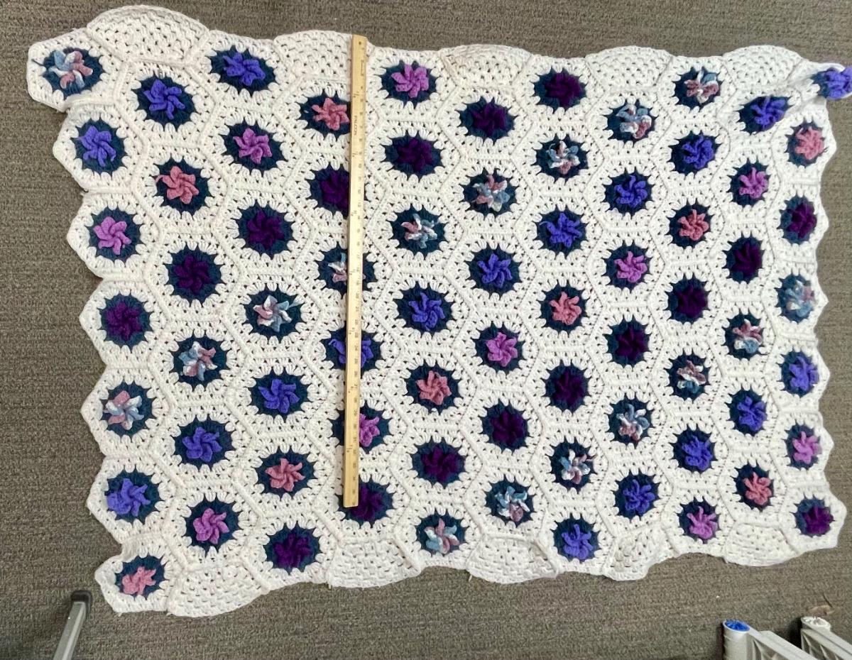 Vintage Crotched  Afghan Purple Pink Cream Flowers. 60" x 40" Lap Throw Blanket