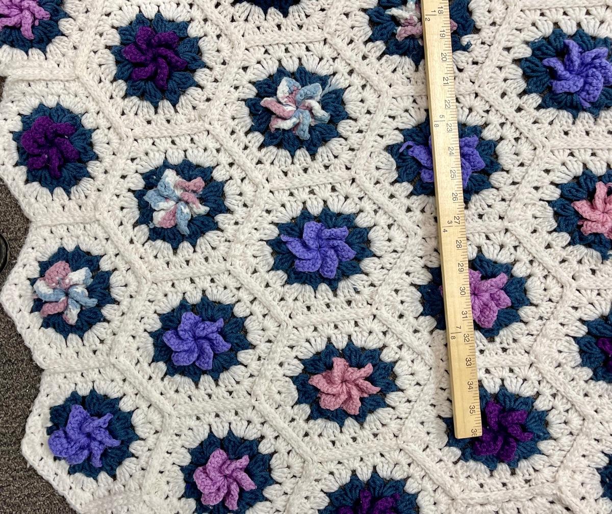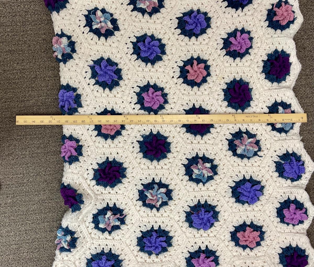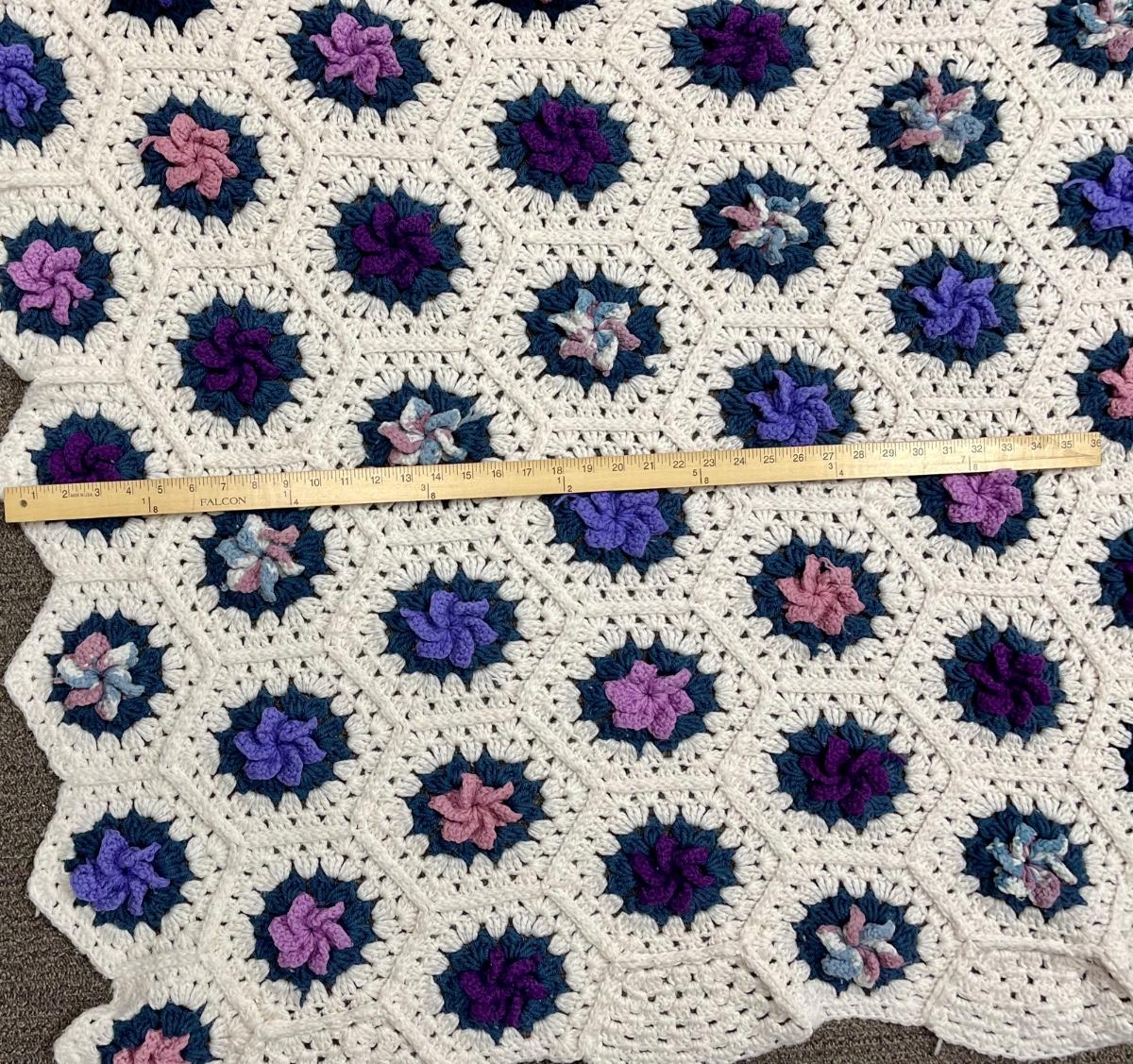 Vintage Crotched Afghan Purple Pink Cream Flowers. 60" x 40" Lap Throw Blanket
