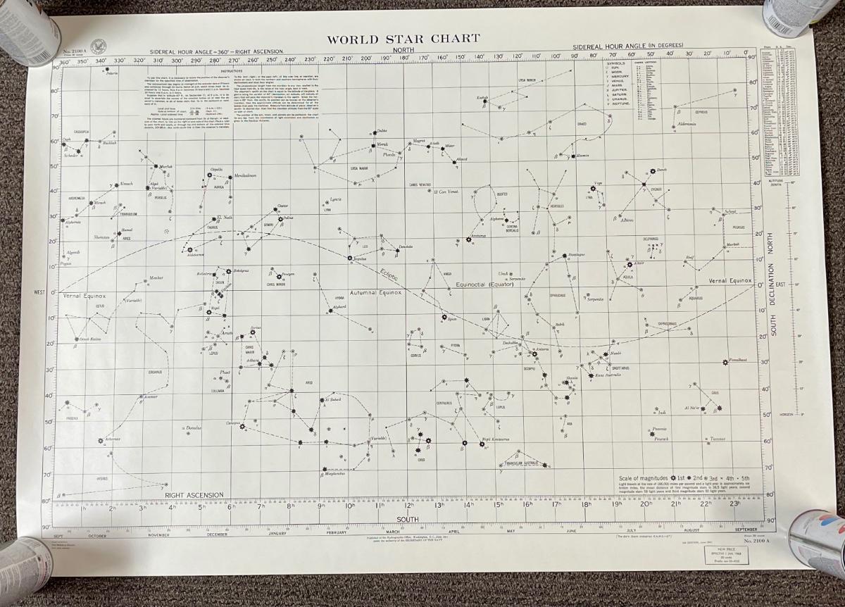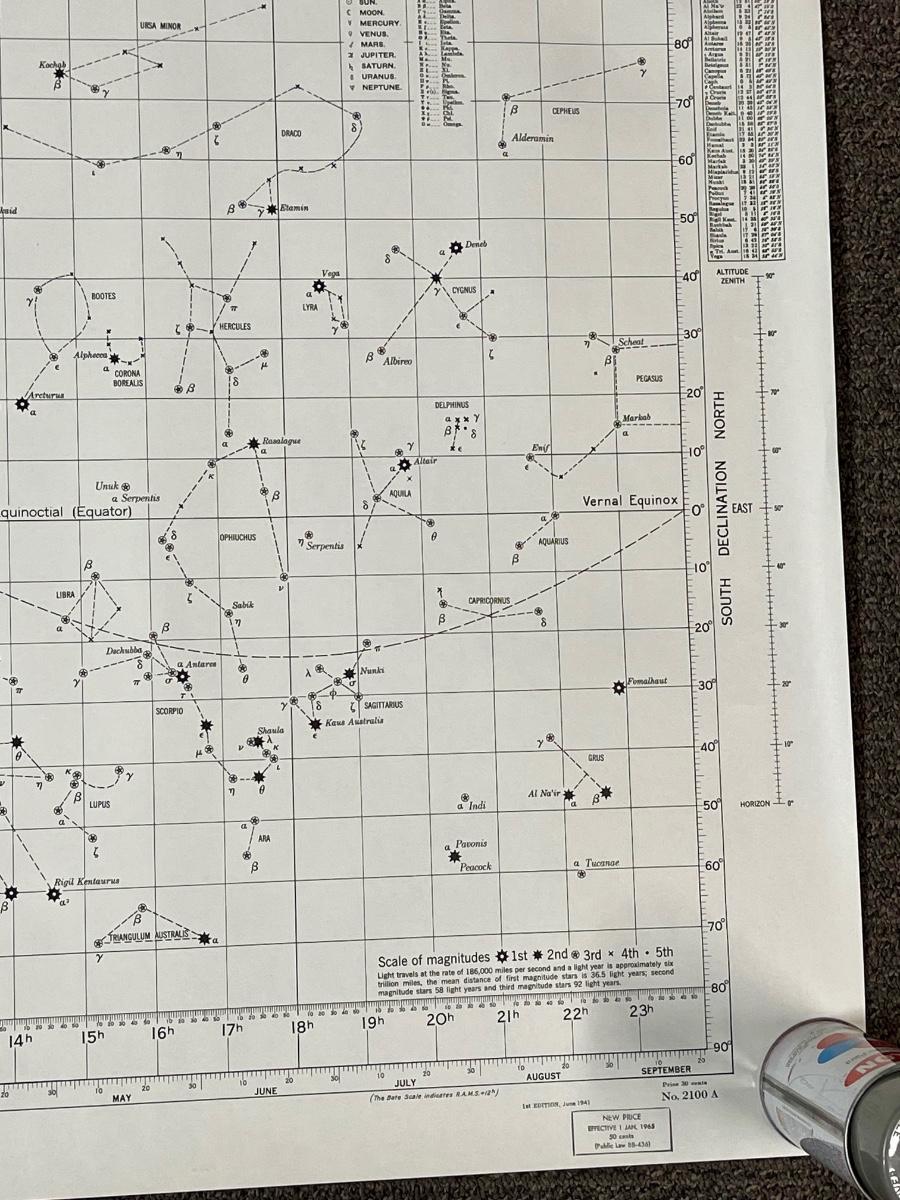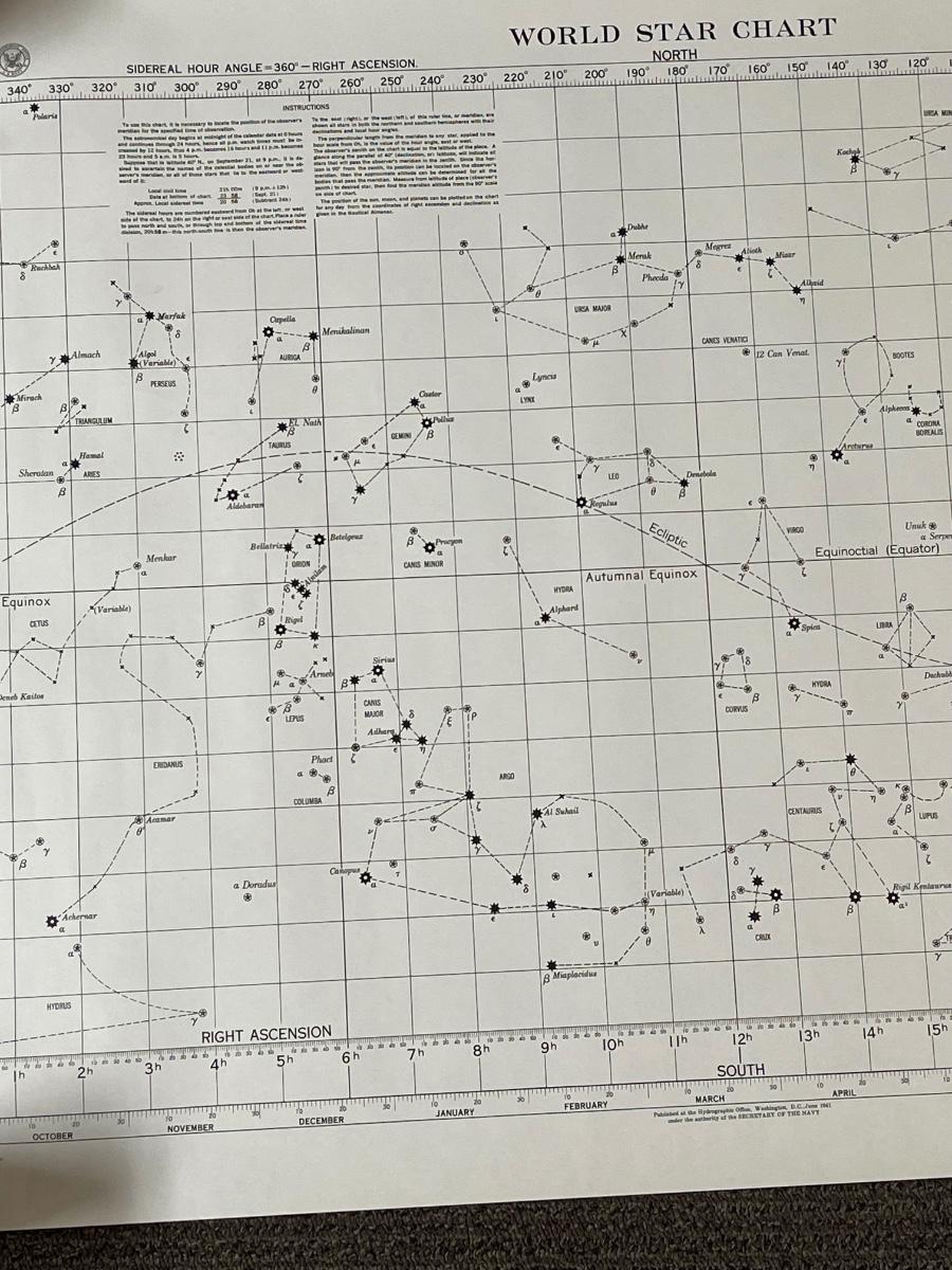 Provides a detailed sky map of stars and constellations. Published in 1964 by the US Navy Hydrographic office.