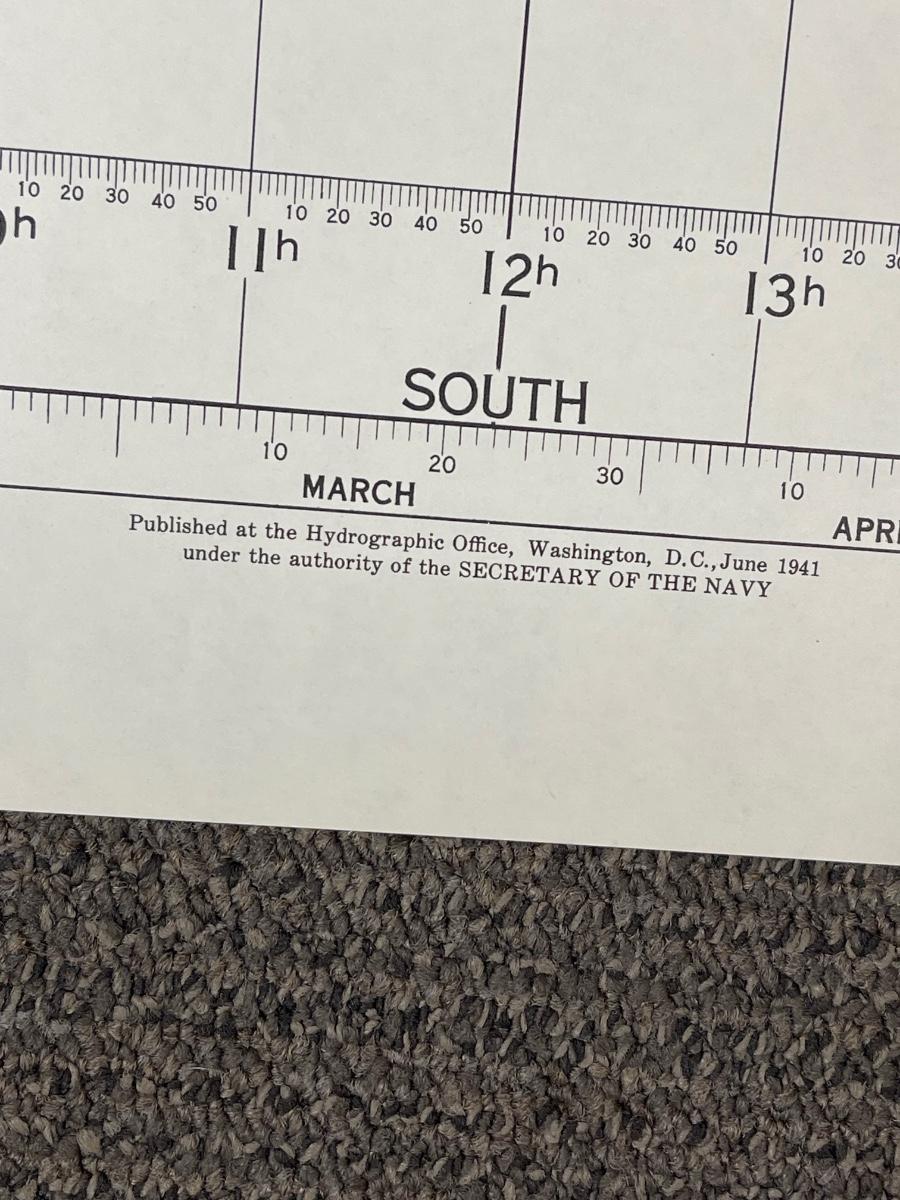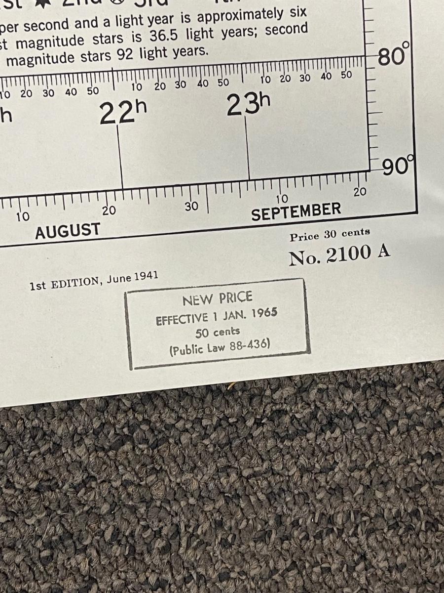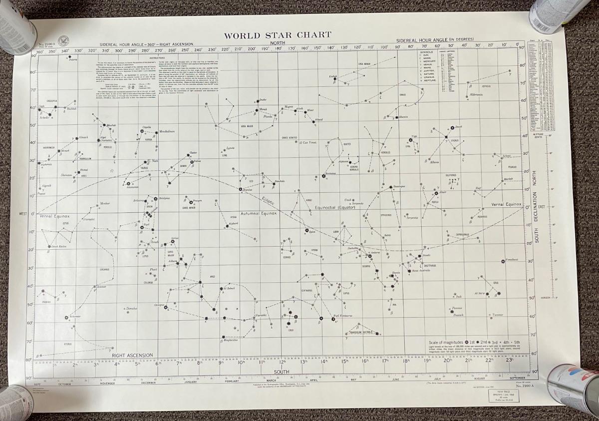 Provides a detailed sky map of stars and constellations. Published in 1964 by the US Navy Hydrographic office.
