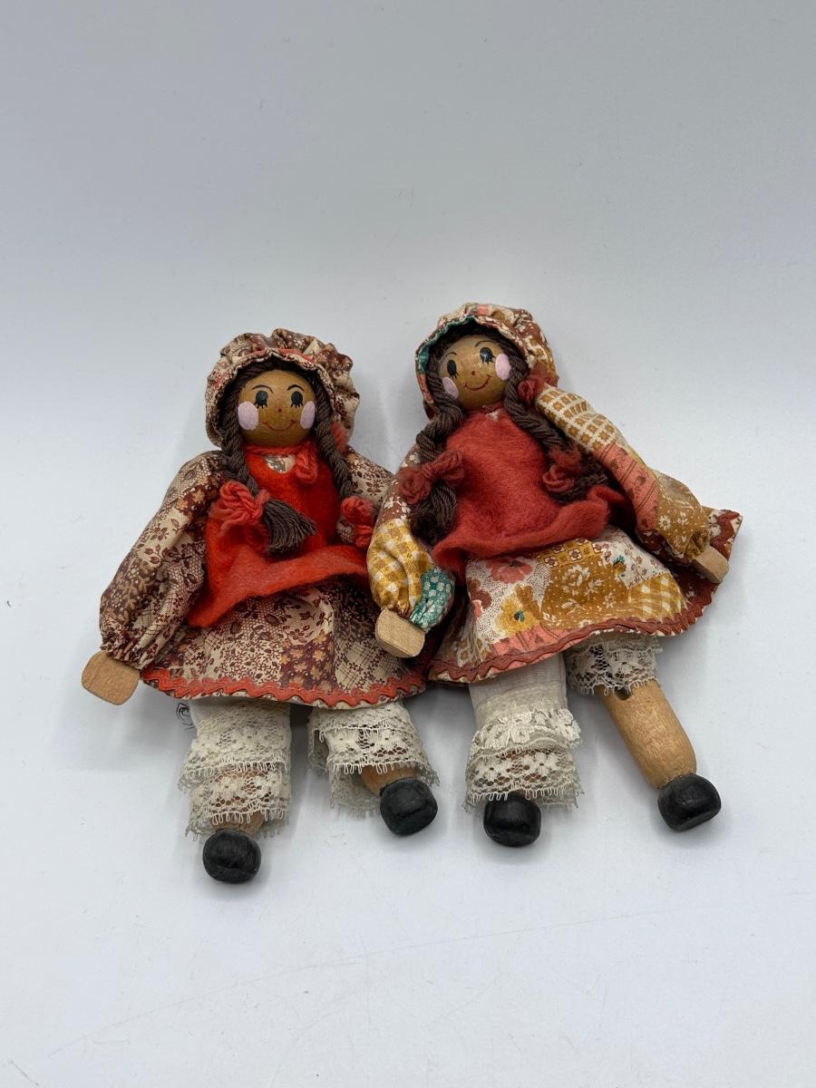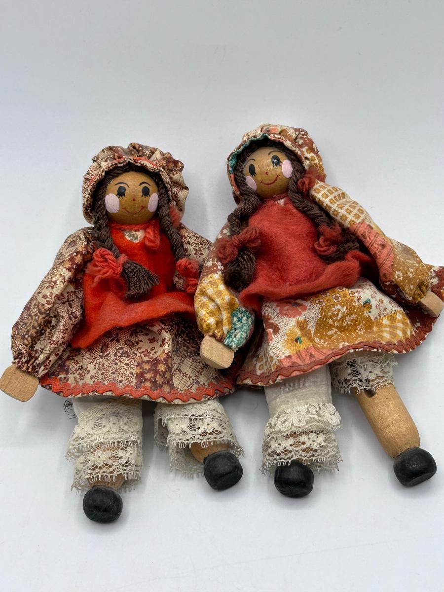 Pair of Folk Art Dolls Painted Clothes Pins and Wood Bead. In good vintage condition. Jointed body made of clothes pins.