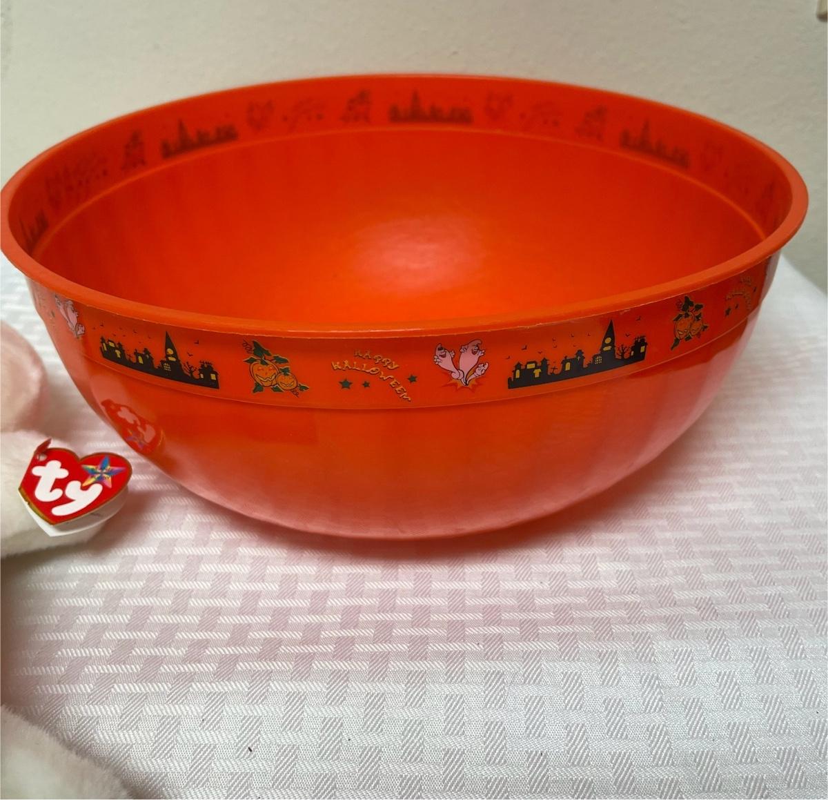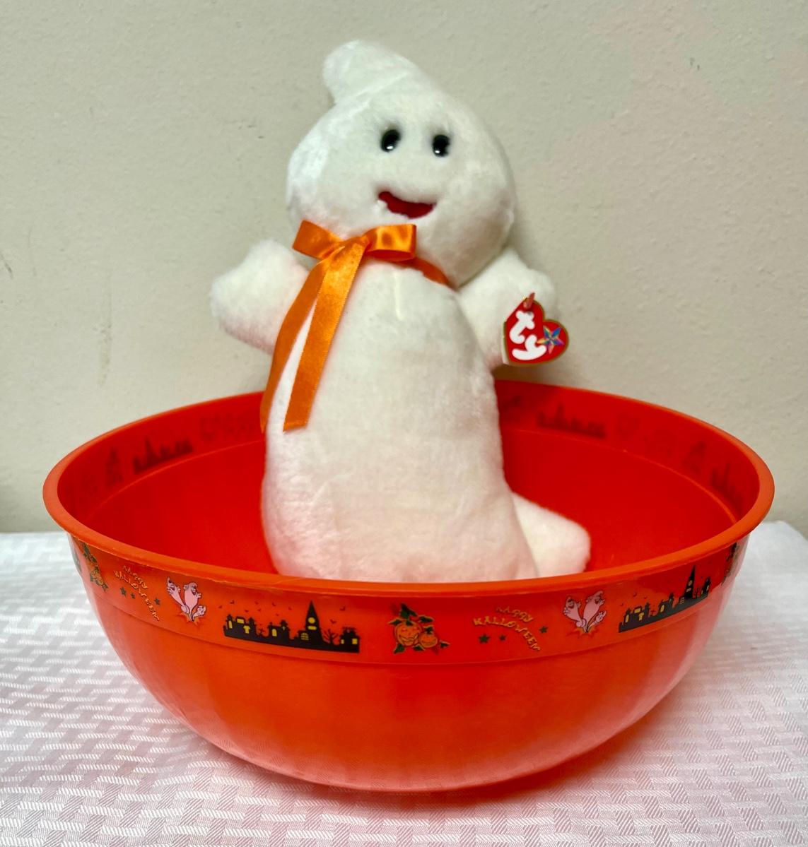 Ty Beanie Buddy Spooky the Ghost plush toy with large plastic bowl