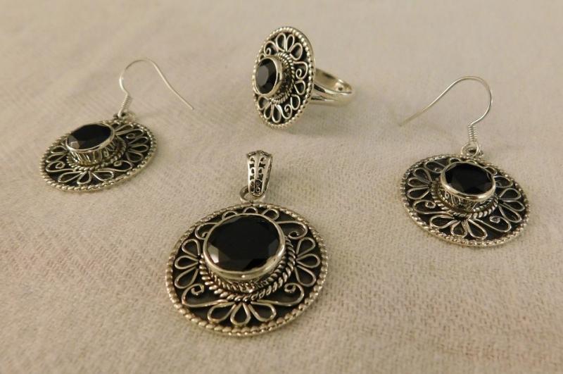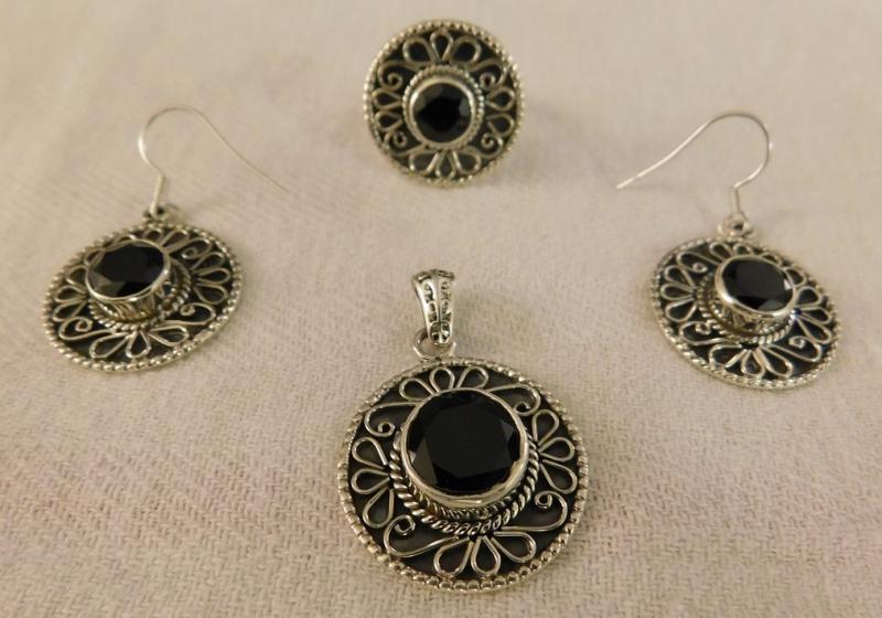 Thai Black Spinel Pendant, Size 7 Ring, and Earrings set in artisan crafted sterling silver. Pendant and earrings 1 1/2" diameter.
