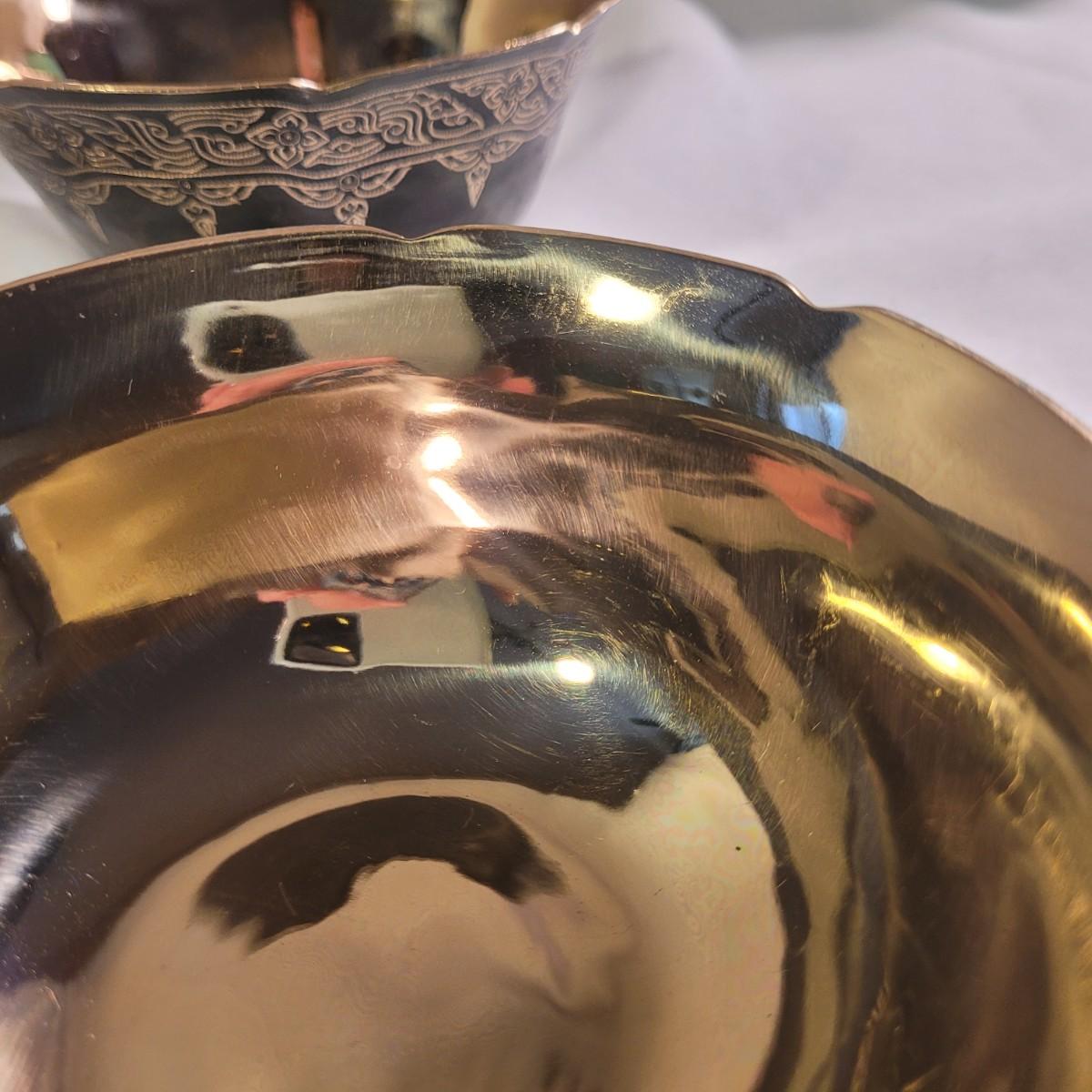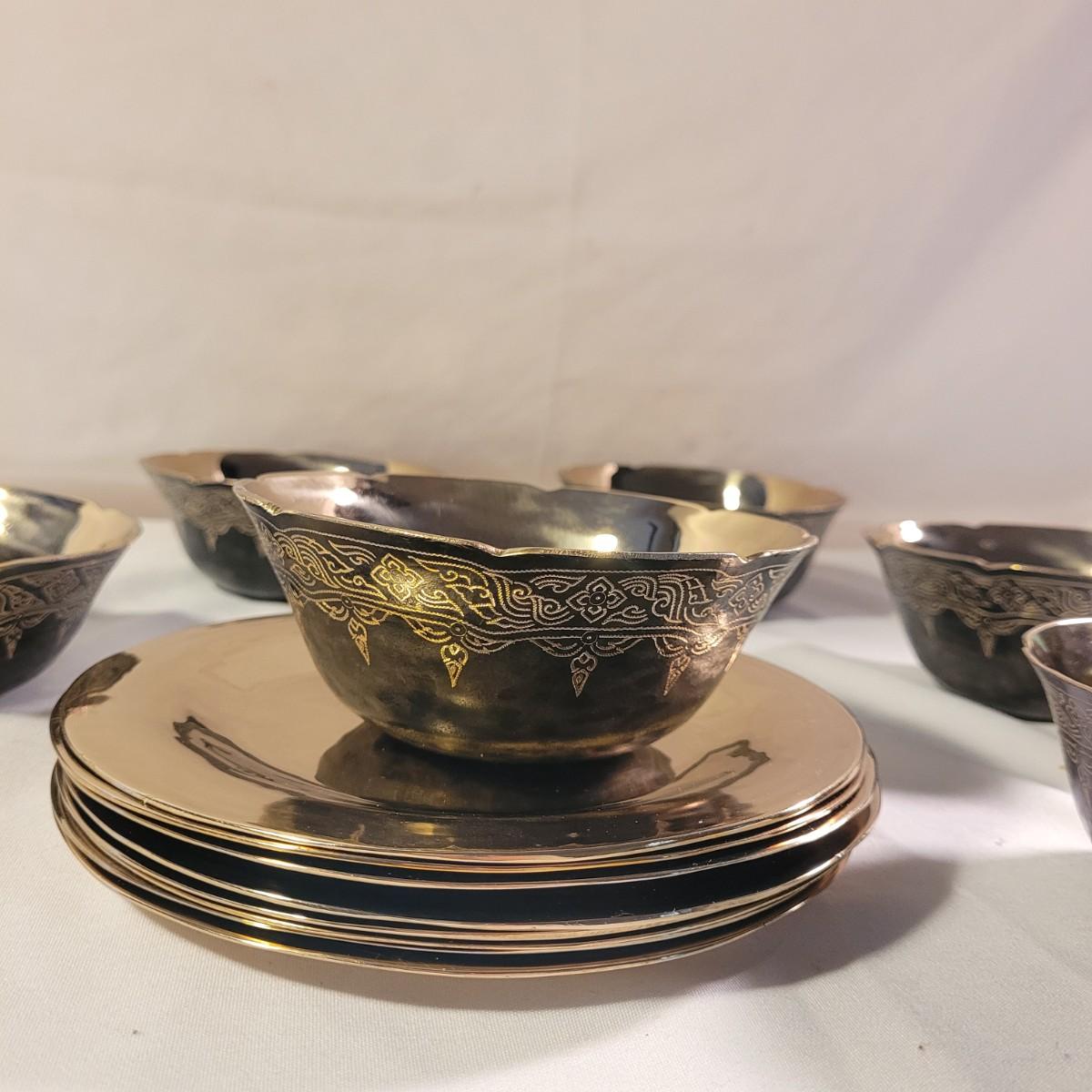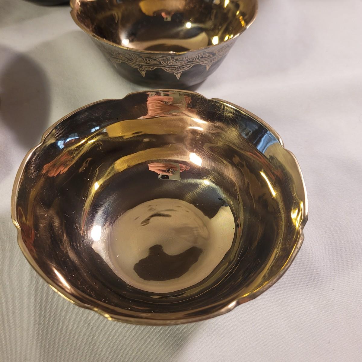 This unique set of eight metal plates and six bowls from Thailand makes a great addition to a collector’s home and appear to be brass. The plates and bowls are each unique, appearing to have a handmade look with organic wavy edges. The bowls are finely etched in a traditional Thai style with scalloped edges. Plates measure approximately 7.5”D and bowls 5.5”D x 2”H. Shipping available.