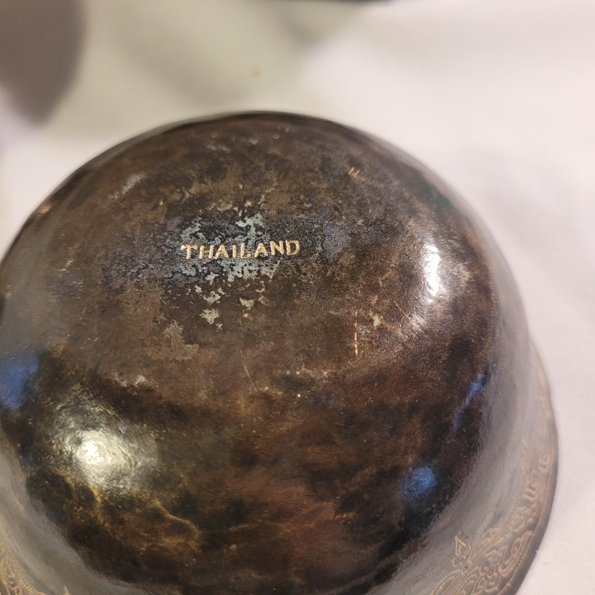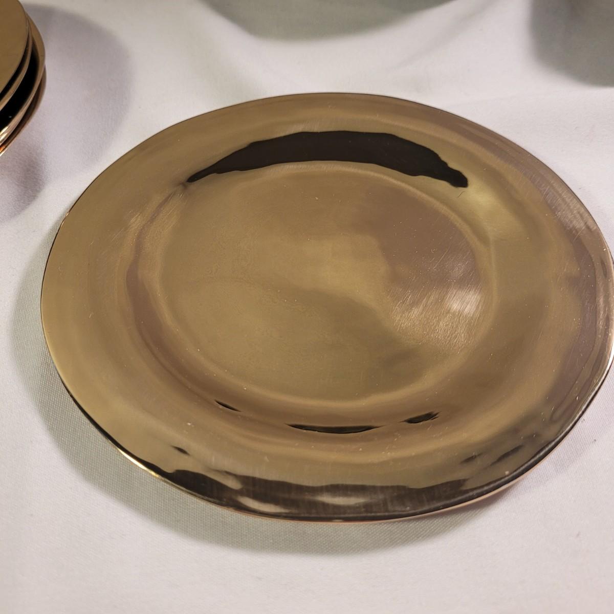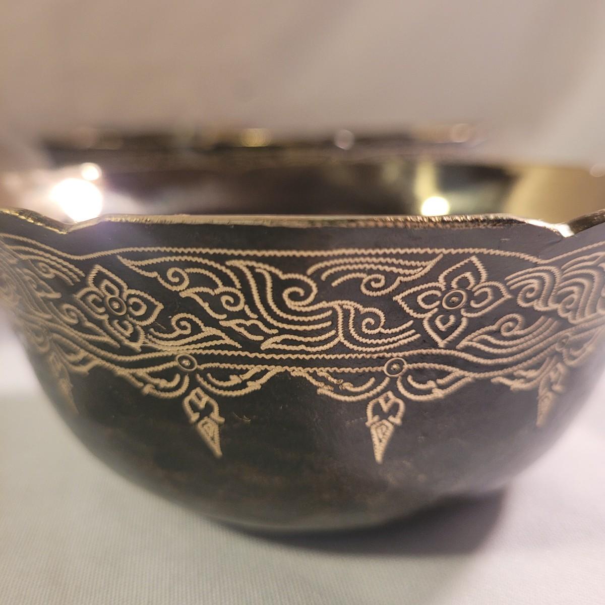 This unique set of eight metal plates and six bowls from Thailand makes a great addition to a collector’s home and appear to be brass. The plates and bowls are each unique, appearing to have a handmade look with organic wavy edges. The bowls are finely etched in a traditional Thai style with scalloped edges. Plates measure approximately 7.5”D and bowls 5.5”D x 2”H. Shipping available.