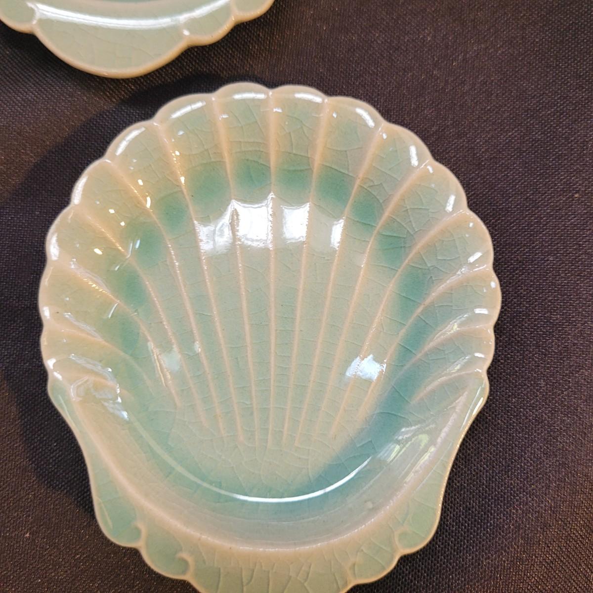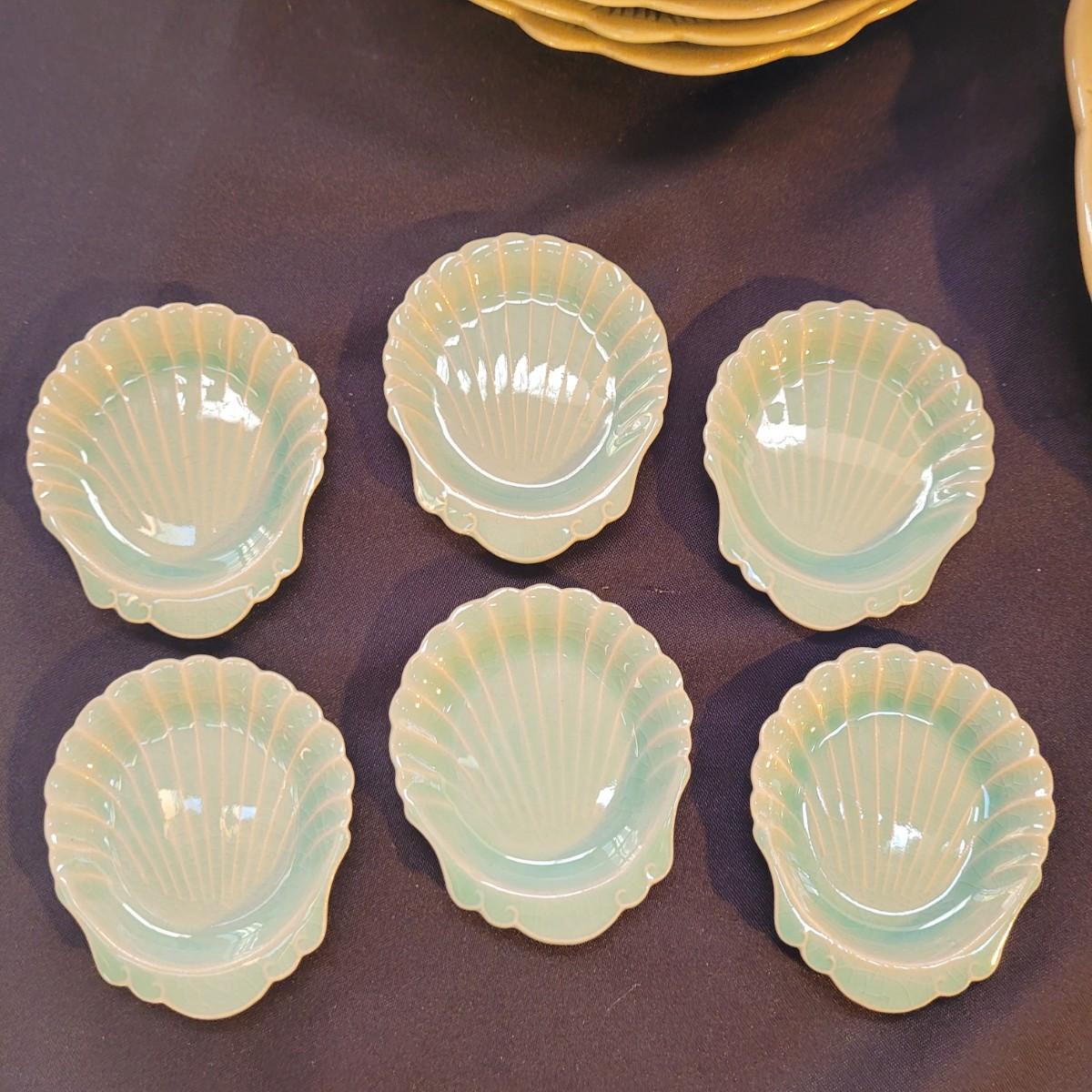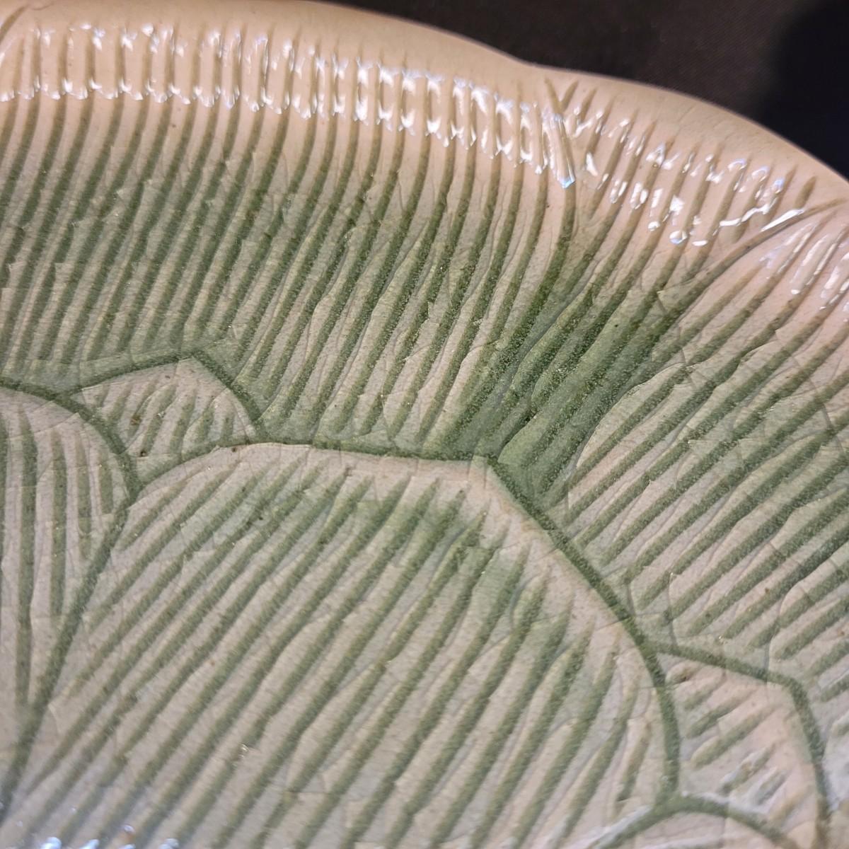 This set of Thai Celadon ceramic serve ware features a beautiful soft jade green crazed, textured floral pattern. Eight small plates and one large serving dish. Included as well are six small scalloped shell shape shallow sauce dishes. Large serving dish measures approximately 14”D. Shipping available.
