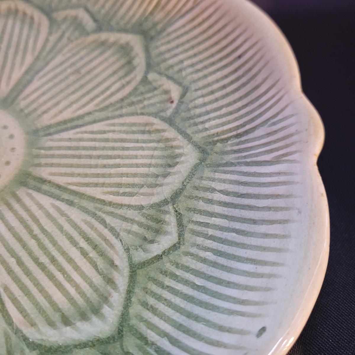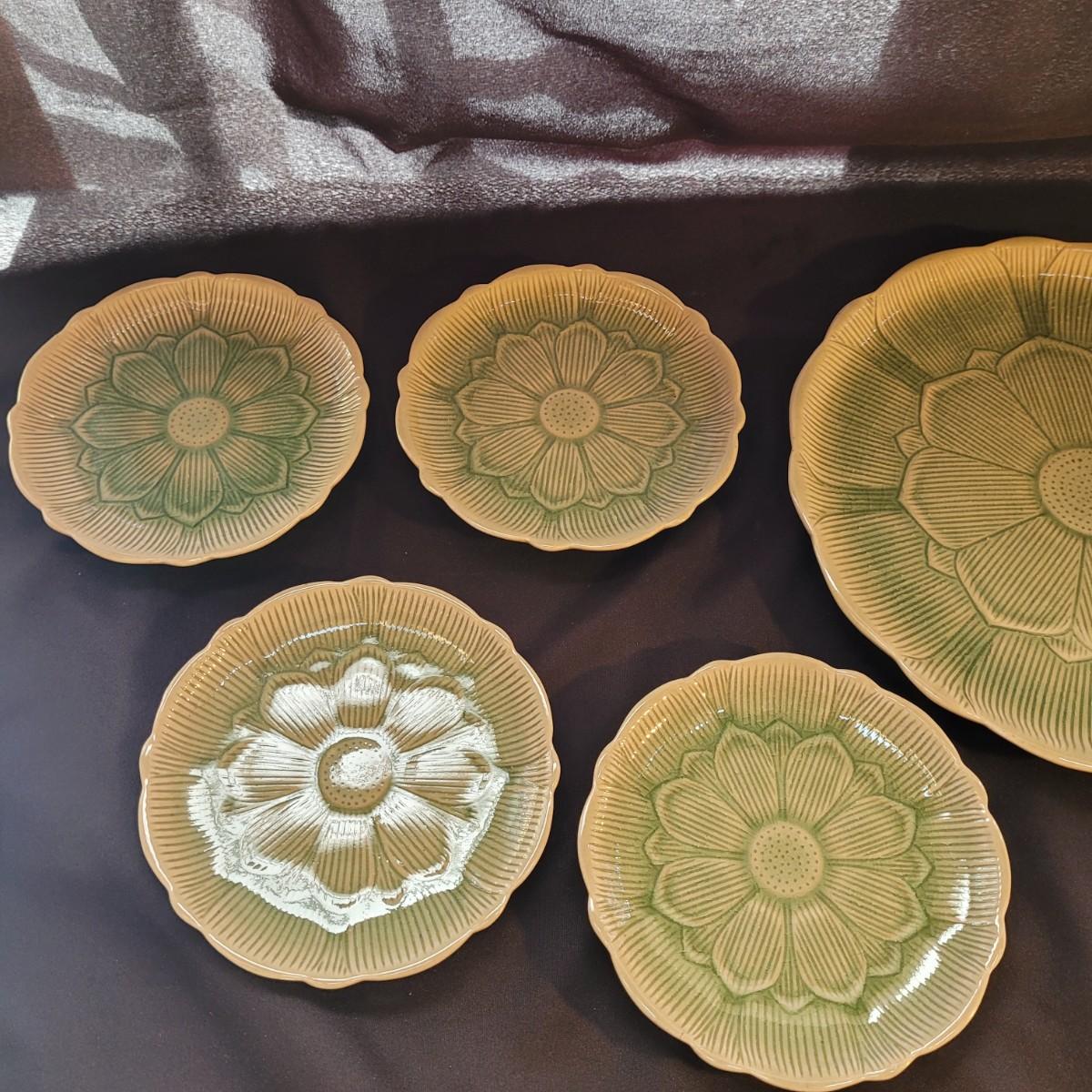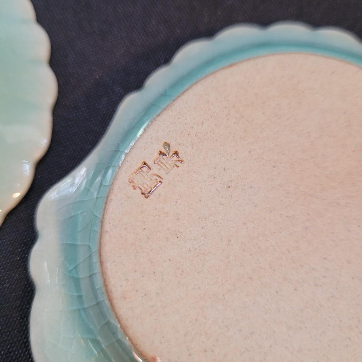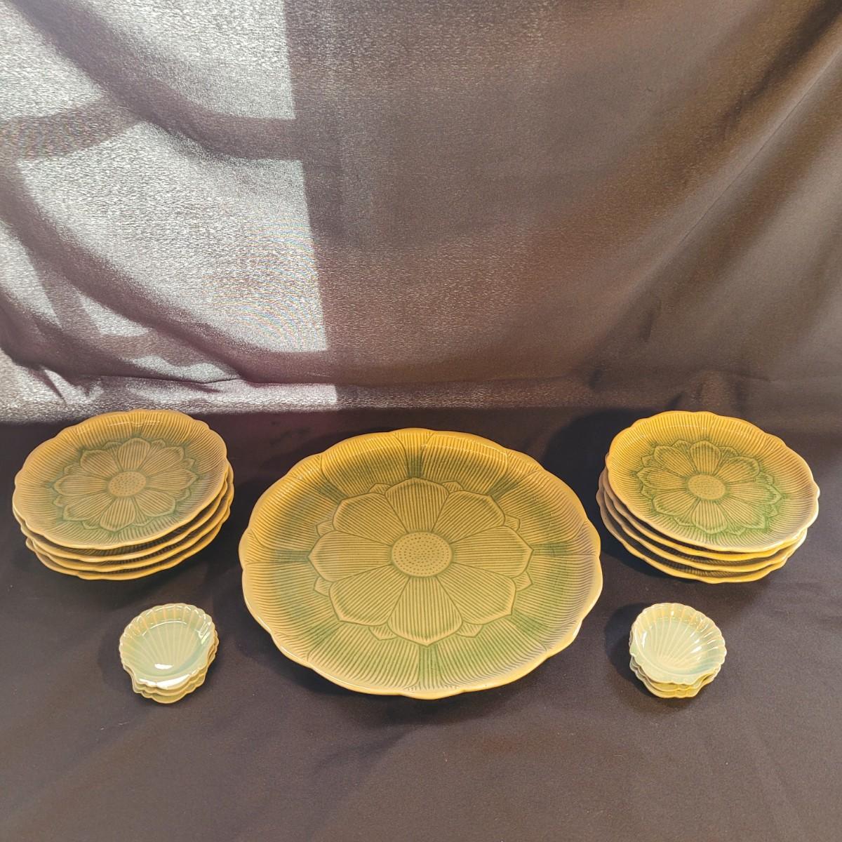 This set of Thai Celadon ceramic serve ware features a beautiful soft jade green crazed, textured floral pattern. Eight small plates and one large serving dish. Included as well are six small scalloped shell shape shallow sauce dishes. Large serving dish measures approximately 14”D. Shipping available.