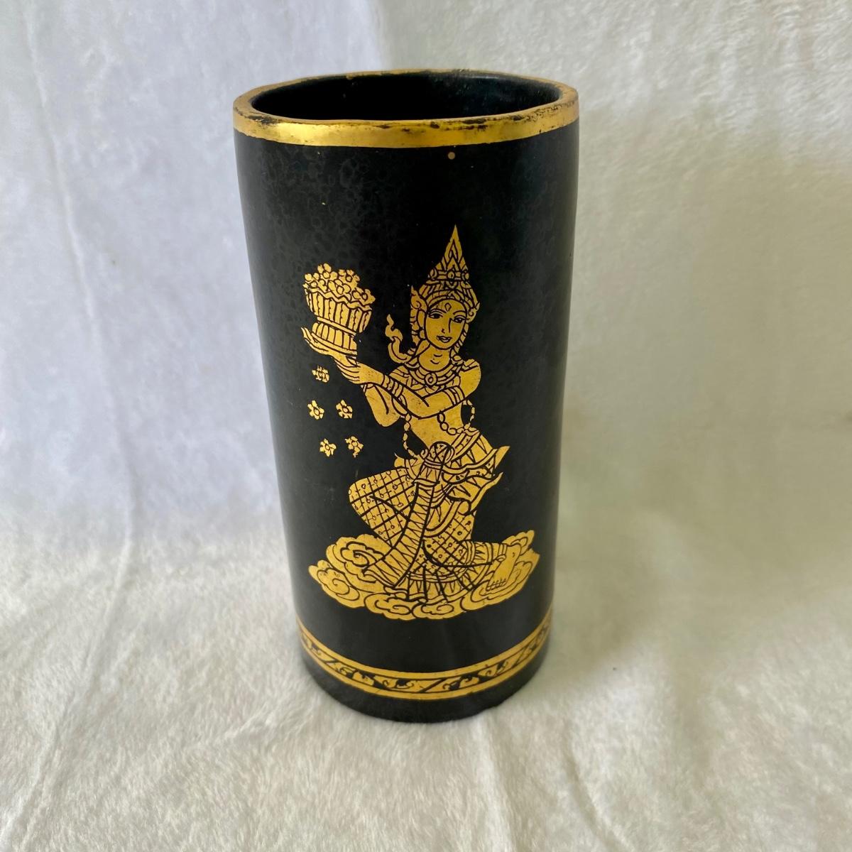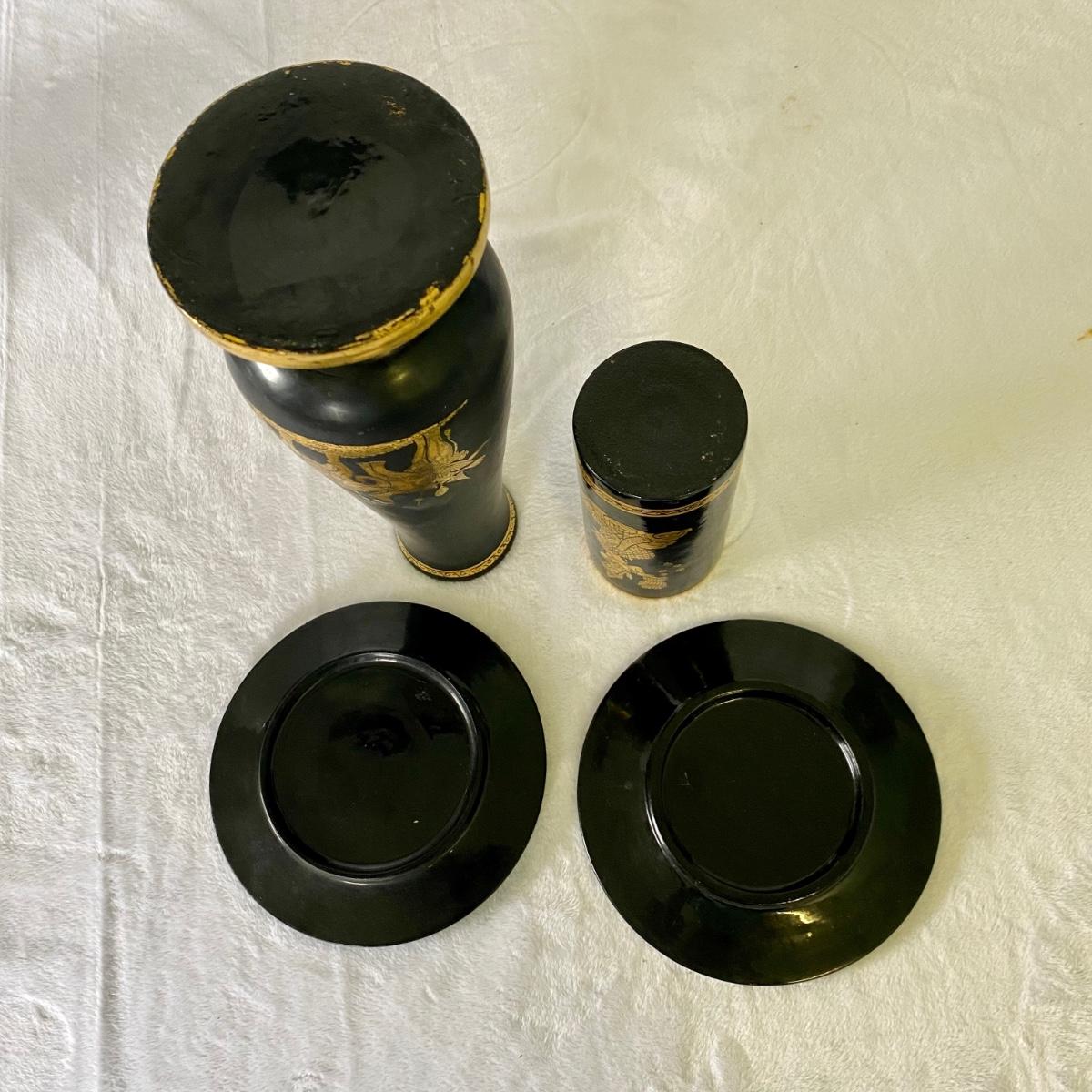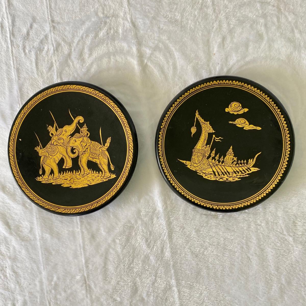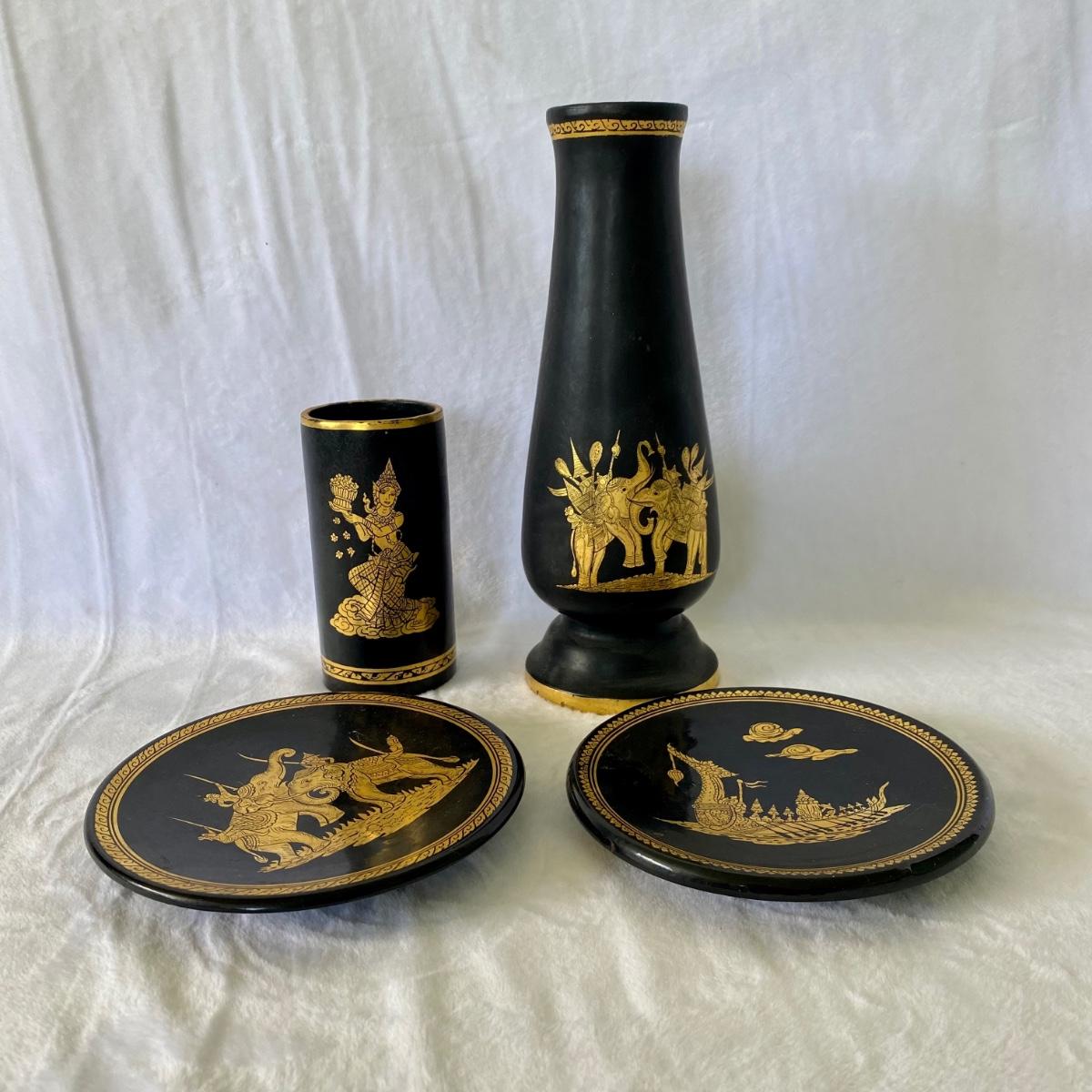 Thai style gold and black lacquer plates, vases, and small box. Tallest vase is 10”H. Plates are 6”D. Small box measures 3”D.