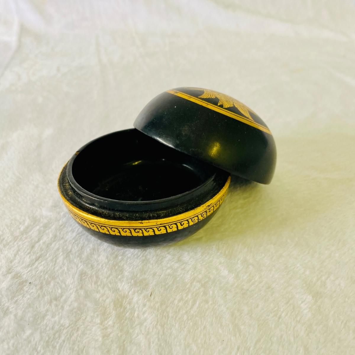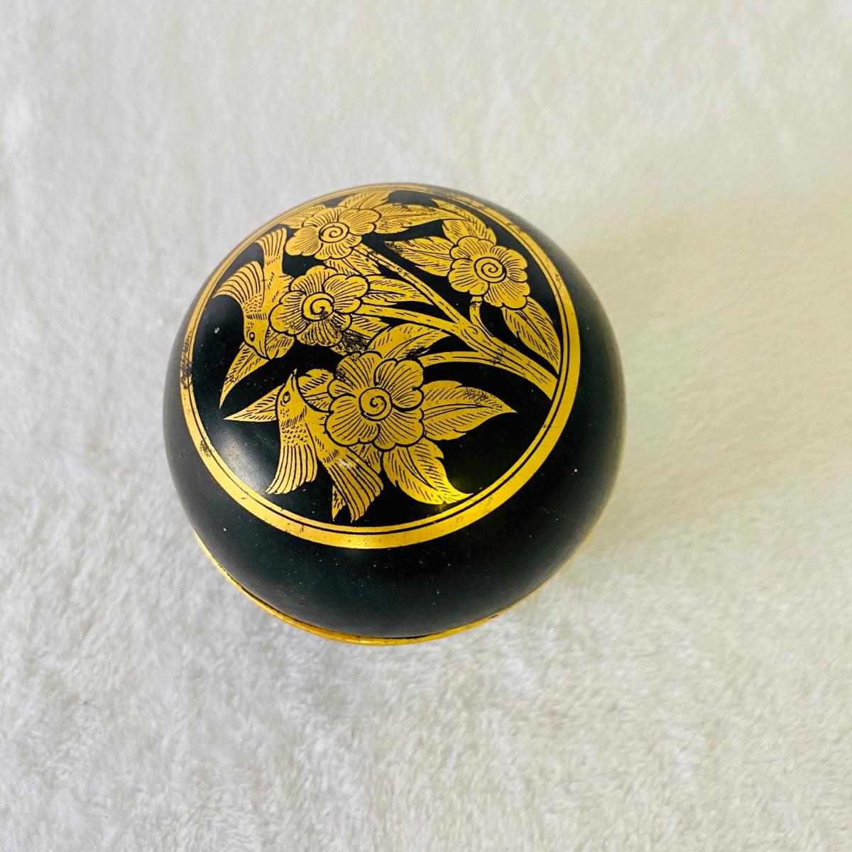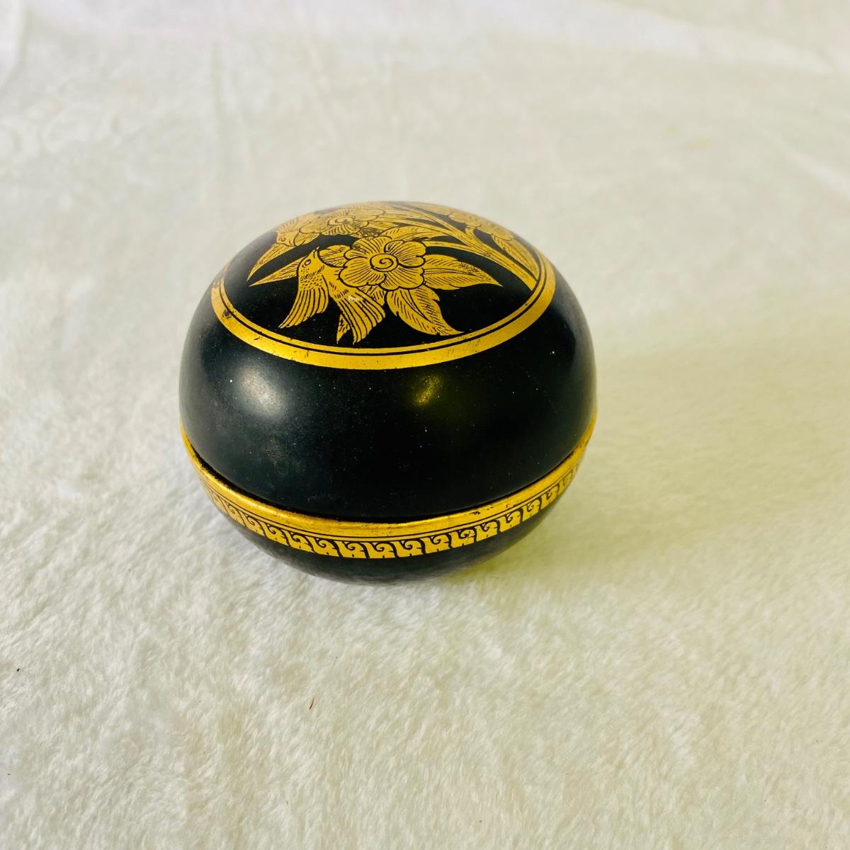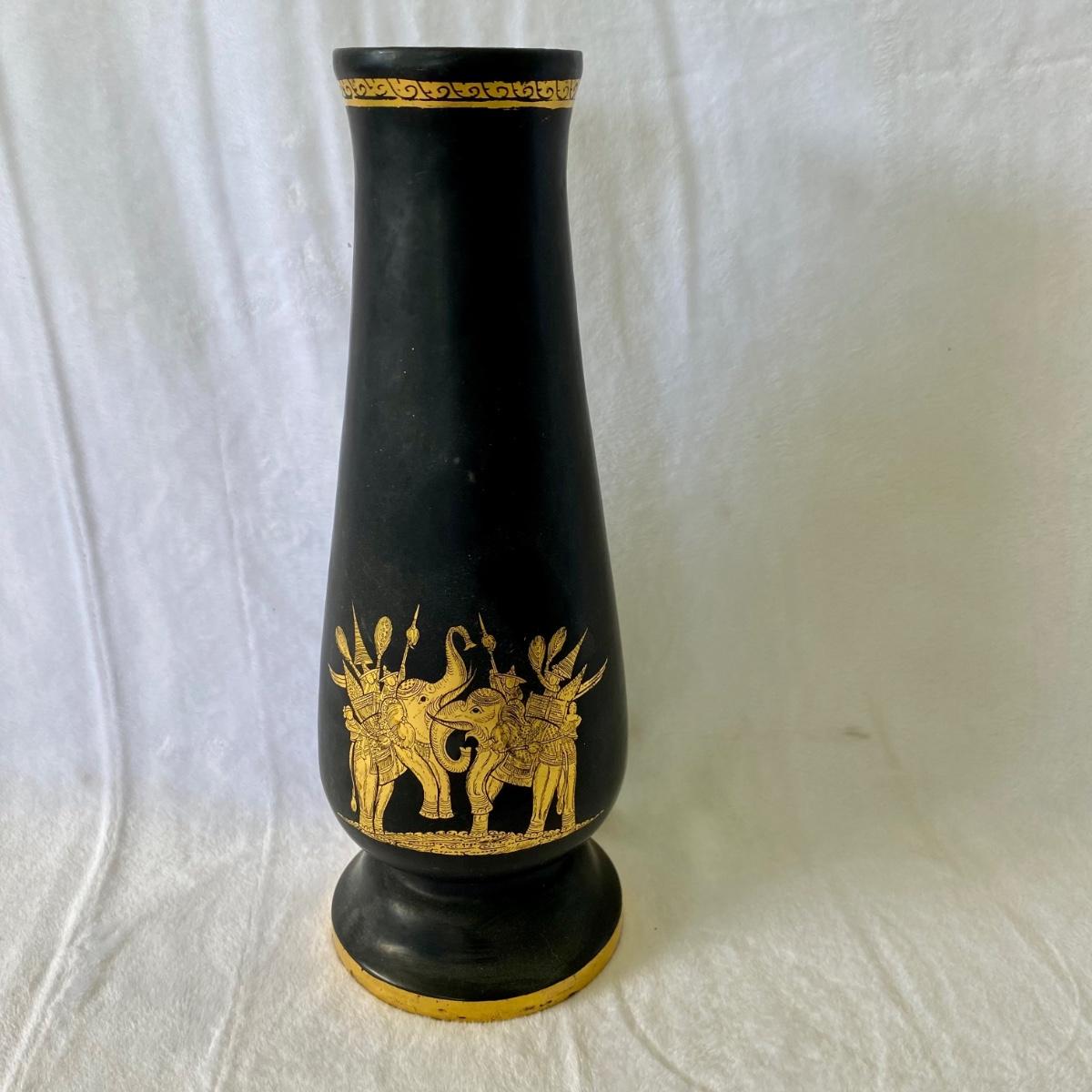 Thai style gold and black lacquer plates, vases, and small box. Tallest vase is 10”H. Plates are 6”D. Small box measures 3”D.