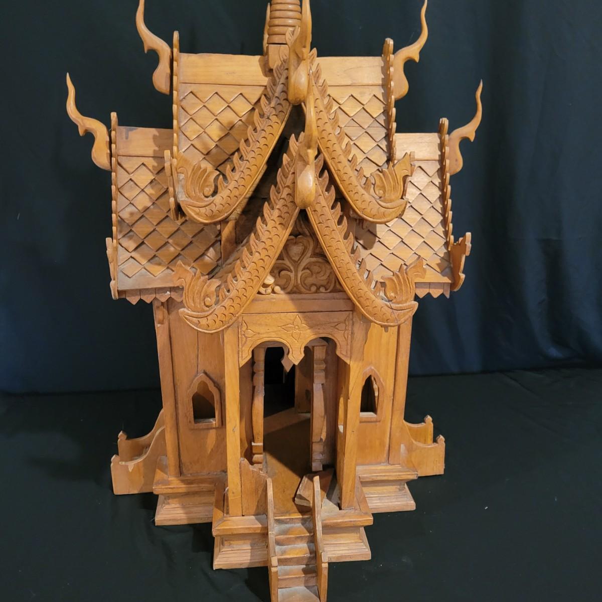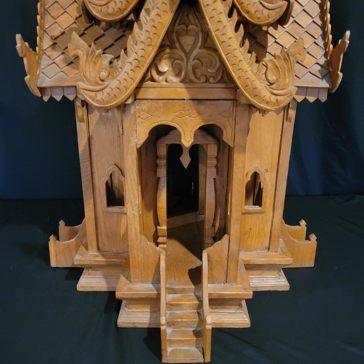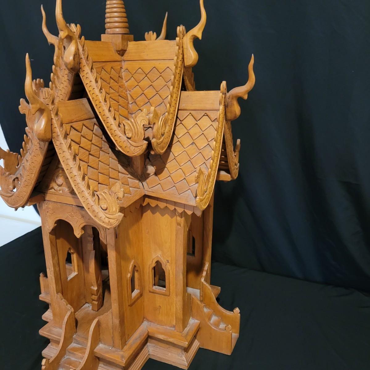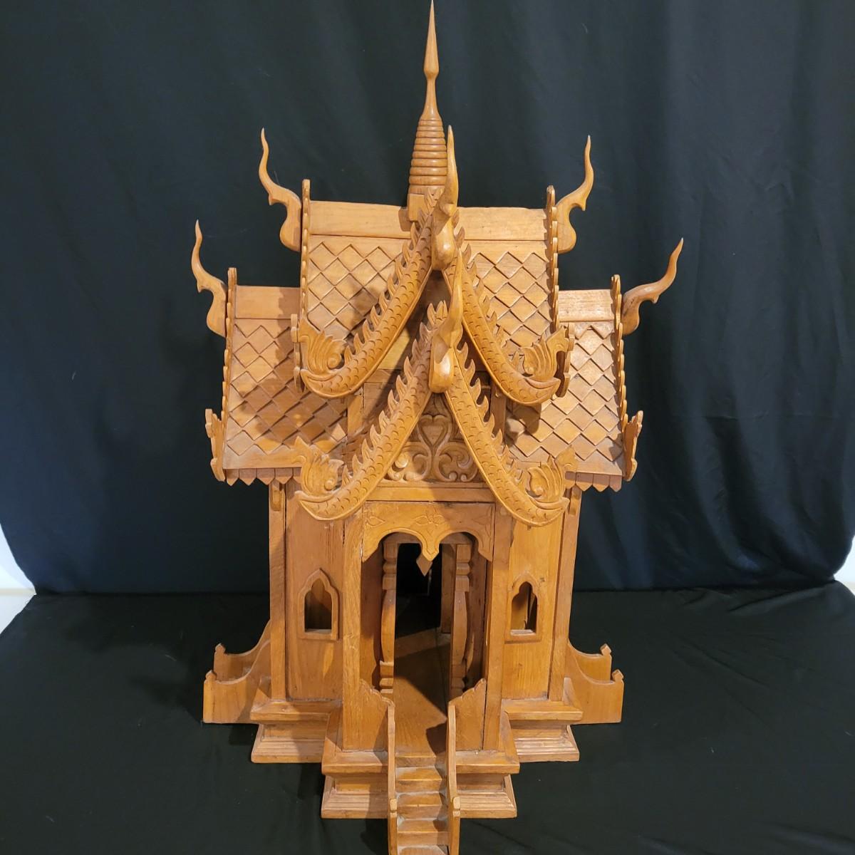 This item appears to be a Thai spirit house that is made of solid wood. It has a high level of detail carved into it and measures approximately 22" x 22" x 36"H. There are two broken pieces next to stairs that could easily be repaired.
