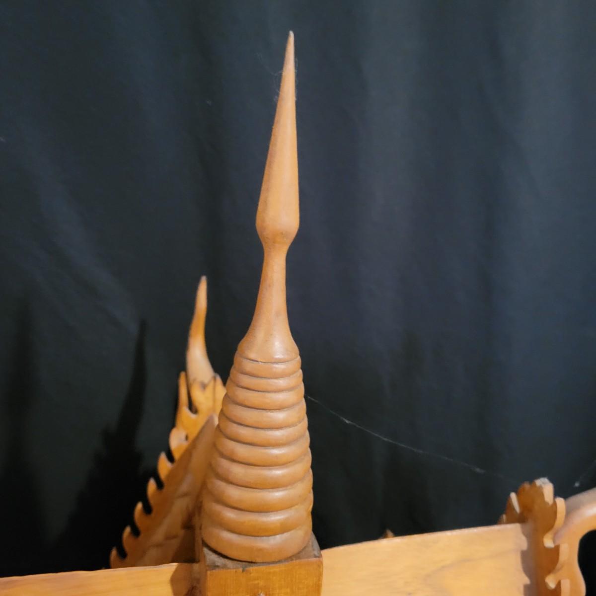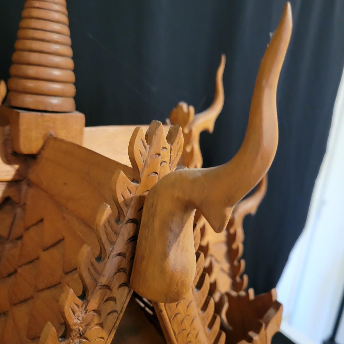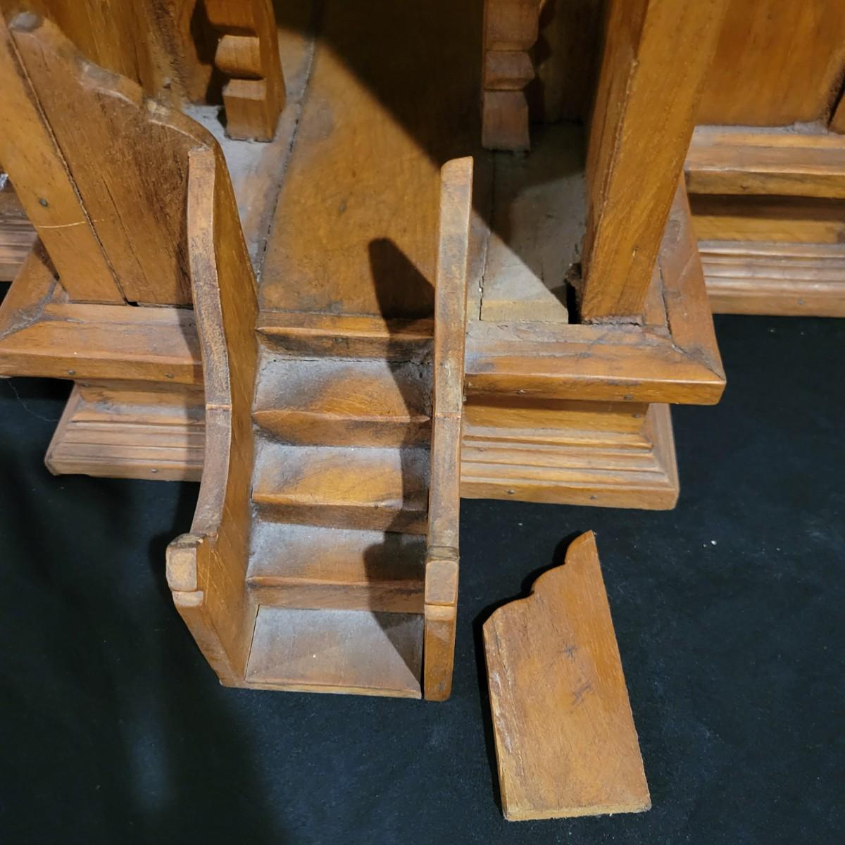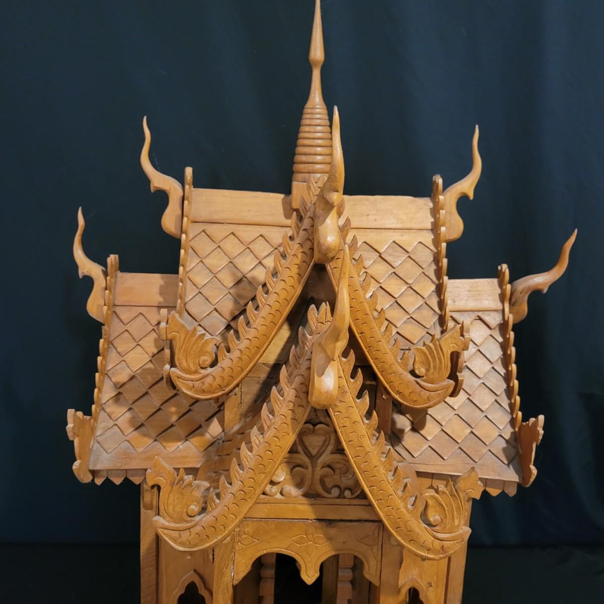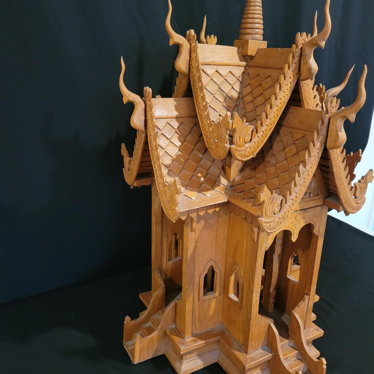 This item appears to be a Thai spirit house that is made of solid wood. It has a high level of detail carved into it and measures approximately 22" x 22" x 36"H. There are two broken pieces next to stairs that could easily be repaired.