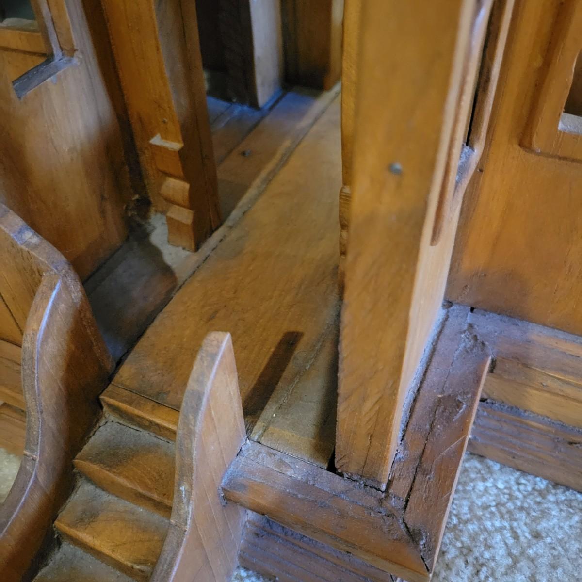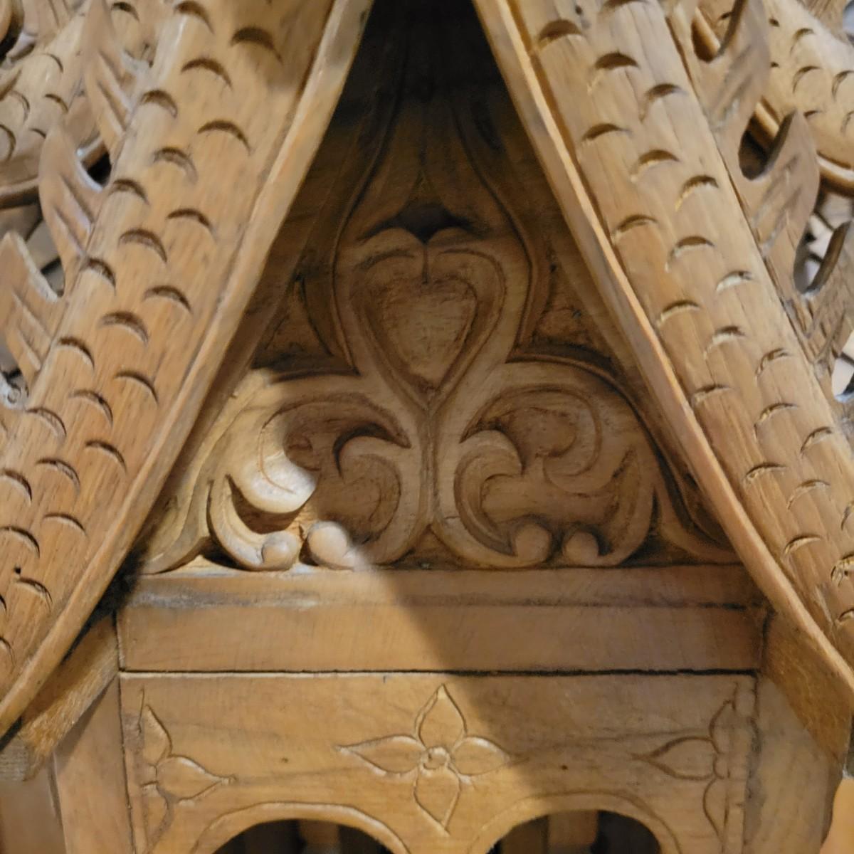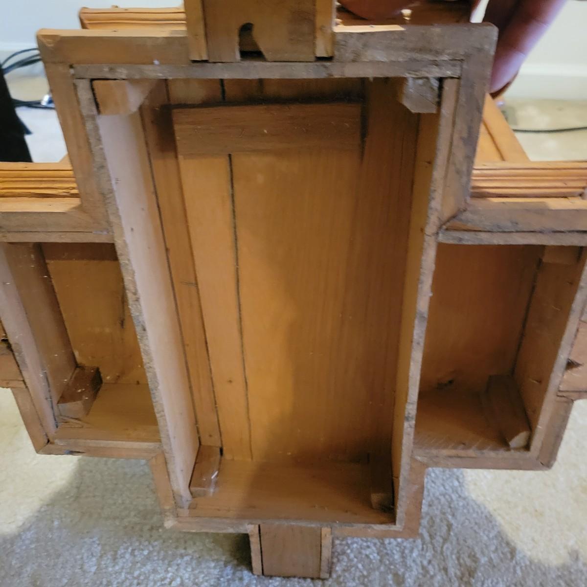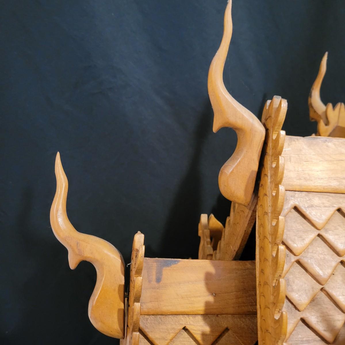 This item appears to be a Thai spirit house that is made of solid wood. It has a high level of detail carved into it and measures approximately 22" x 22" x 36"H. There are two broken pieces next to stairs that could easily be repaired.