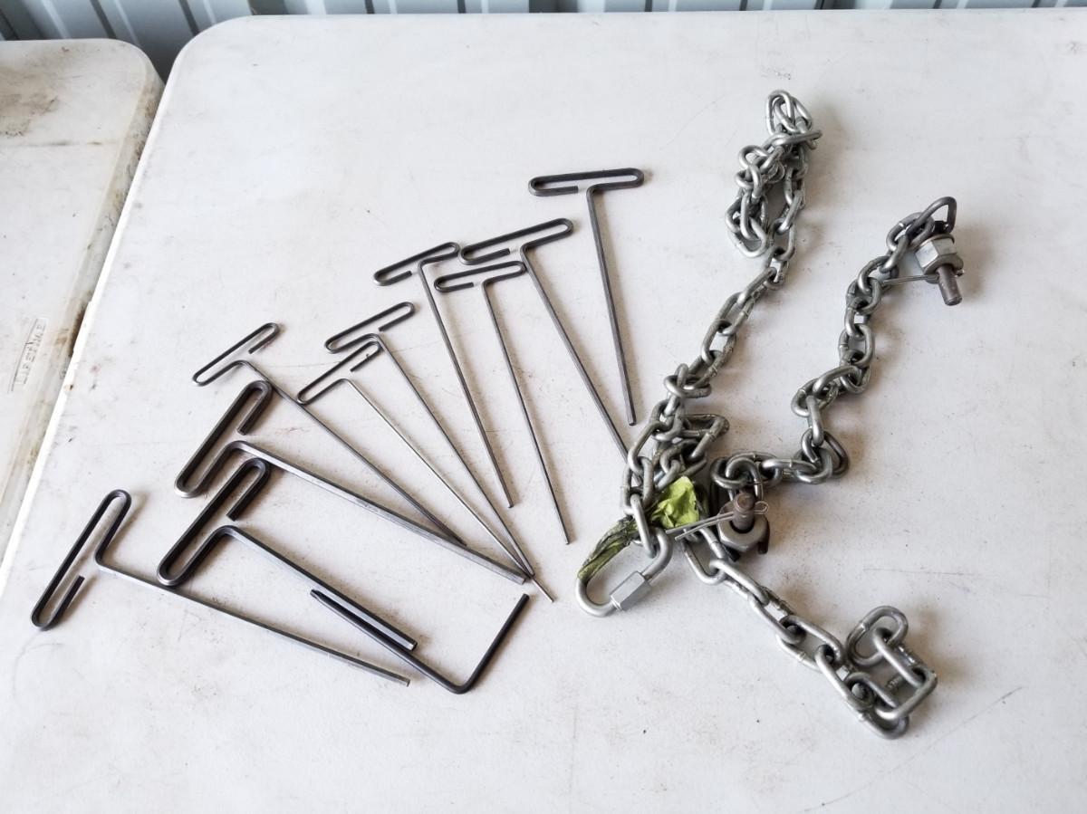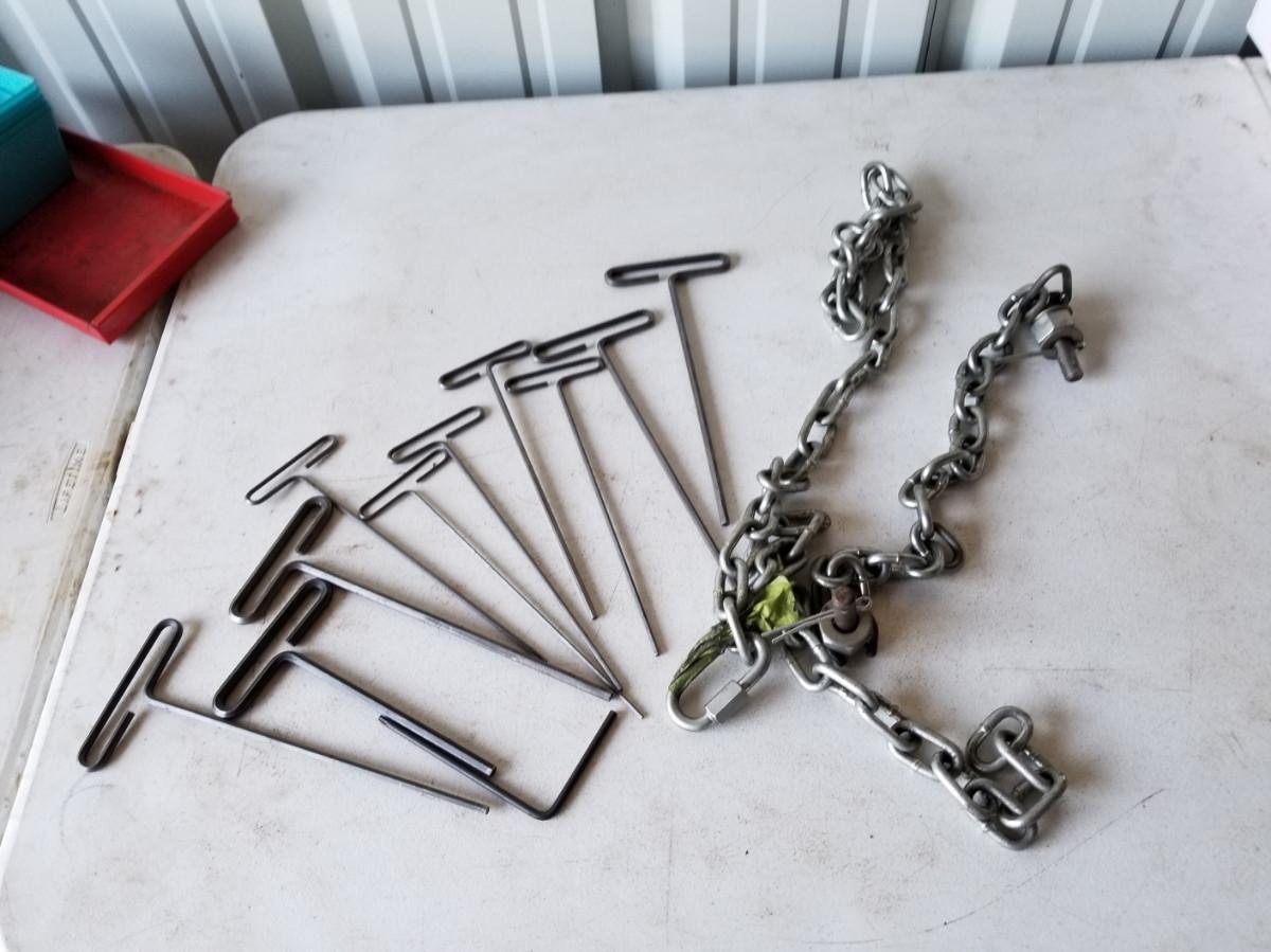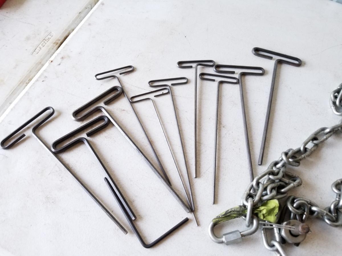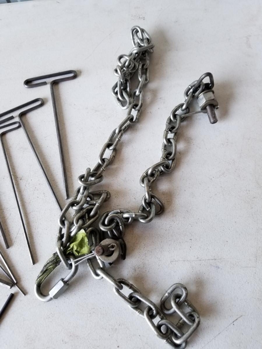 Eklind T-Handle allen wrenches, quantity 1 each: 3/32", 9/64", 5/36", 7/32", all 10" long. Quantity 2 each: 1/8", 3/16", 1/4", all 10" long. 1 wrench at 1/4", 7 inches long. Chains are 18" and 54" and still have some hardware on them.