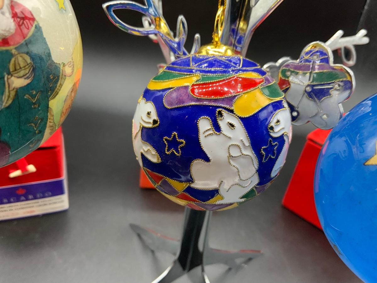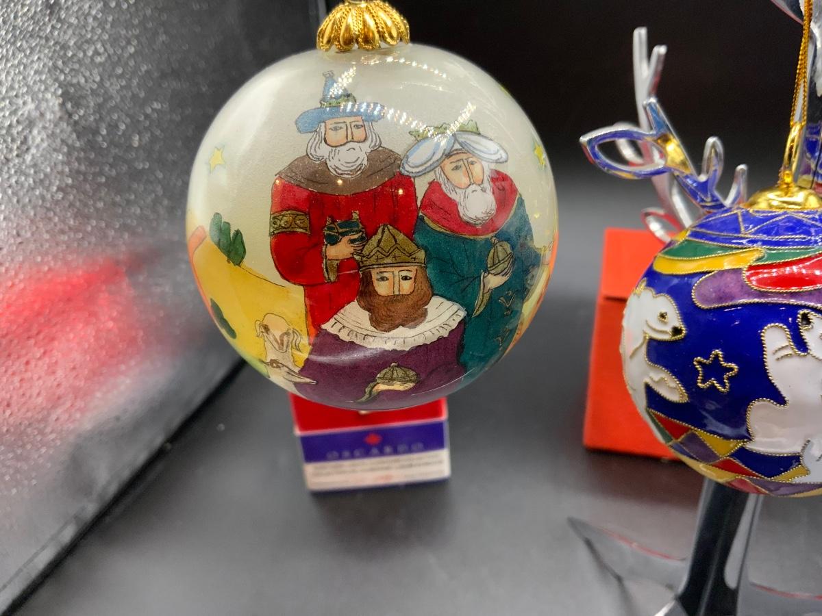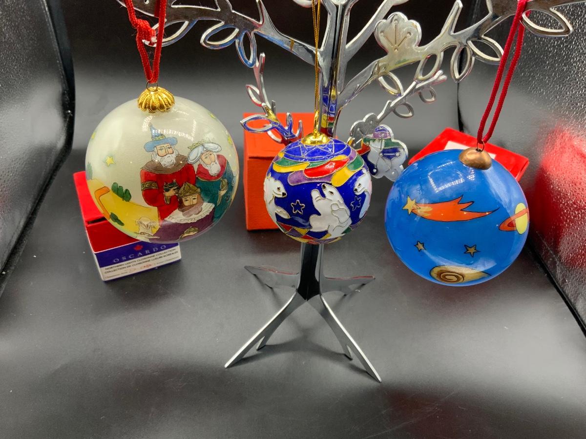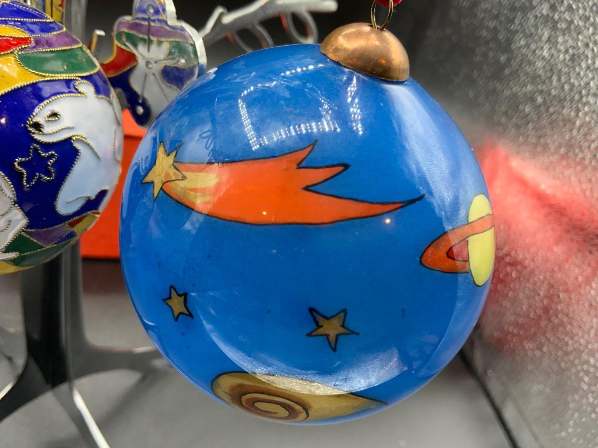 1 cloisonné featuring polar bears, 2 reverse painted glass balls featuring 3 wise men and fantastic planets/stars. Each have their own storage/gift box!