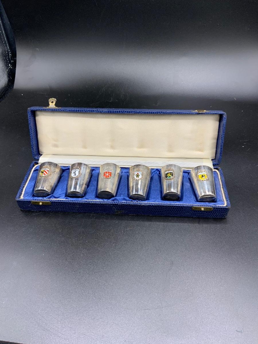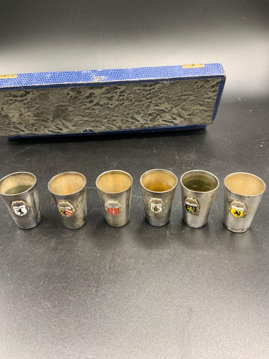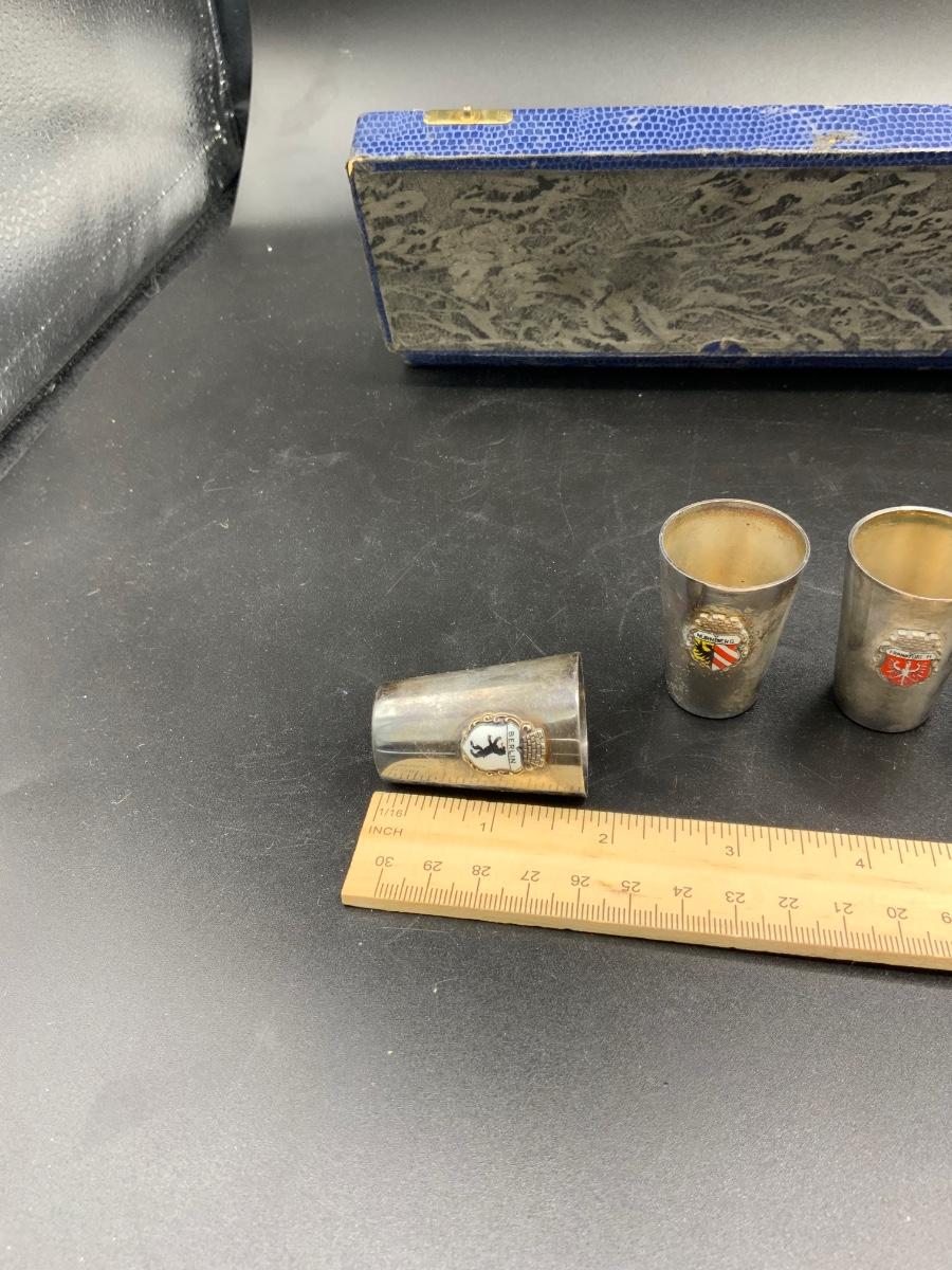 Lot Of 6 German Silverplate Shot Glasses Glass Mini With Crest Flags With Box