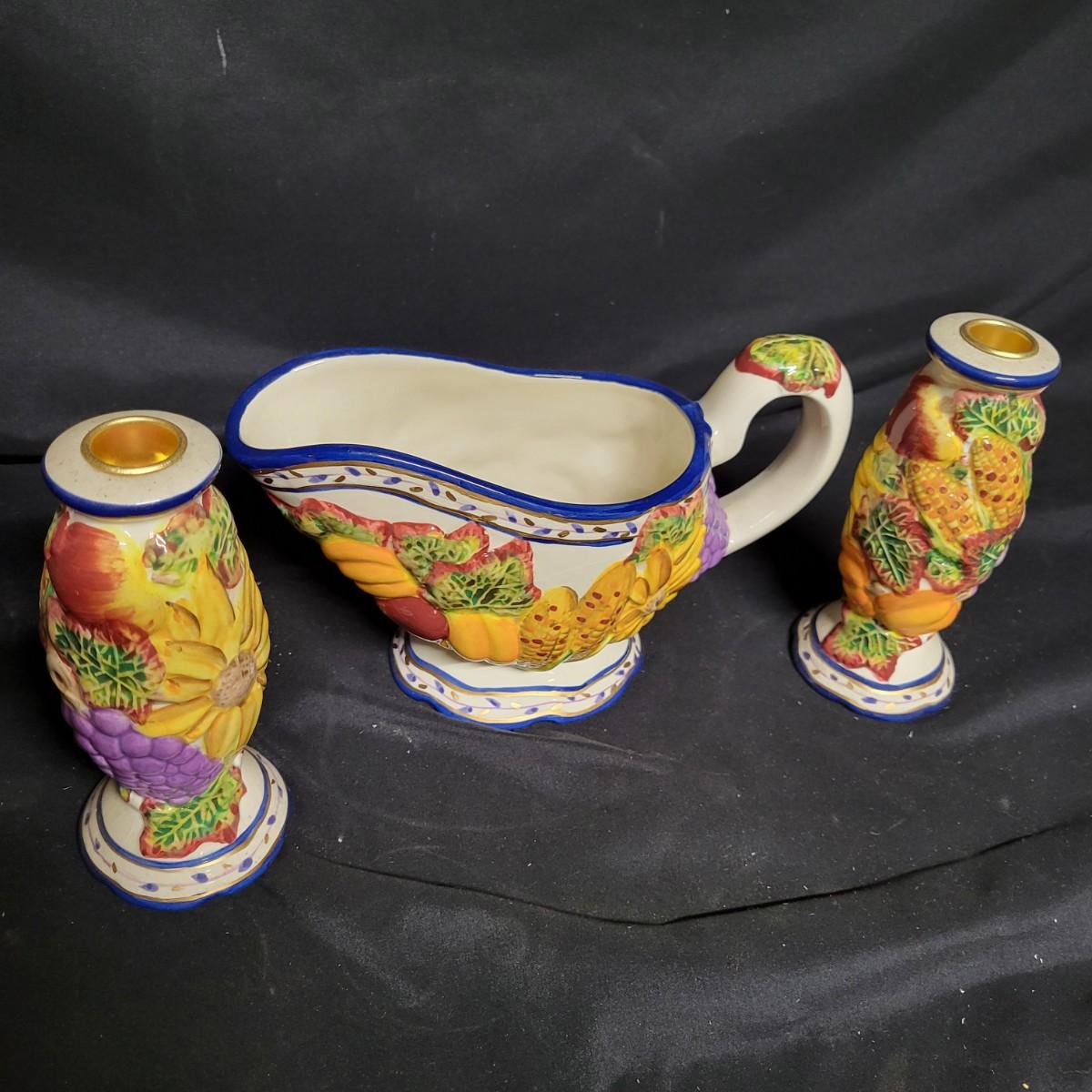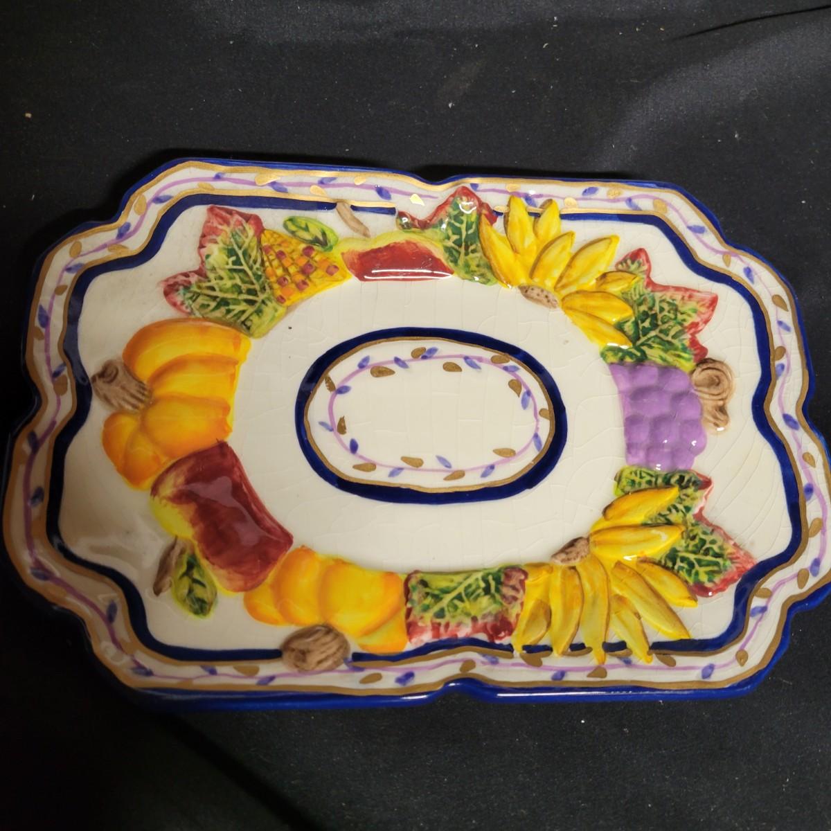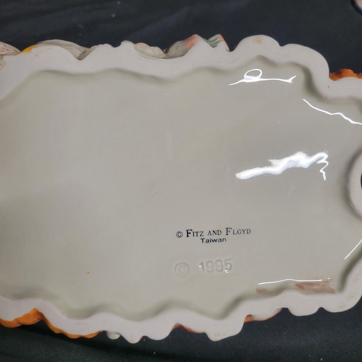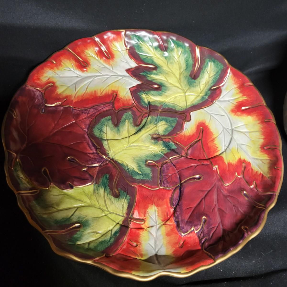 An assortment of Thanksgiving decor that includes over a dozen pieces. All items are ceramic, including one Fitz and Floyd piece. The large leaf platter measures approximately 13"D x 1.5"H. Shipping available