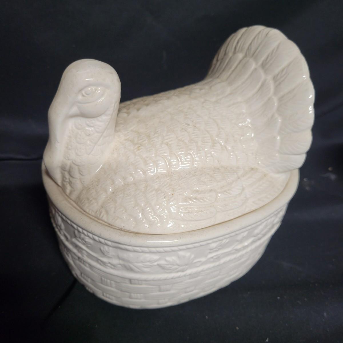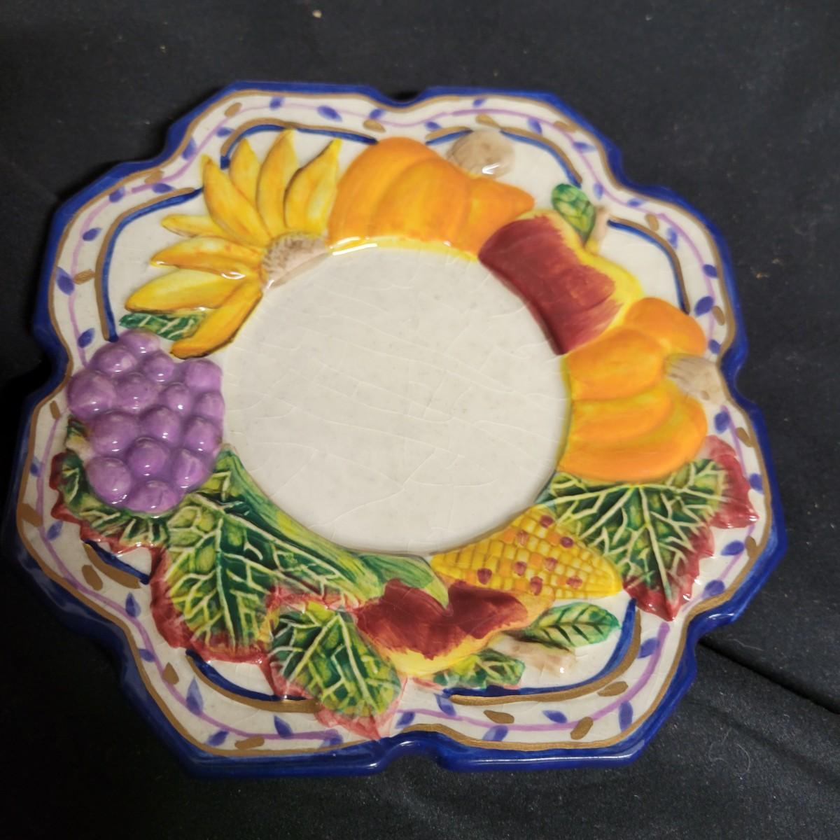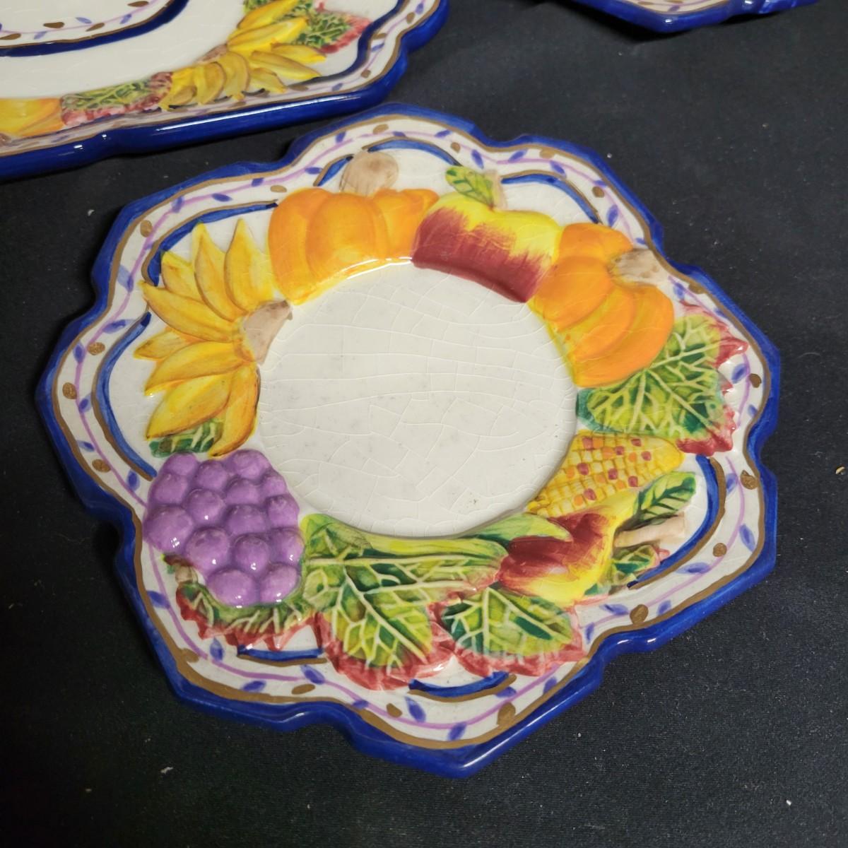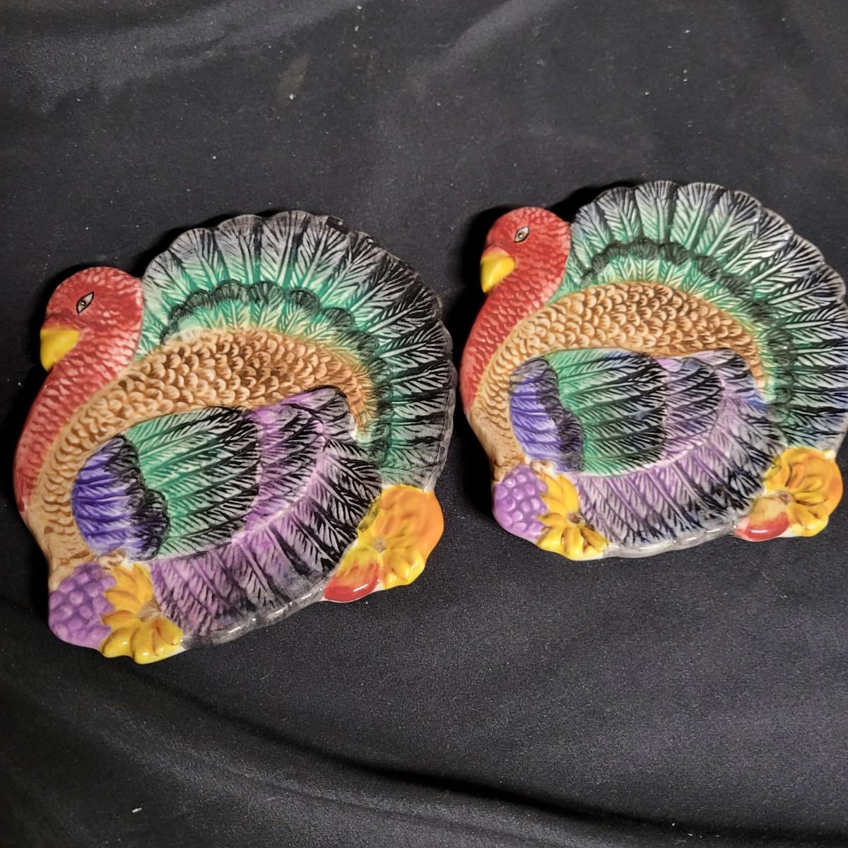 An assortment of Thanksgiving decor that includes over a dozen pieces. All items are ceramic, including one Fitz and Floyd piece. The large leaf platter measures approximately 13"D x 1.5"H. Shipping available