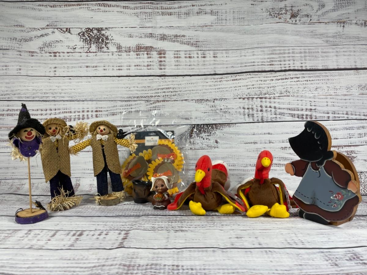 This Bundle includes: Two turkey stuffed animals, a book holder, turkey stickers, three scarecrow figurines, a salt shaker, and a cat on a boot figure. All are in a used condition. Salt shaker has a little bit of salt in it.