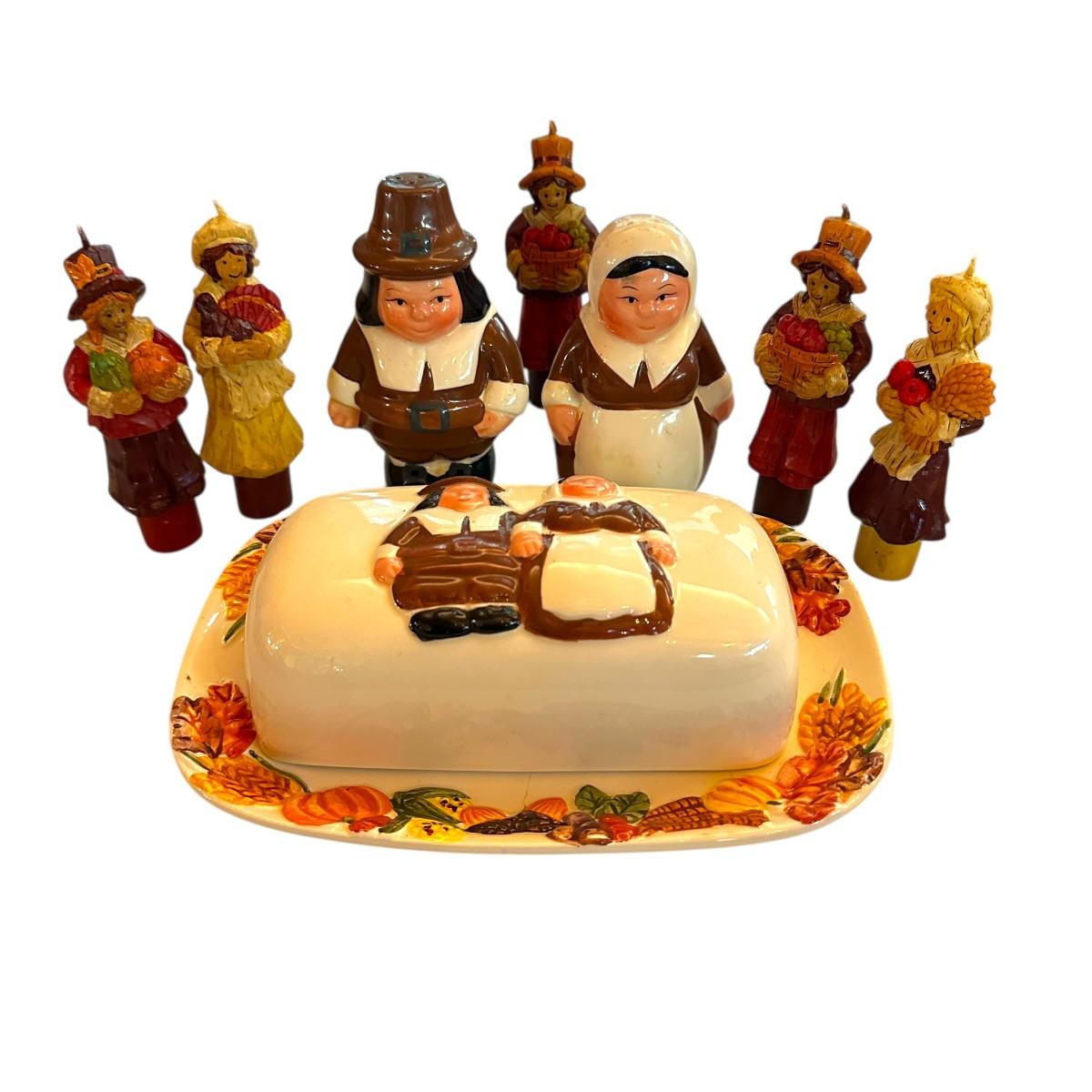 Thanksgiving Pilgrims Table Decor with Butter Dish & Salt/Pepper Shakers