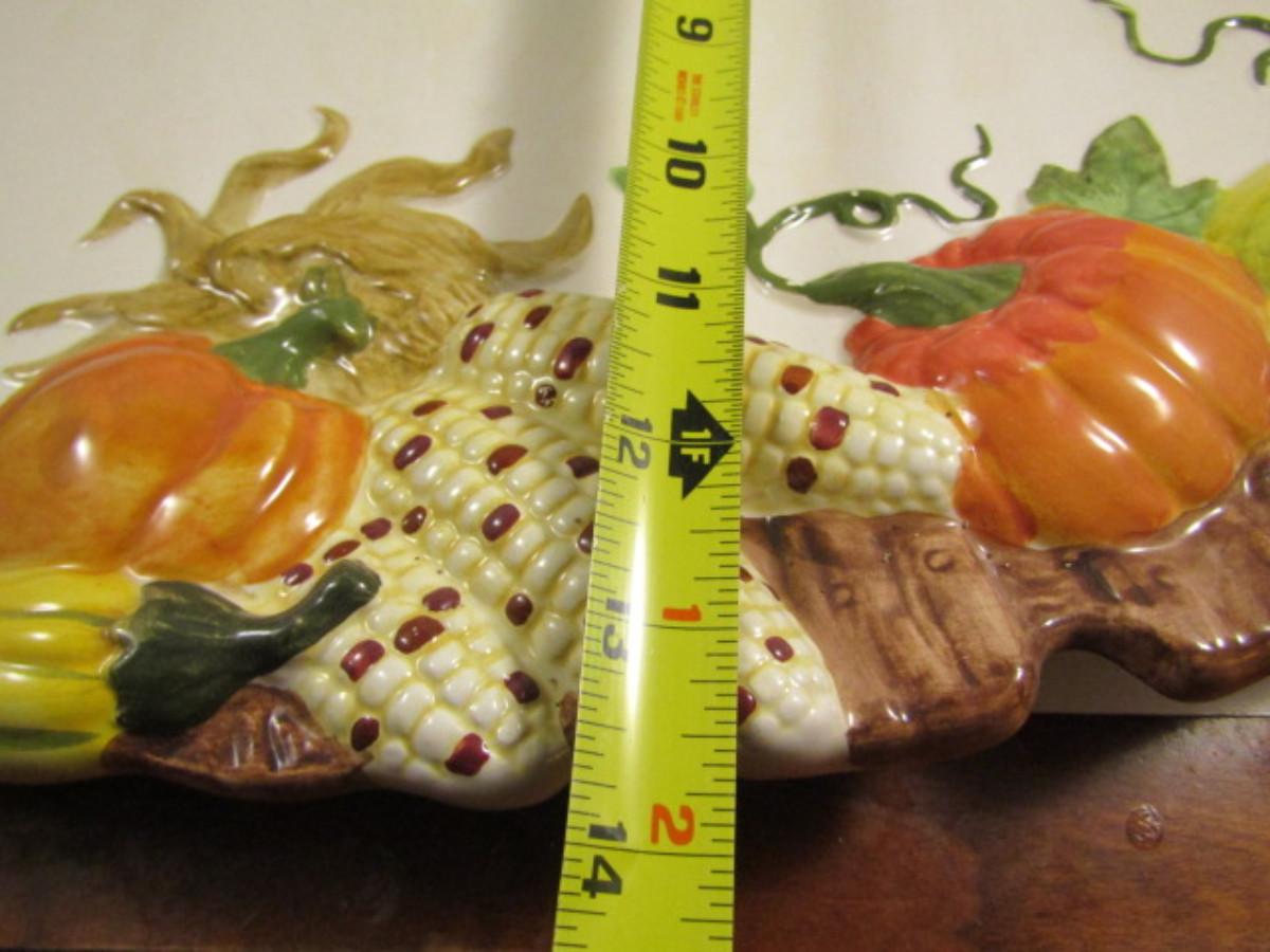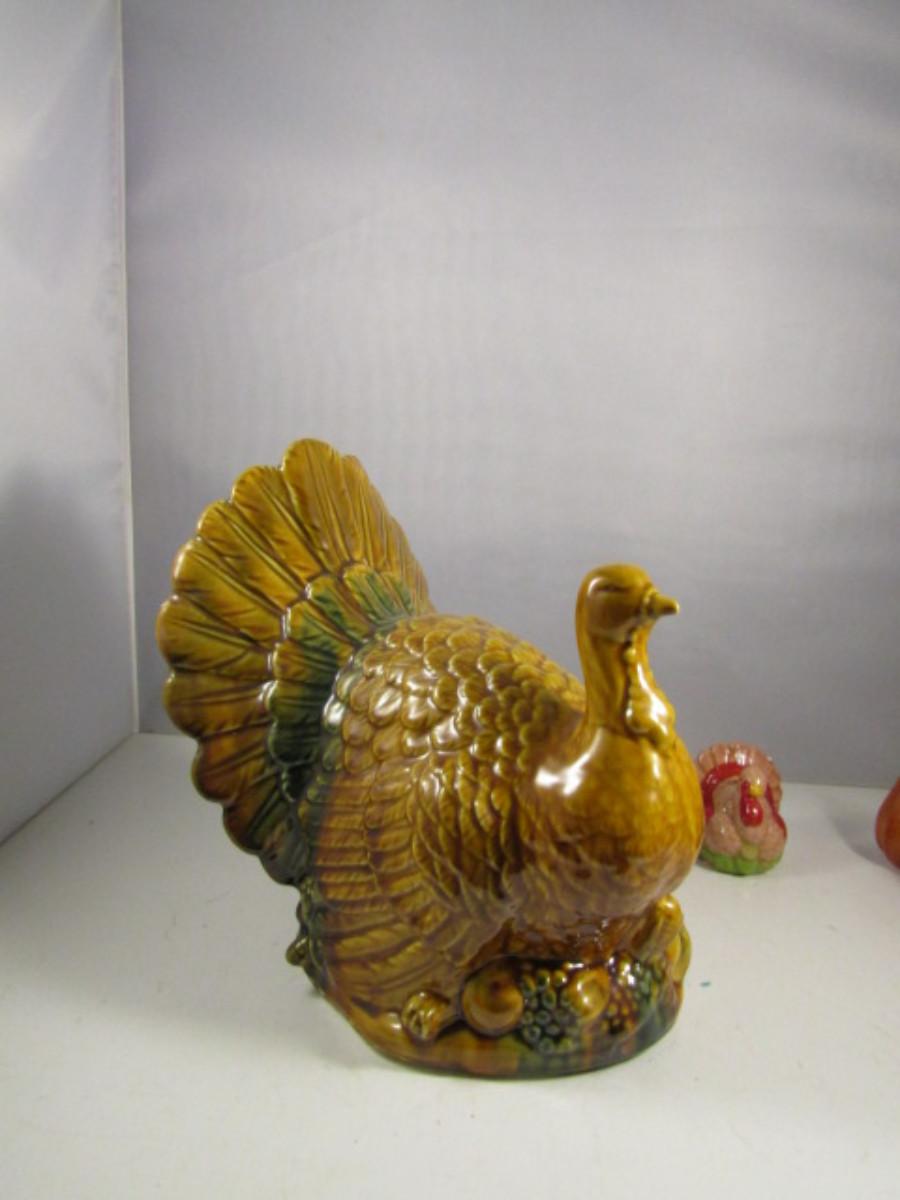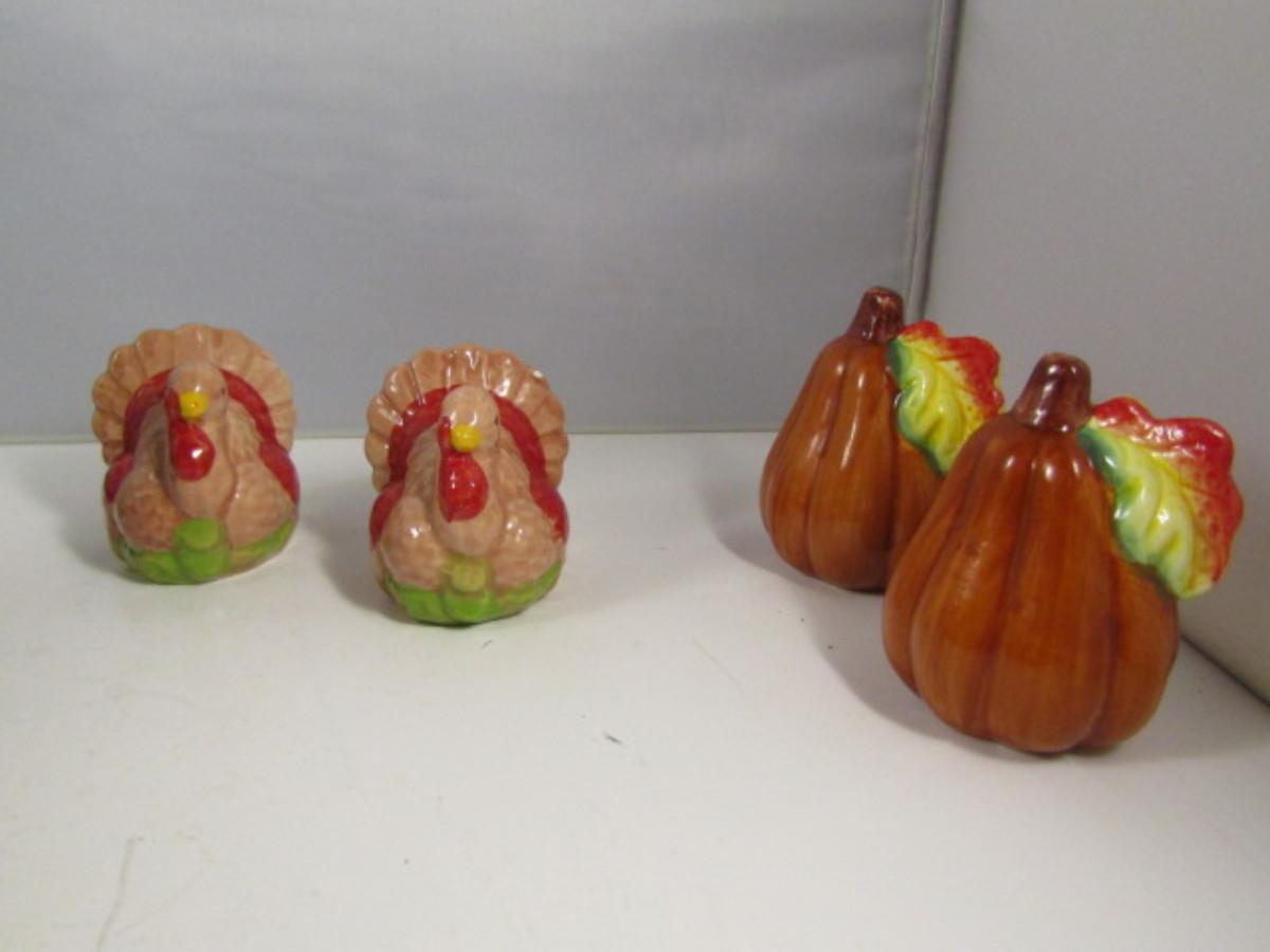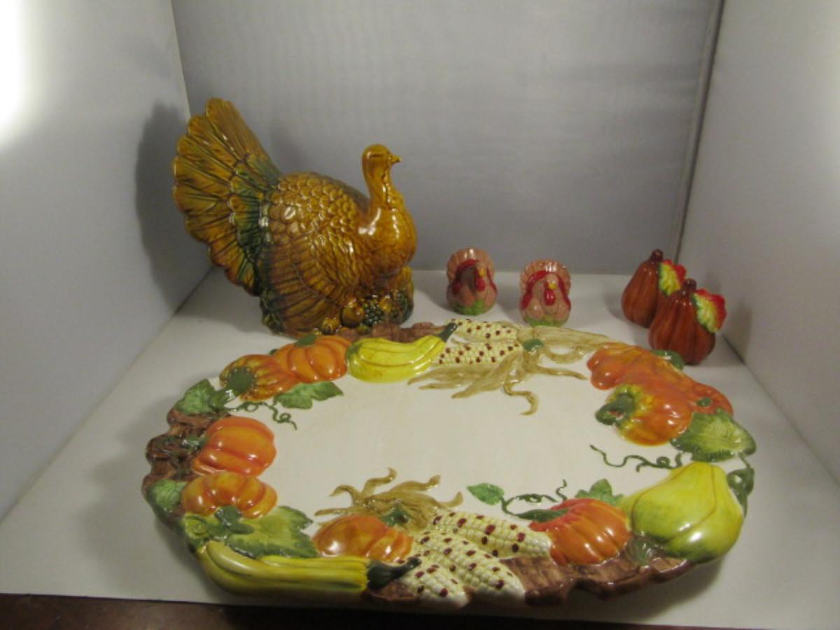 Thanksgiving Table Accessories. Serving platter, salt and pepper shakers, and decorative turkey.