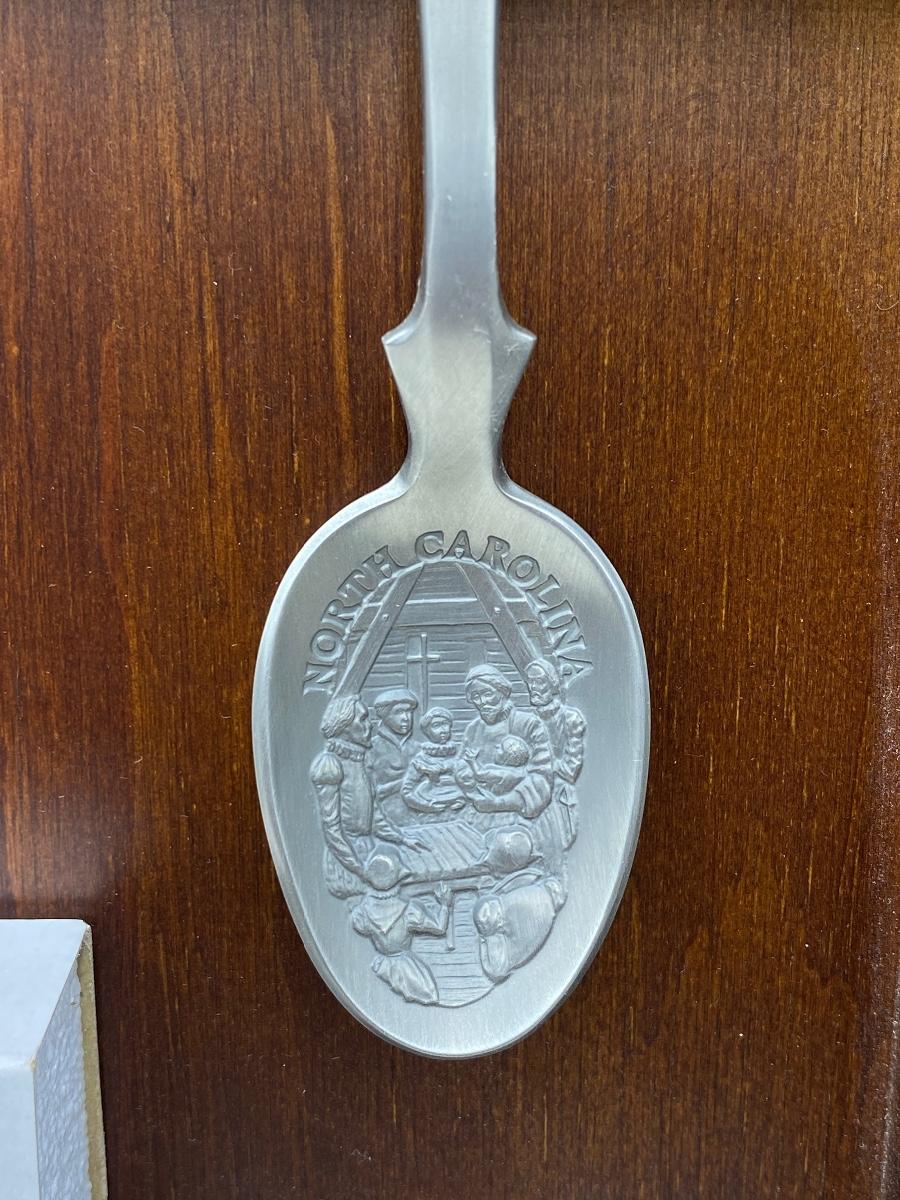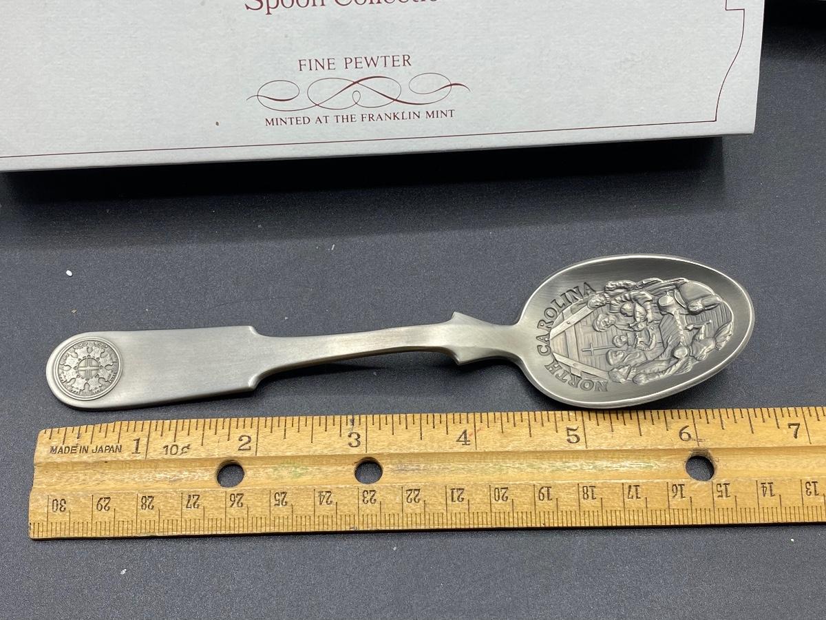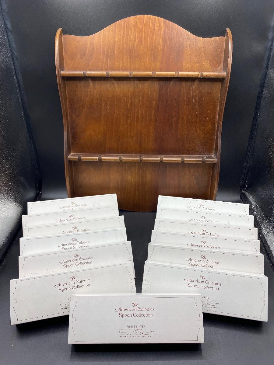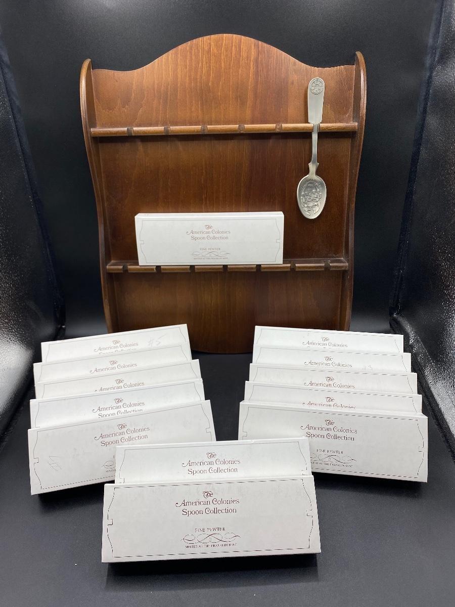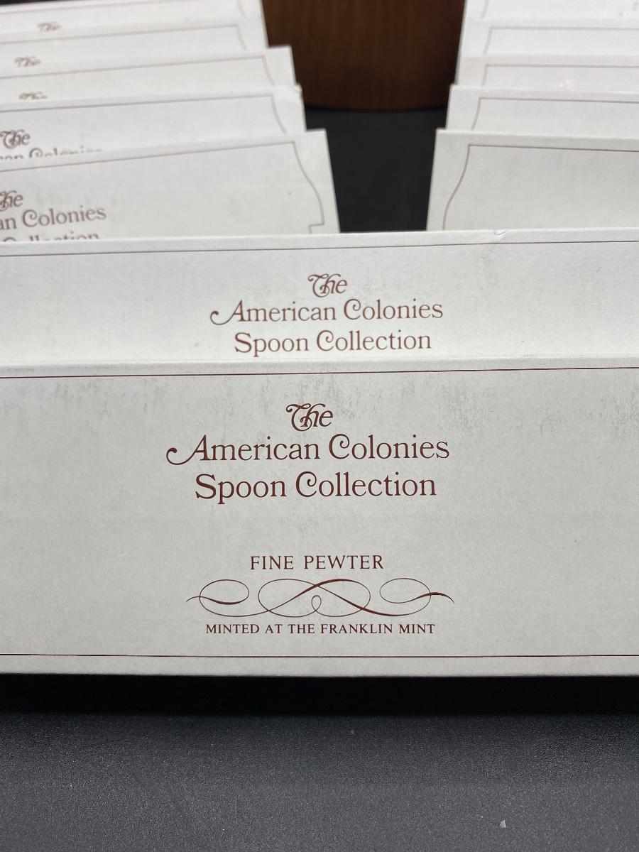 The American Colonies pewter spoon collection with wall display. Released by the Franklin Mint. Comes with 13 different pewter spoons representing the 13 original colonies. Each one comes in original box.