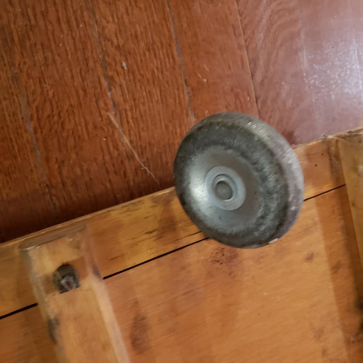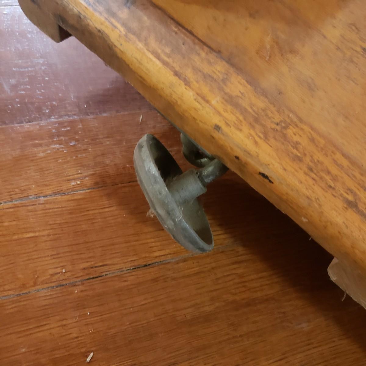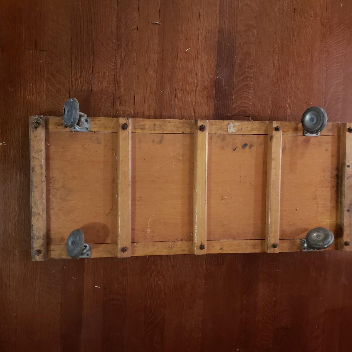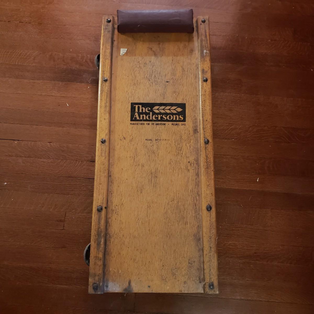 This is a The Andersons wooden mechanics creeper that measures 15" x 36" x 4"H. The pillow material feels like a durable vinyl and appears to not have any cracks. The wheels are all metal and swivel. See picture for model number.