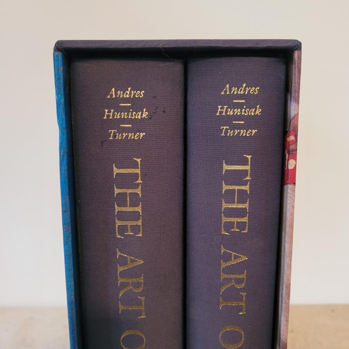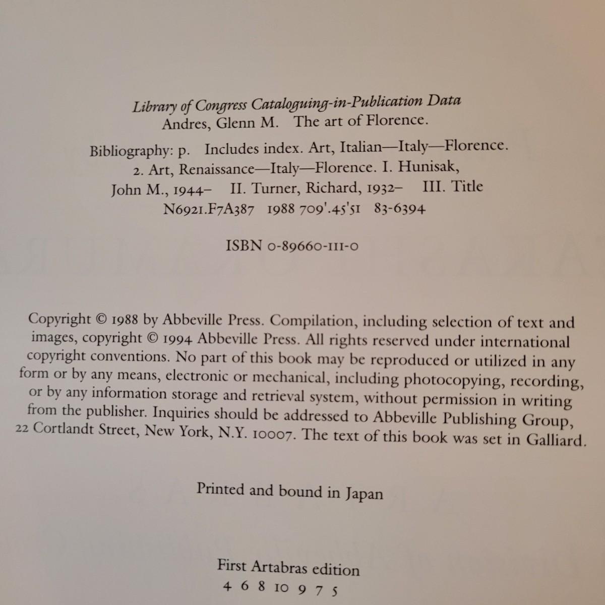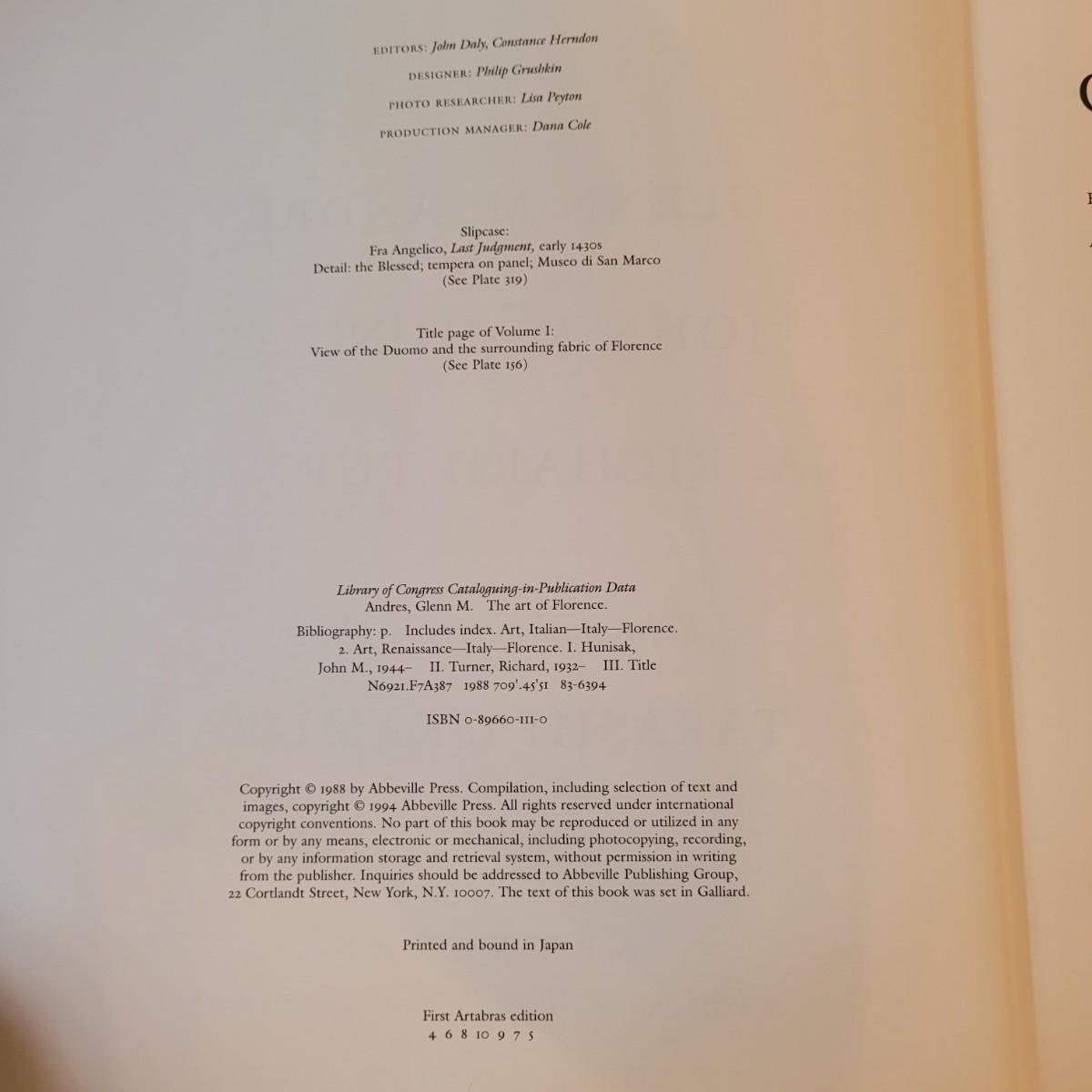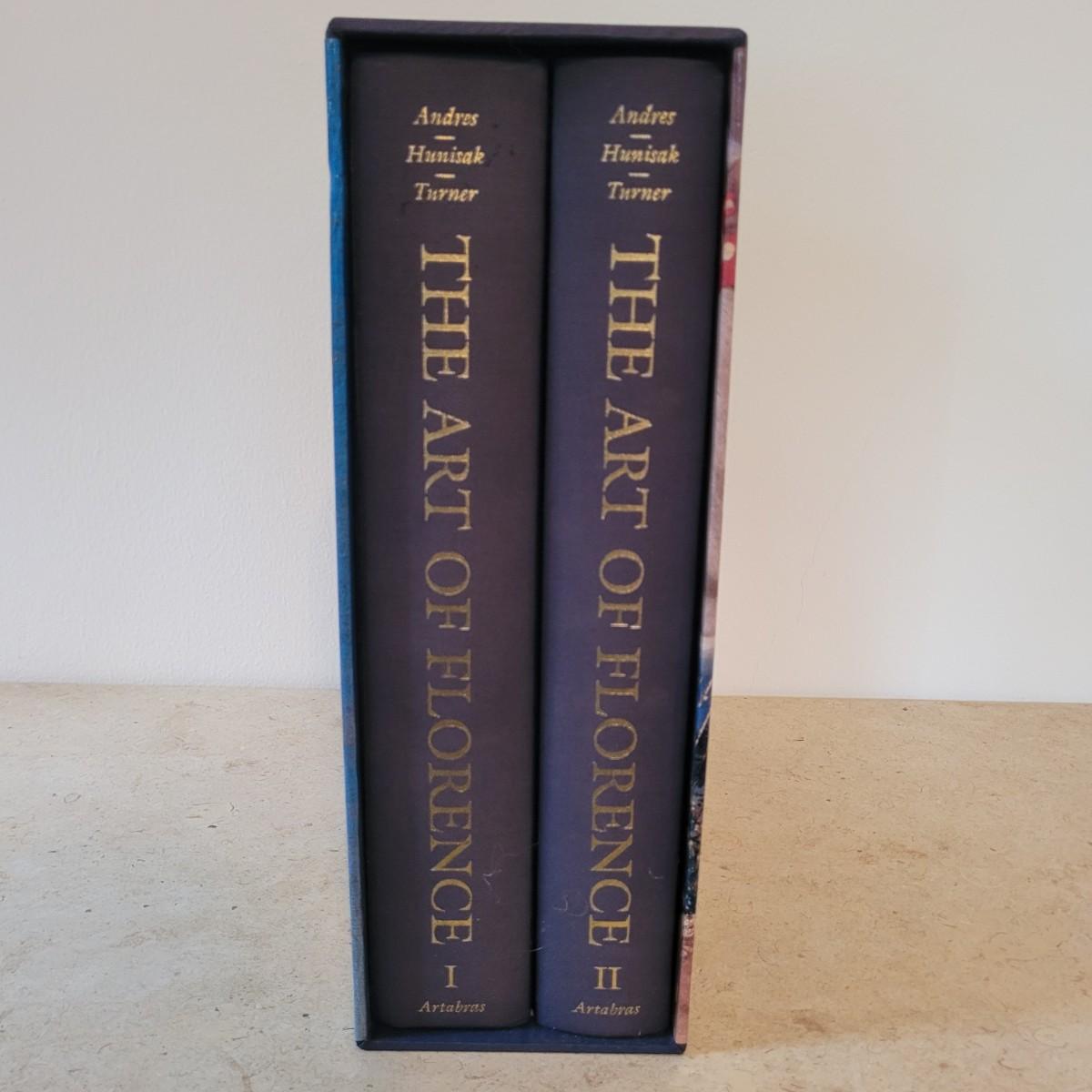 This lot includes a collection of hardback books on the art of Florence Italy. There are two hardback books and a decorative cardboard case for storage. Produced by Richard Turner, Glenn M. Andres, John Hunisak. The two volumes include over 1300 pages pertaining to the artwork of Florence. Copyright dates are 1988 and 1994 by Abbeville Press. This lot is in good condition showing no serious signs of damage.