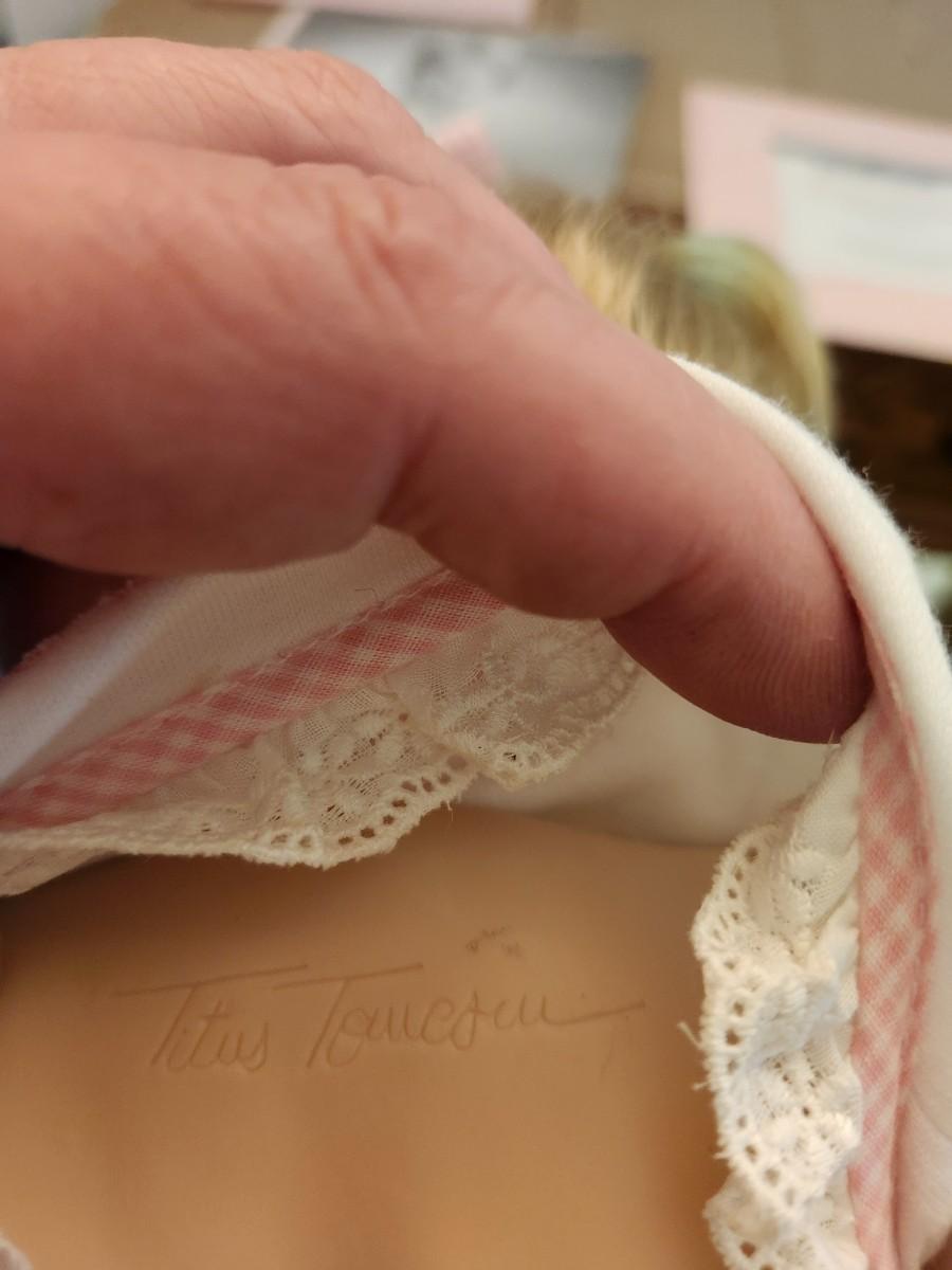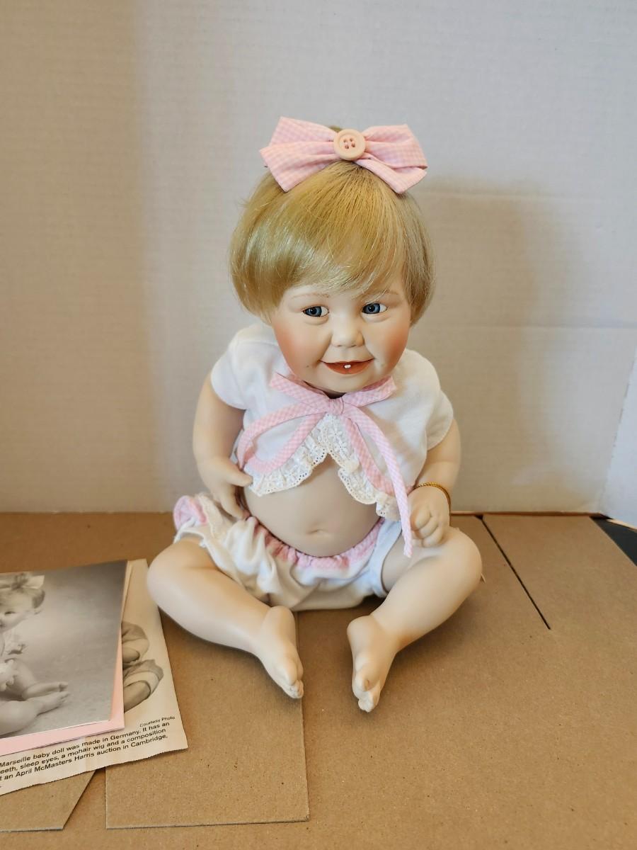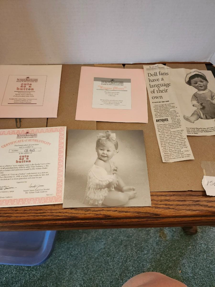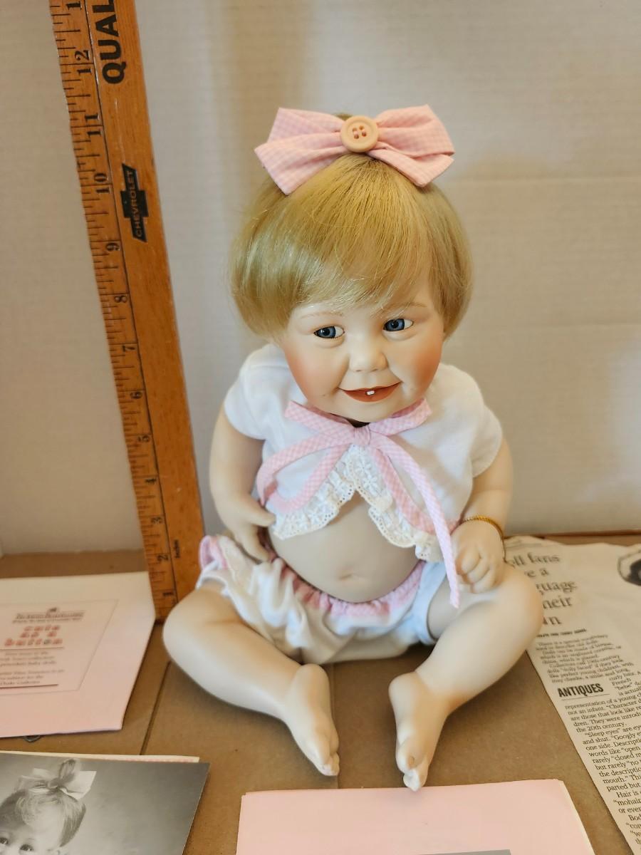 Vintage doll, 1993 by artist Titus Tomescu, Ashton-Drake Galleries. "Cute as a Button" original issue in the Barely Yours collection. 12" (sitting) porcelain baby girl doll, includes: the outfit she's wearing, and a pink button bow in her blonde hair Missing certificate, box and booklet. Fully moveable arms, legs and head. Good condition, no breaks or cracks.