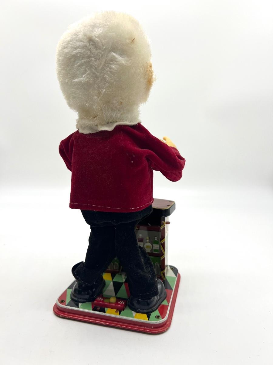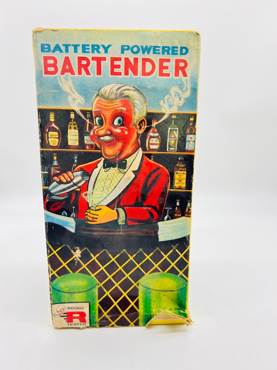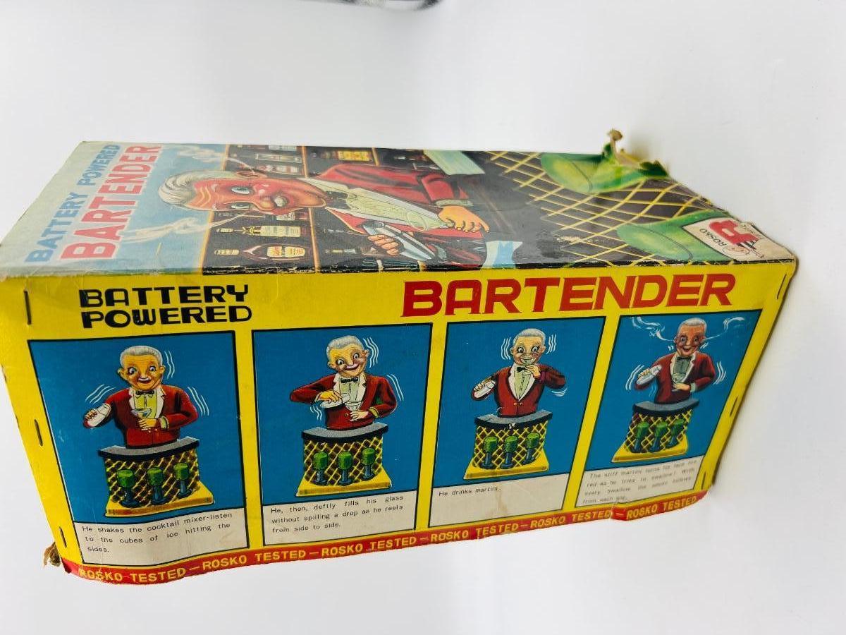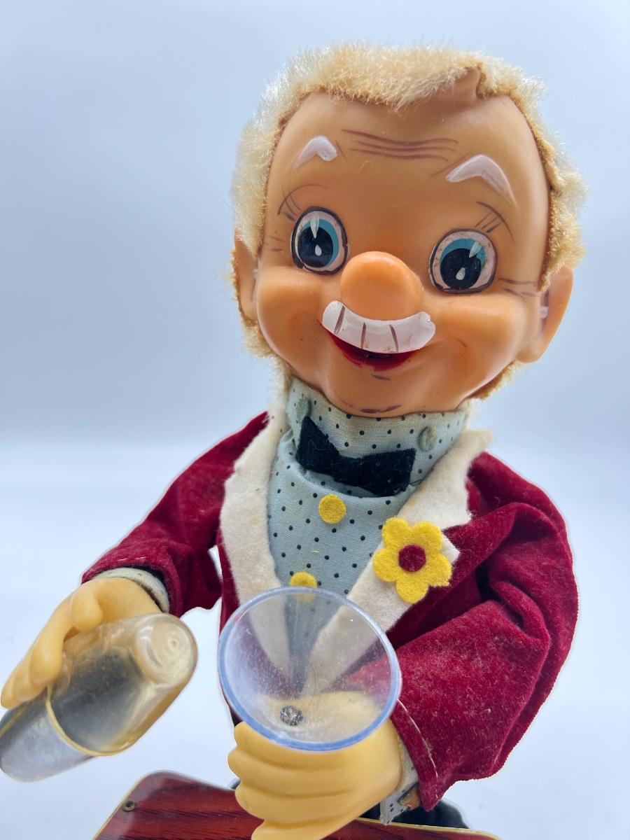 The Bartender Rosko at your service with the original box. He’s not tested. Selling as a conversation piece. Measures 11 inches tall and 5 inches wide. He does have some discoloration on the edges of his hair and on the white part of his suit.